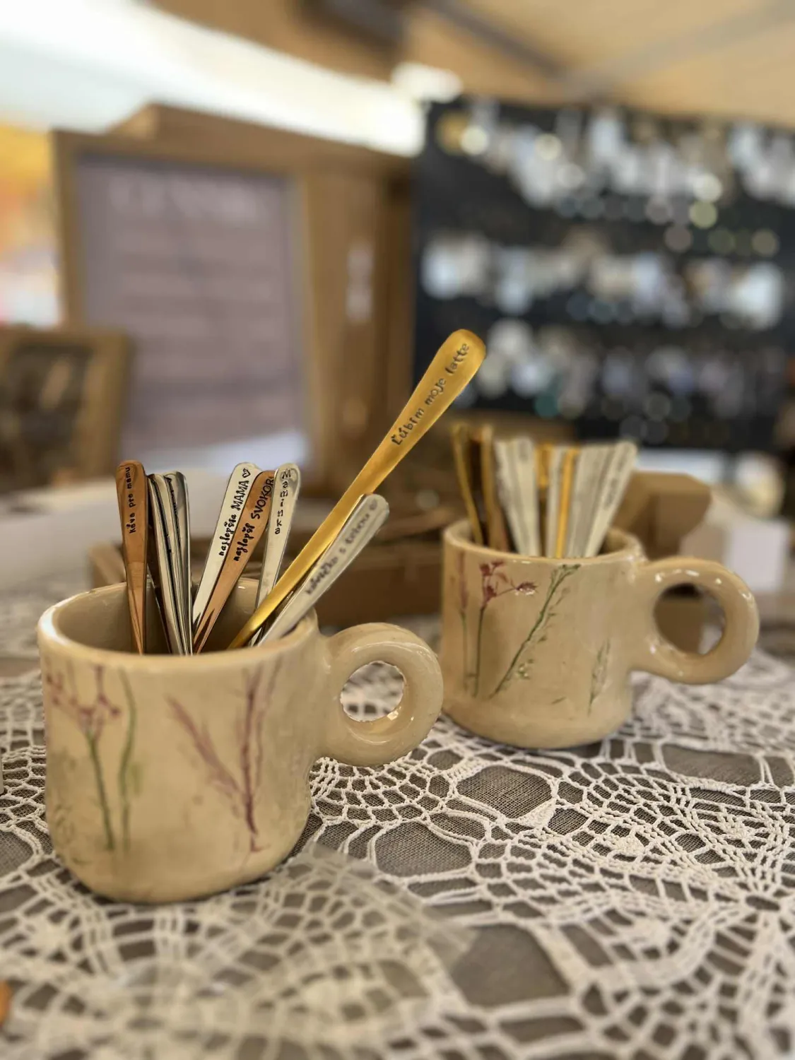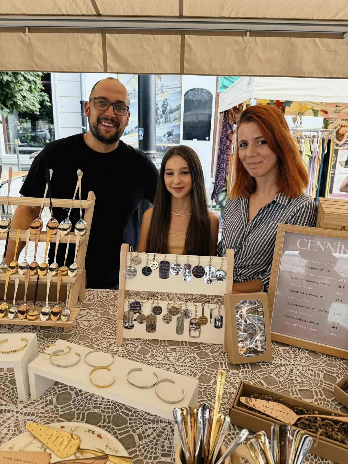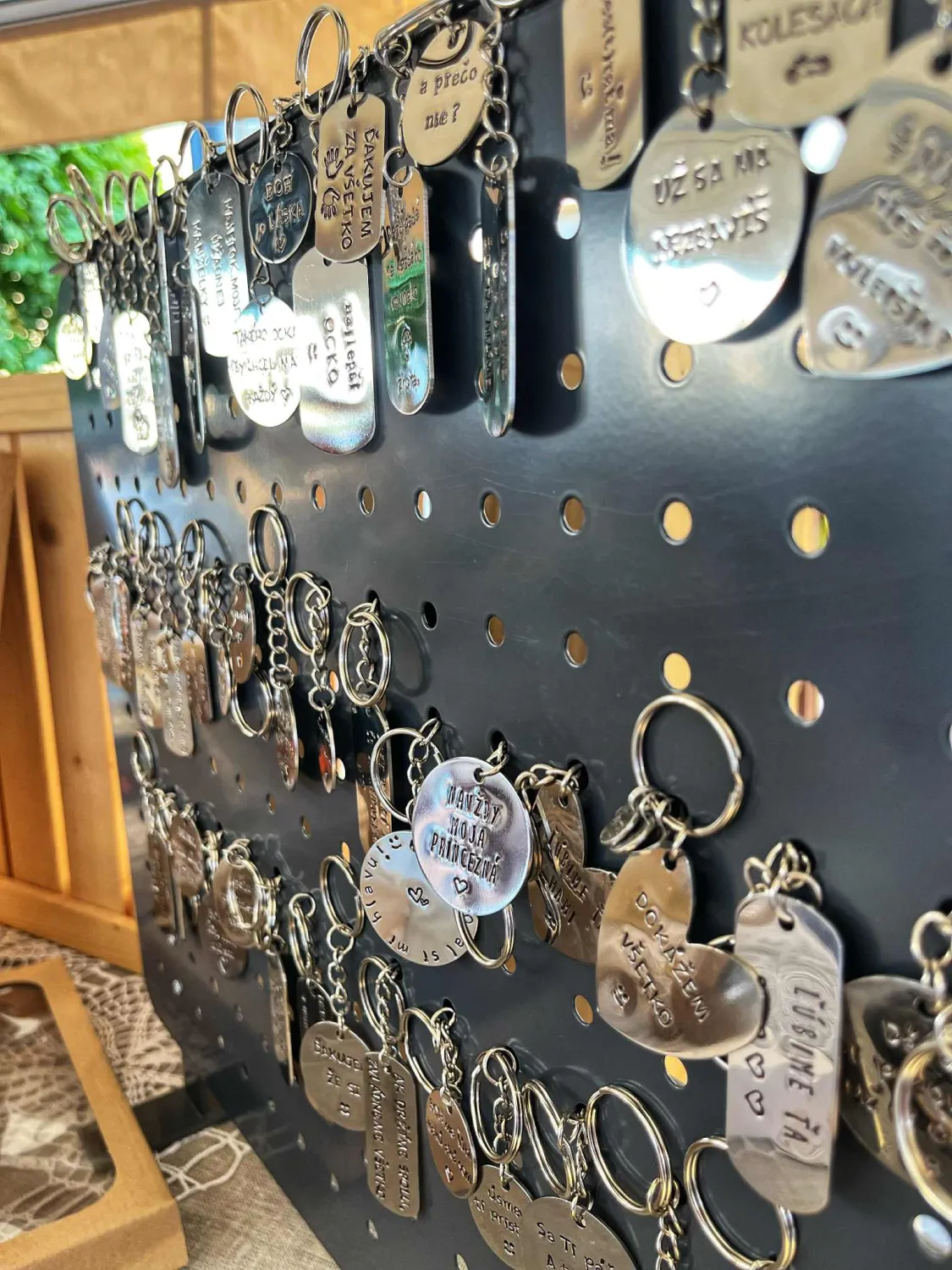 Na našom stánku ste si mohli pozrieť a vyskúšať naše produkty s ručným razením textov – od lyžičiek a príborov, cez náramky a prívesky až po originálne kľúčenky. Každý kúsok je výsledkom starostlivej práce, kde každé písmenko či symbol vtláčame do kovu ručne, s láskou a trpezlivosťou. Dokonca ste si mohli vyskúšať aj to, ako také ručné razenie s raznicami vyzerá.