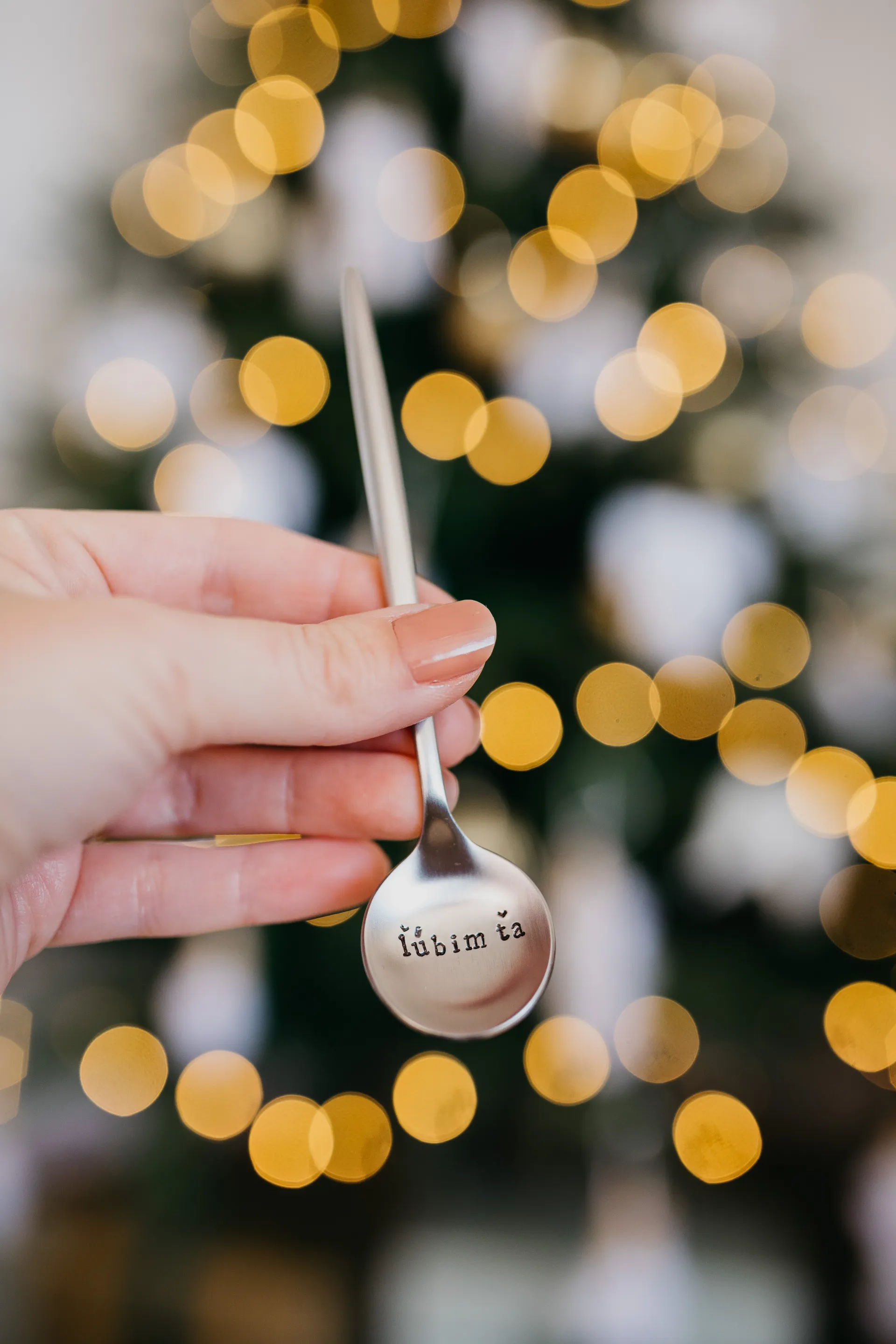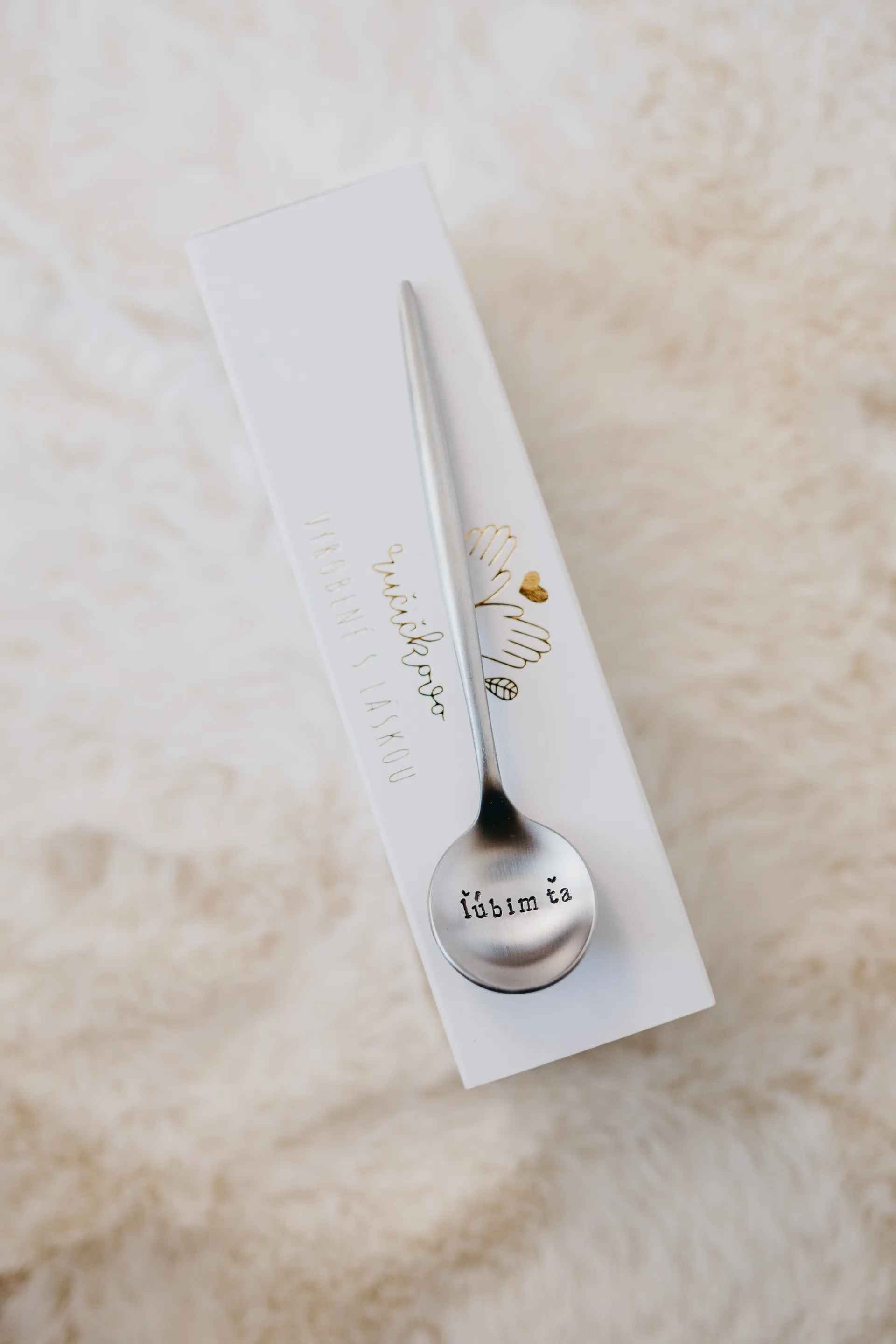 Čajová lyžička s ručne vyrazeným textom "ľúbim ťa" v dolnej, naberacej časti lyžičky. Lyžička je vhodná ako dar alebo pre vlastné potešenie.