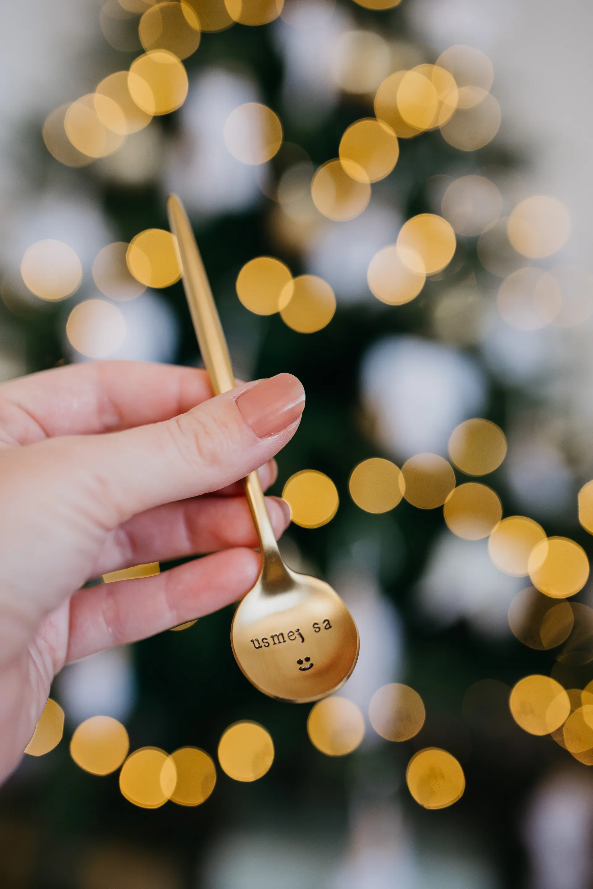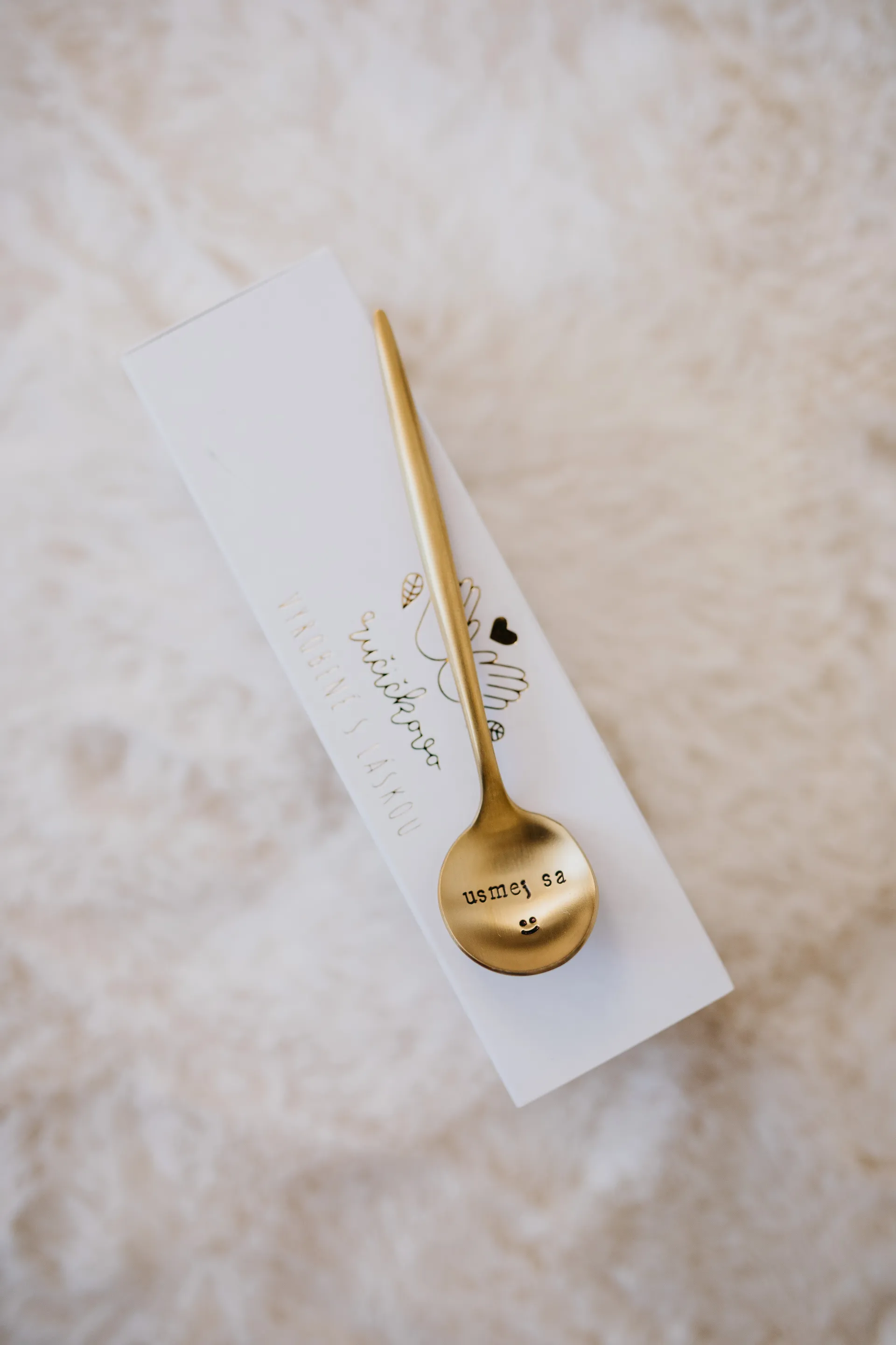 Čajová lyžička s ručne vyrazeným textom "usmej sa :)" v dolnej, naberacej časti lyžičky. Lyžička je vhodná ako dar alebo pre vlastné potešenie.