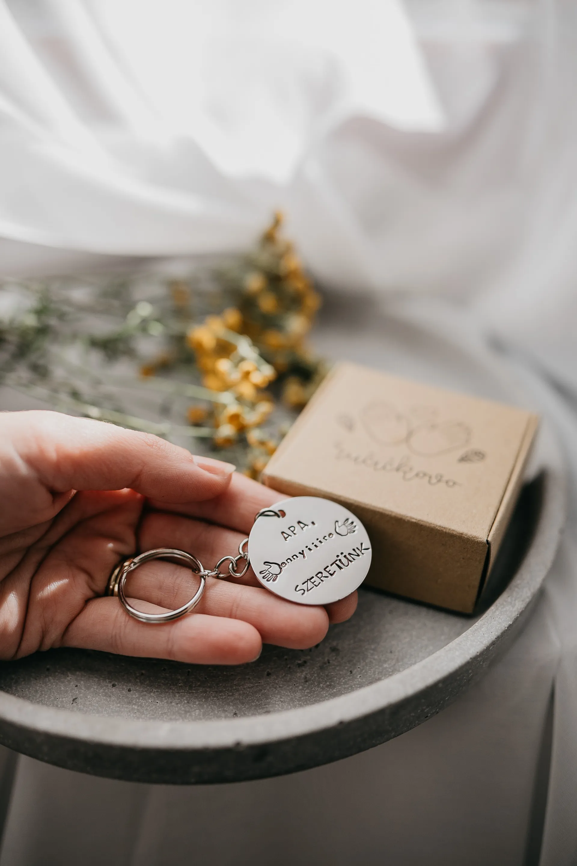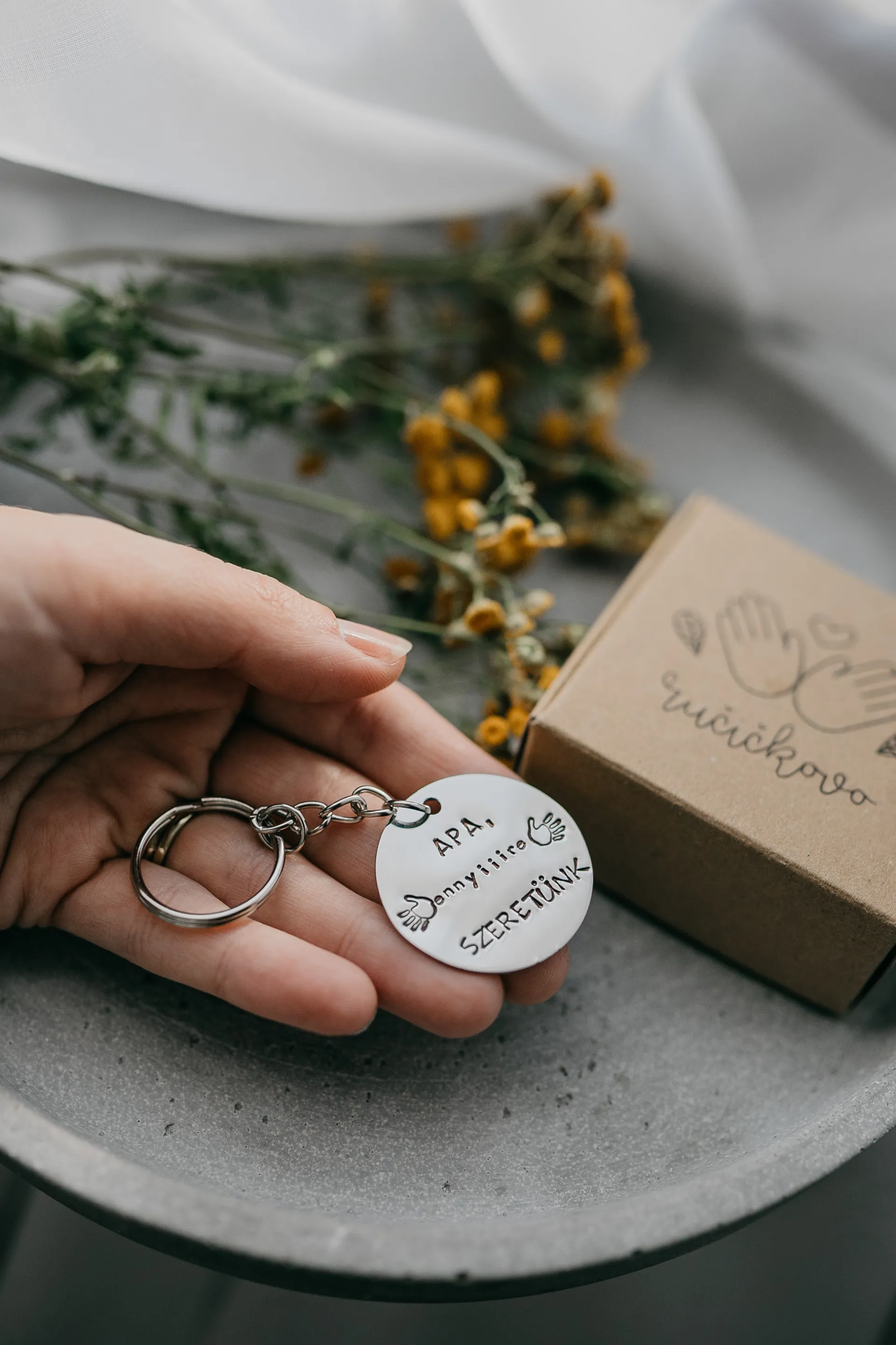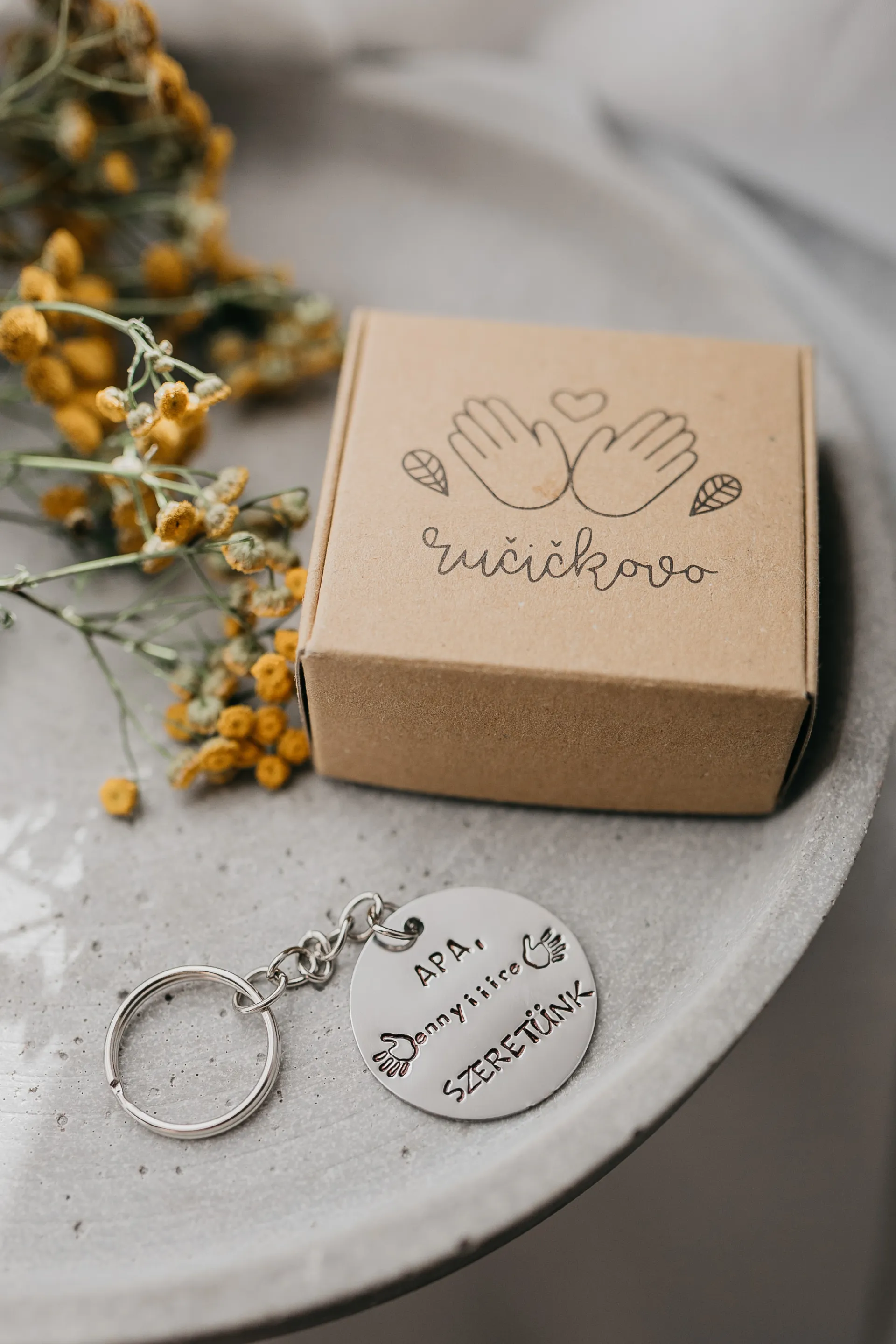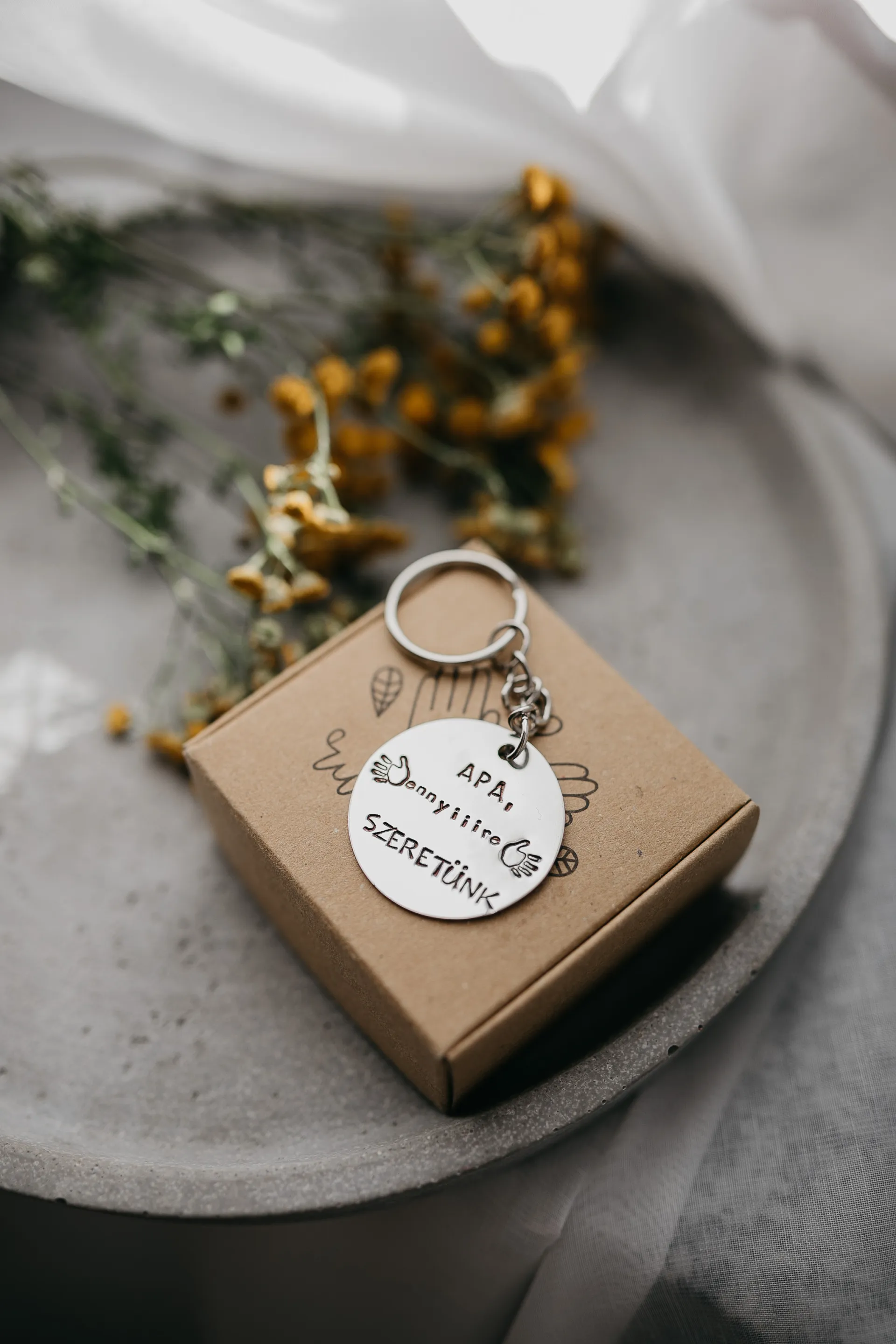 Prívesok na kľúče vyrobený z nerezovej ocele striebornej farby s ručne vyrazeným textom:"Apa, ennyiiire szeretünk" .Okolo textu druhom riadku sú vyrazené symboly rúk, ktoré symbolicky znázorňujú obrovské množstvo akým vyjadrujeme to ako veľmi ľúbime :)