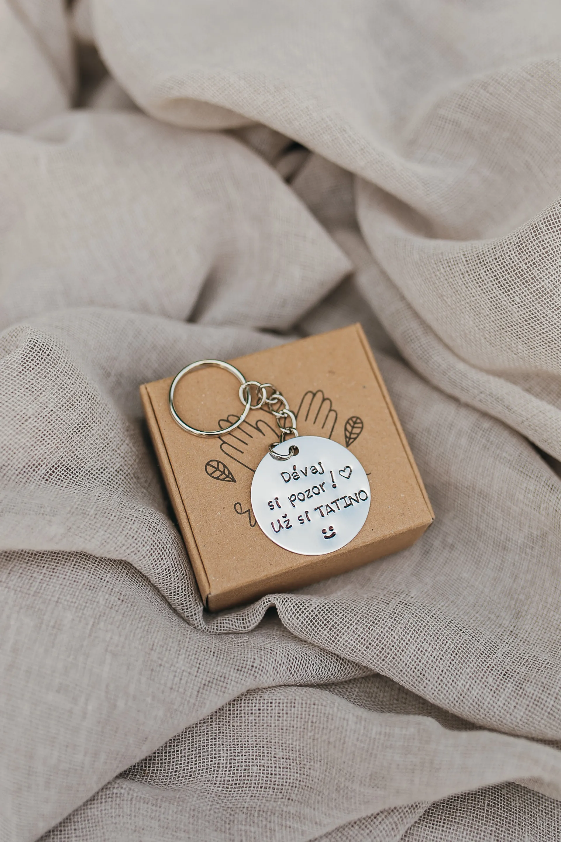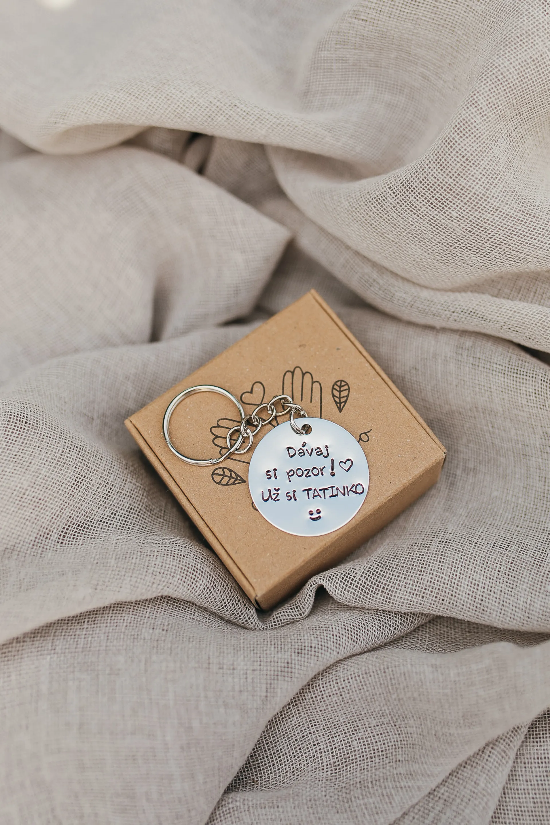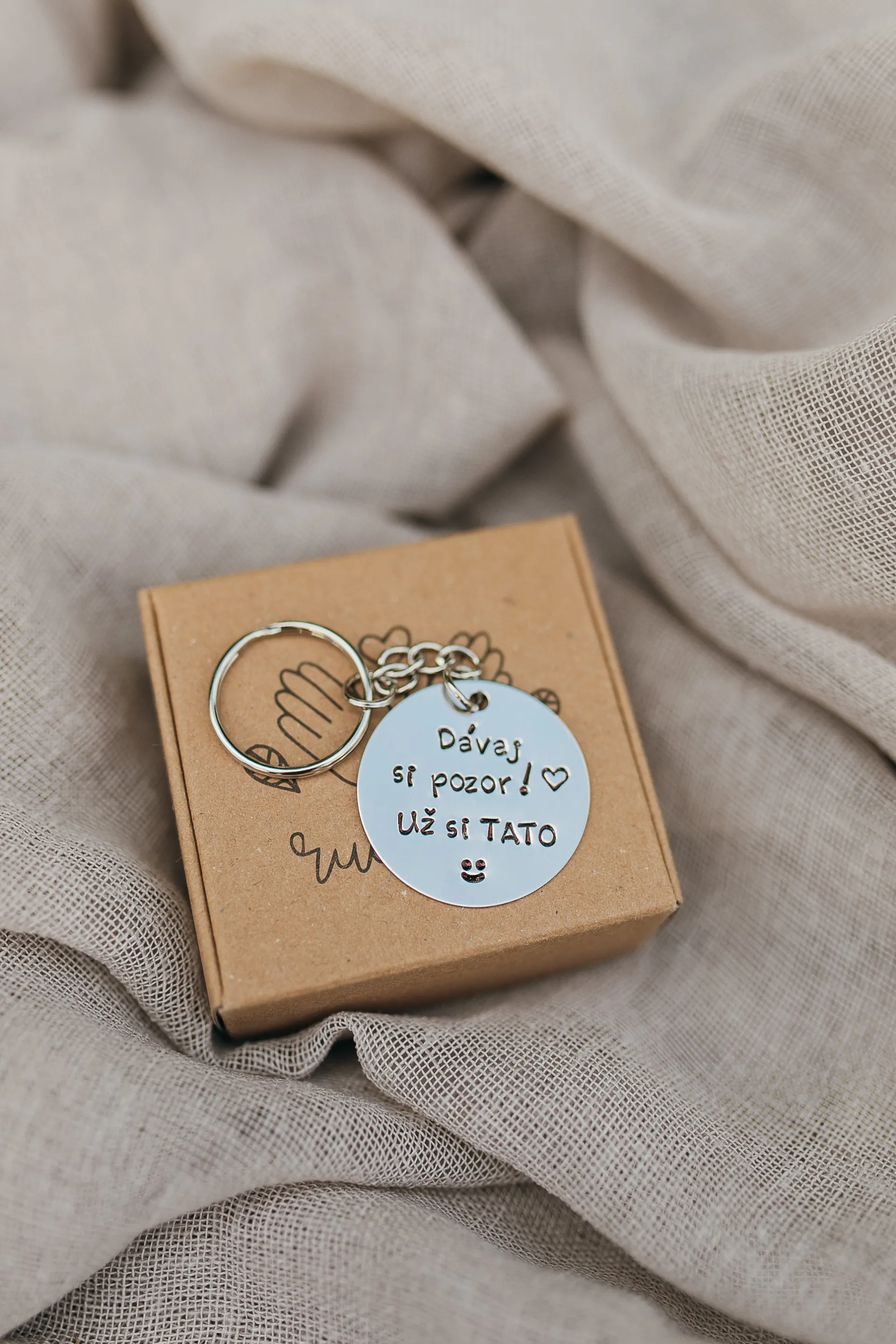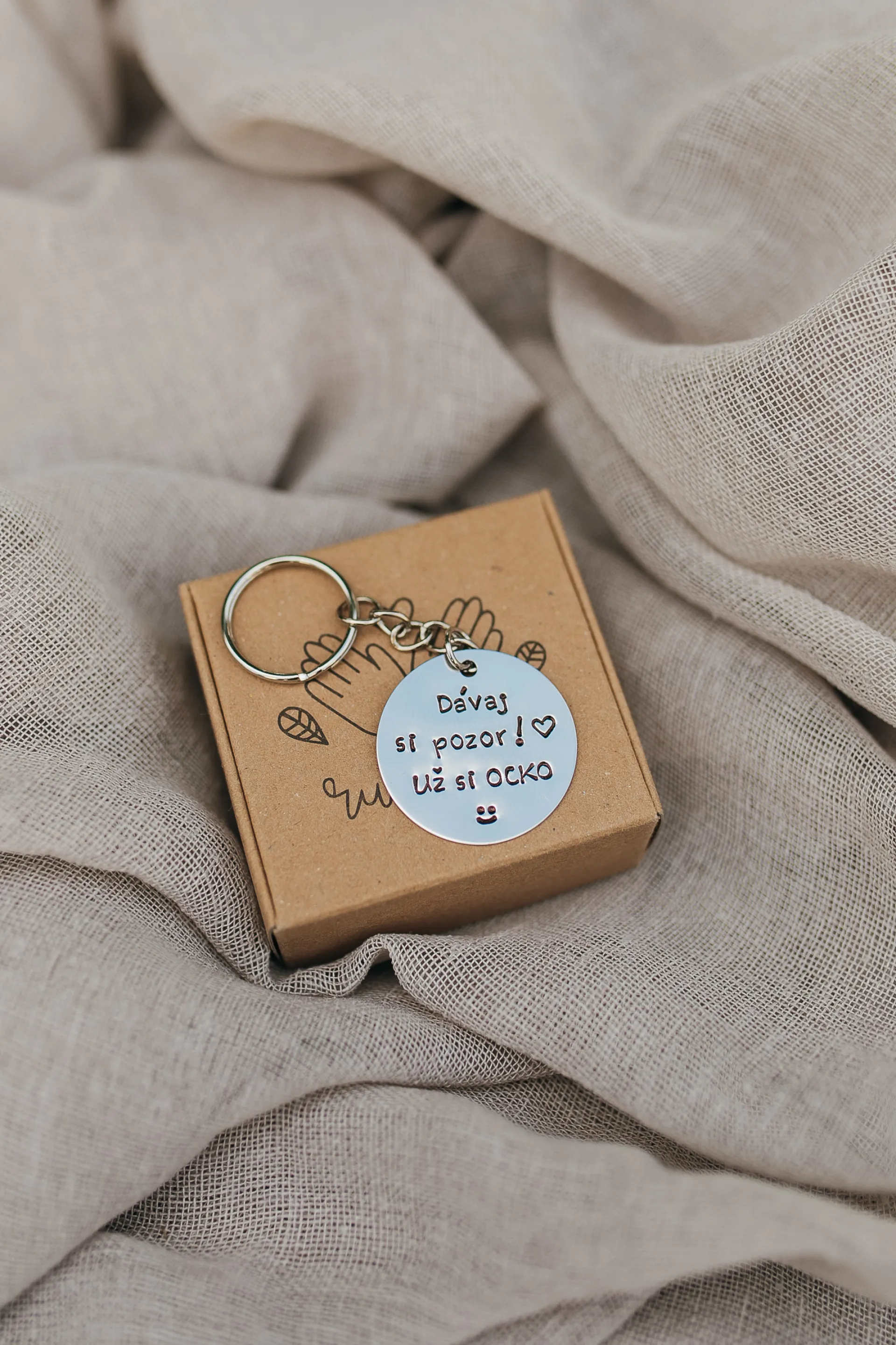 Prívesok na kľúče vyrobený z nerezovej ocele striebornej farby s ručne vyrazeným textom:"Dávaj si pozor! Už si OCKO".