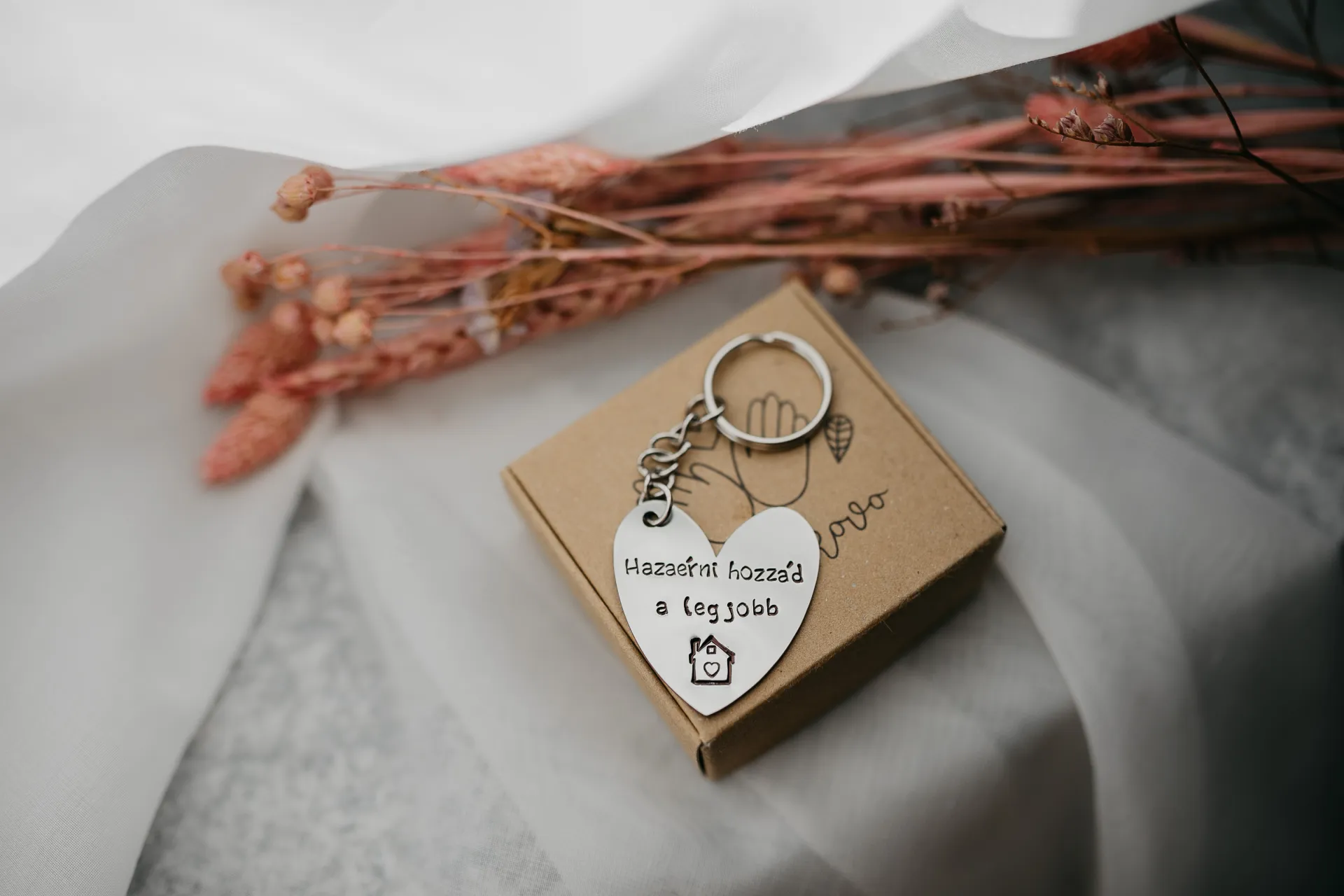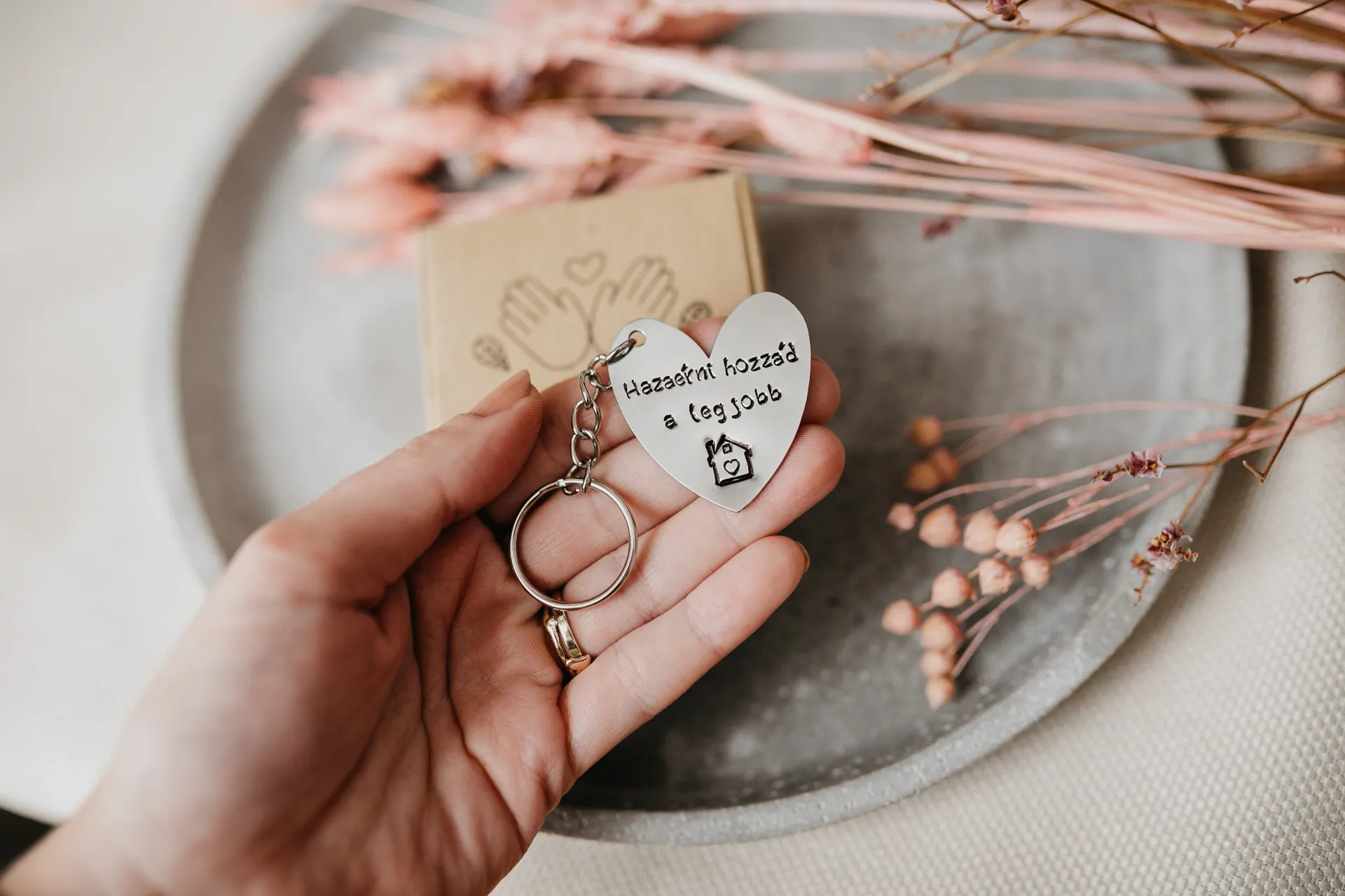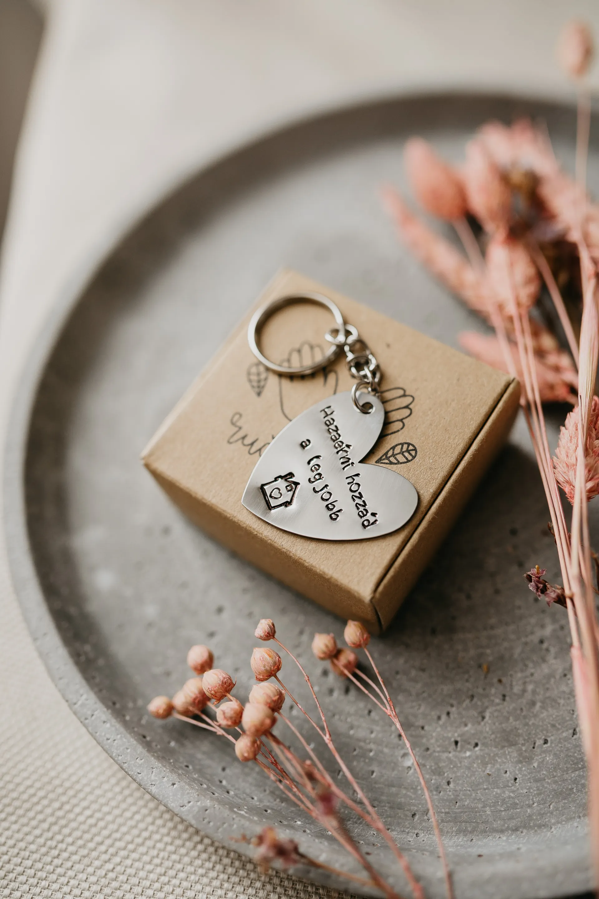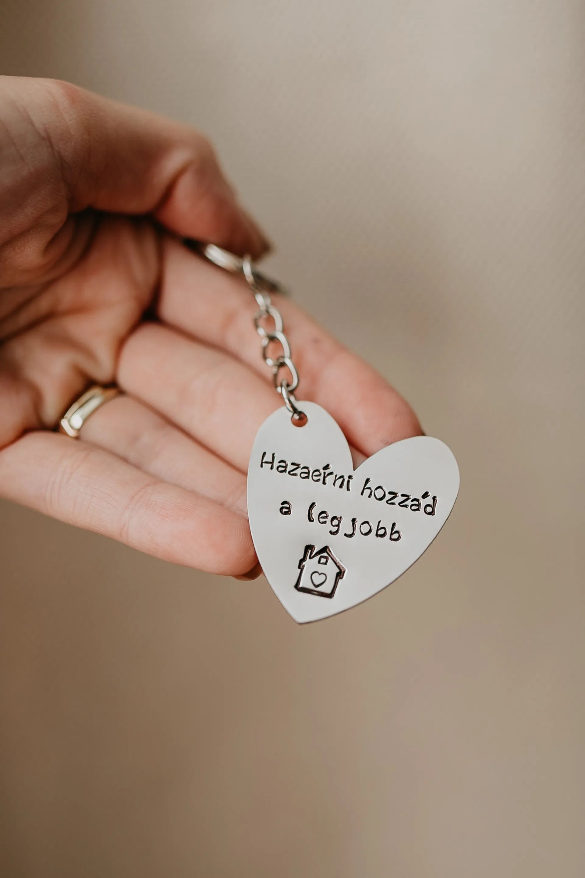 Prívesok na kľúče vyrobený z nerezovej ocele striebornej farby s ručne vyrazeným textom: "Hazaérni hozzád a legjobb".