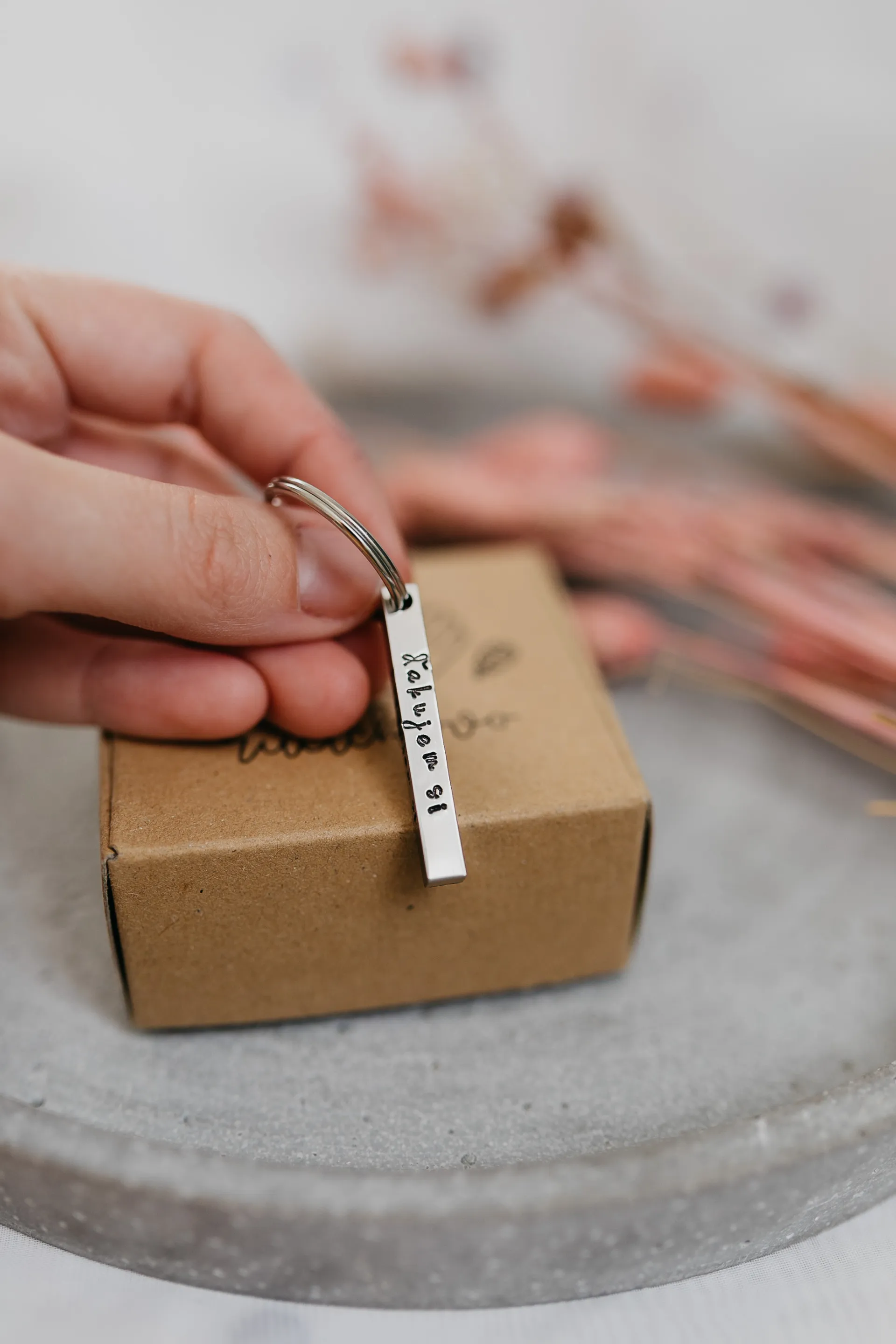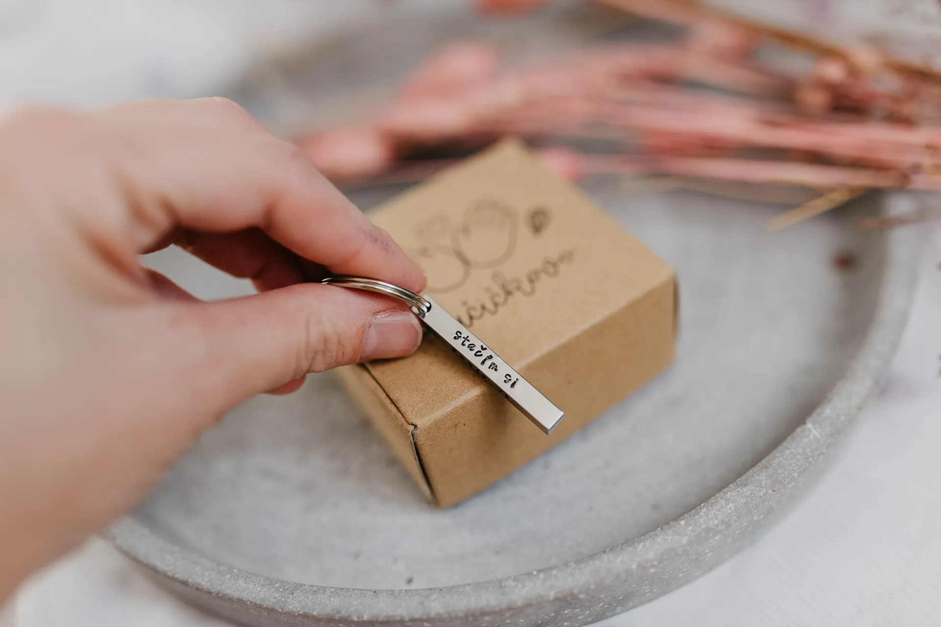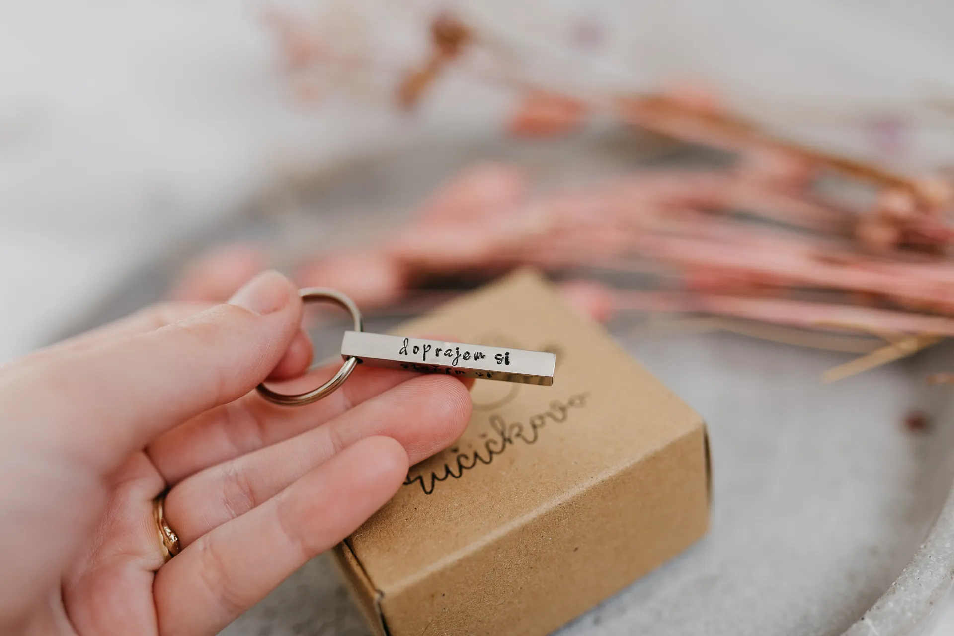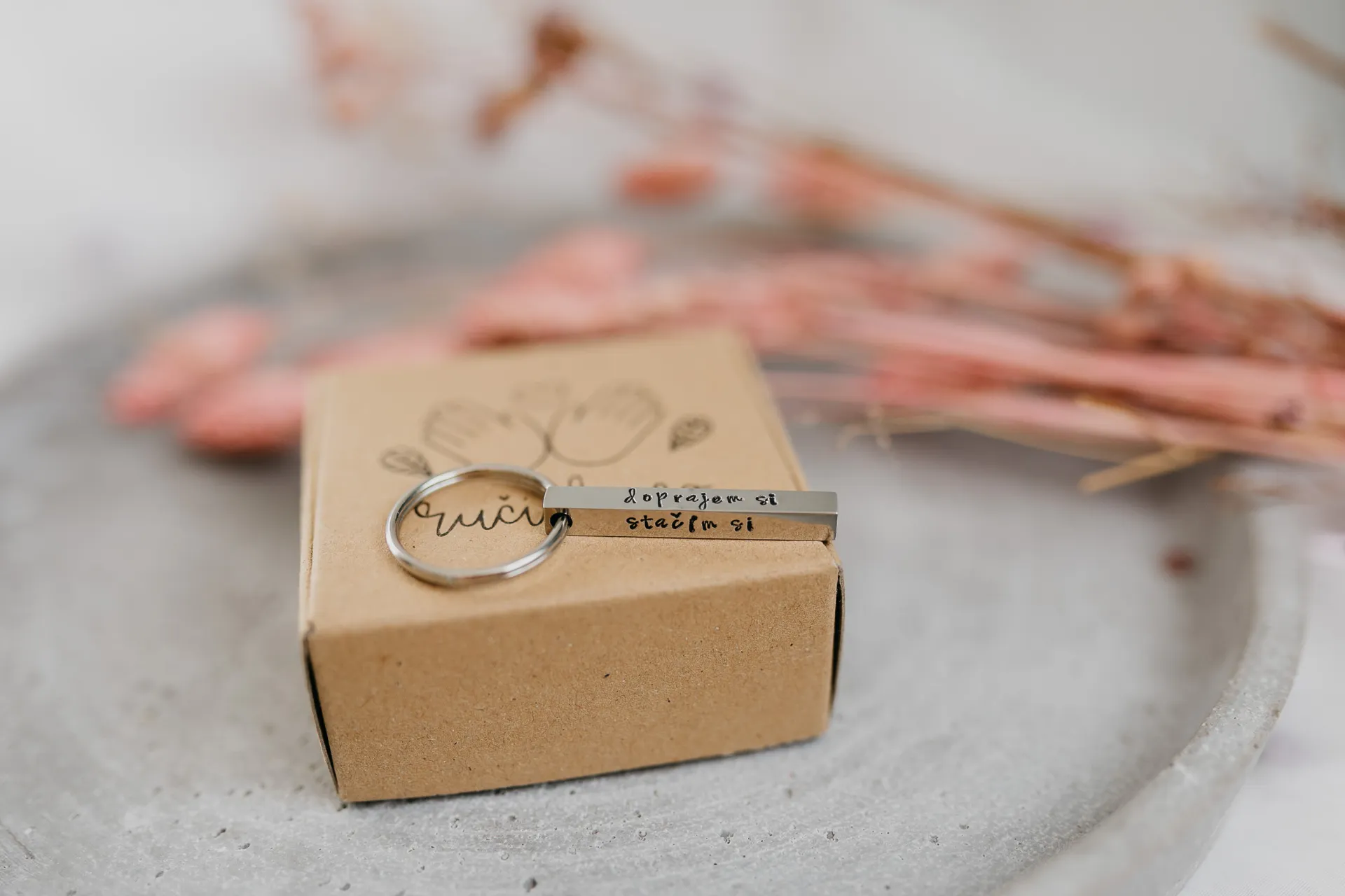 Prívesok na kľúče vyrobený z nerezovej ocele striebornej farby s ručne vyrazeným textom na hranách :"verím si, ďakujem si, doprajem si, stačím si" .