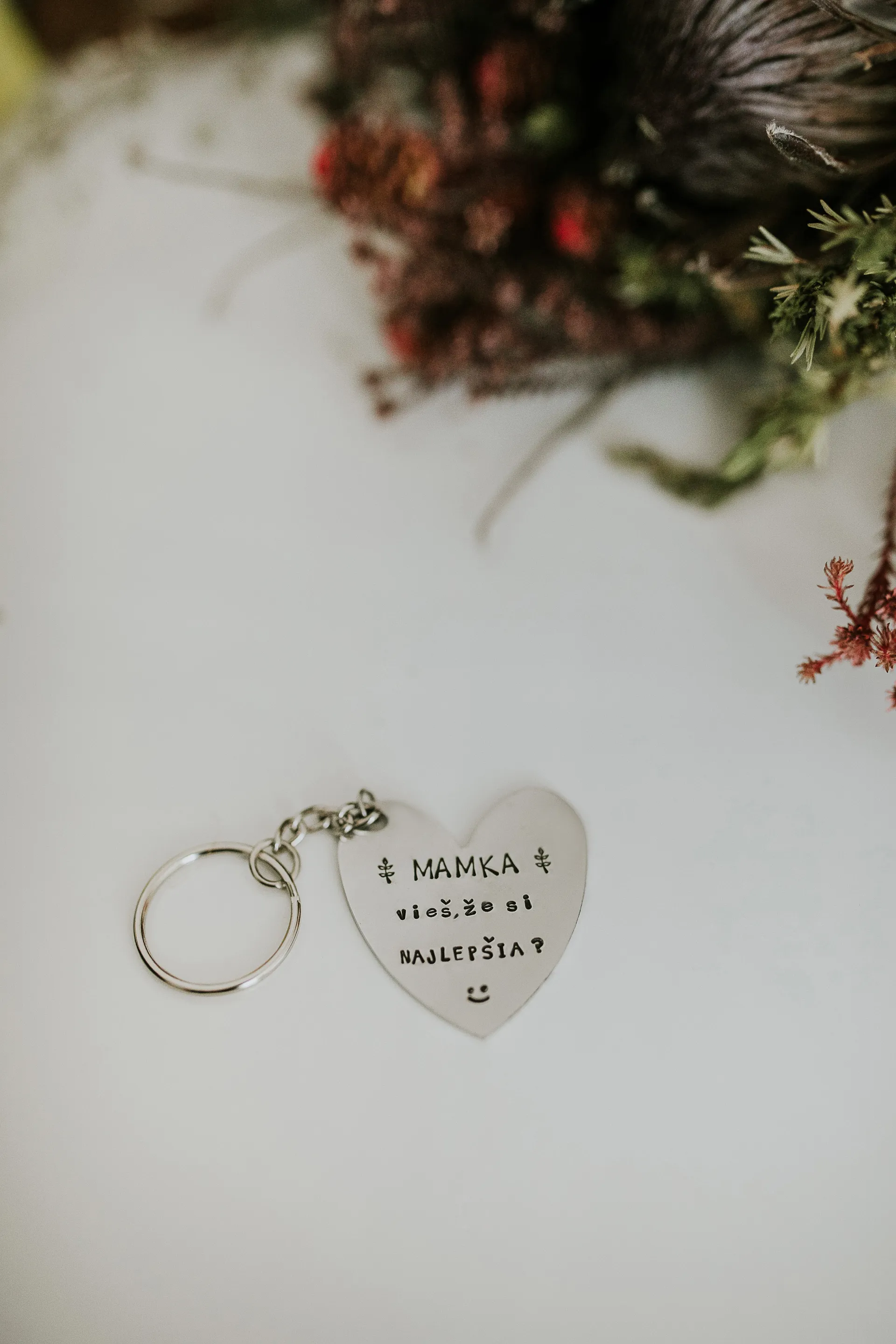 Prívesok na kľúče vyrobený z nerezovej ocele striebornej farby s ručne vyrazeným textom:"MAMKA vieš že si NAJLEPŠIA?".
