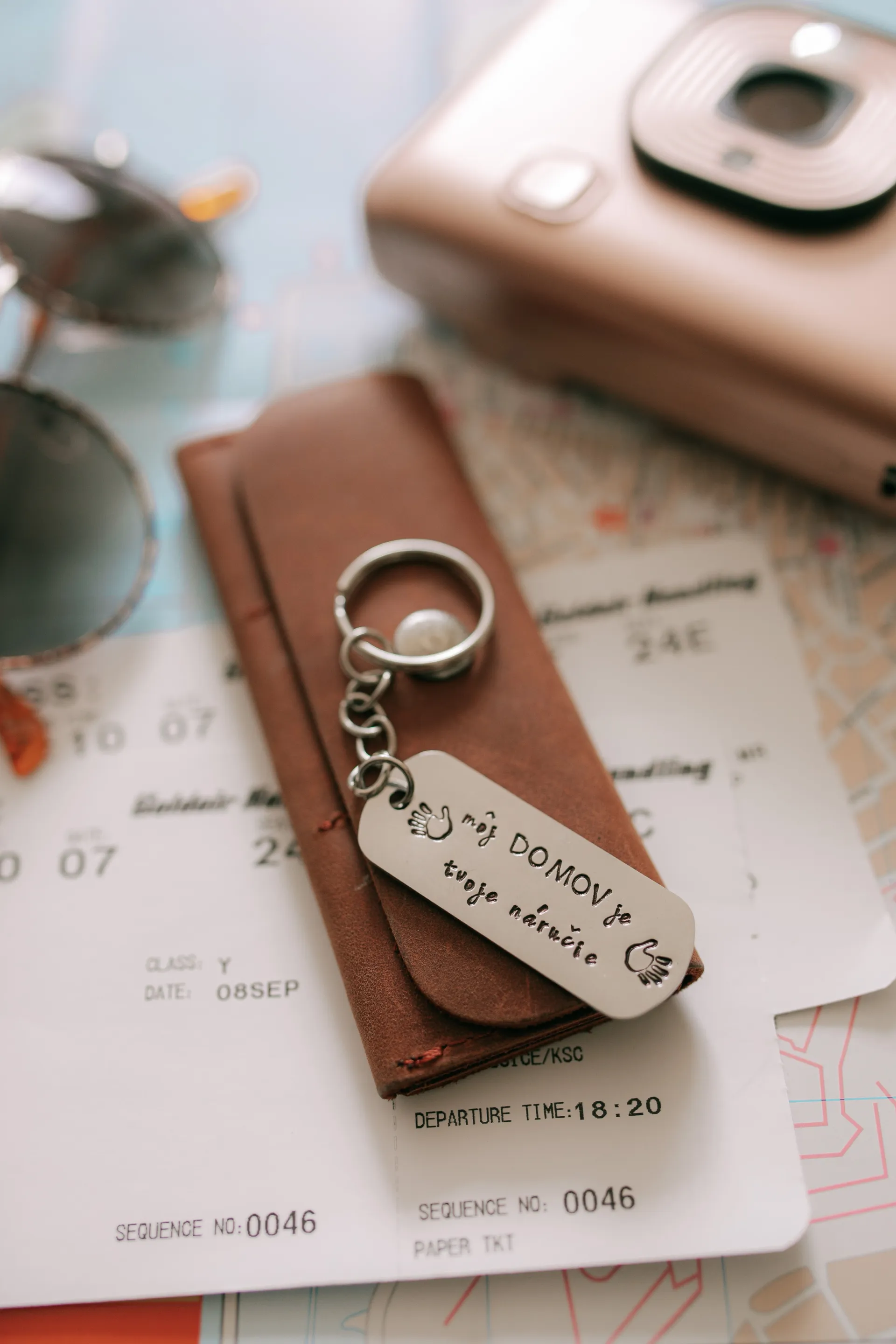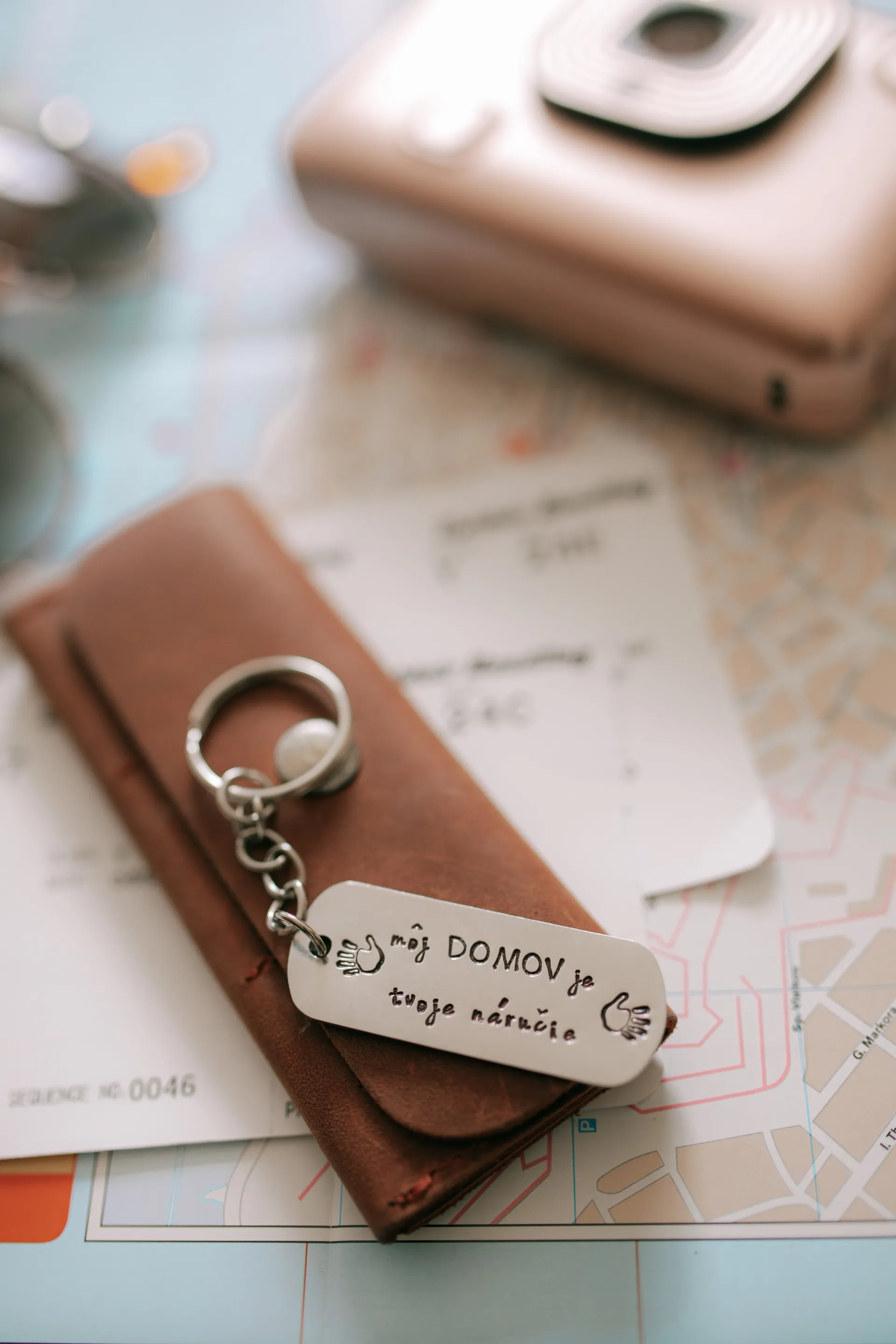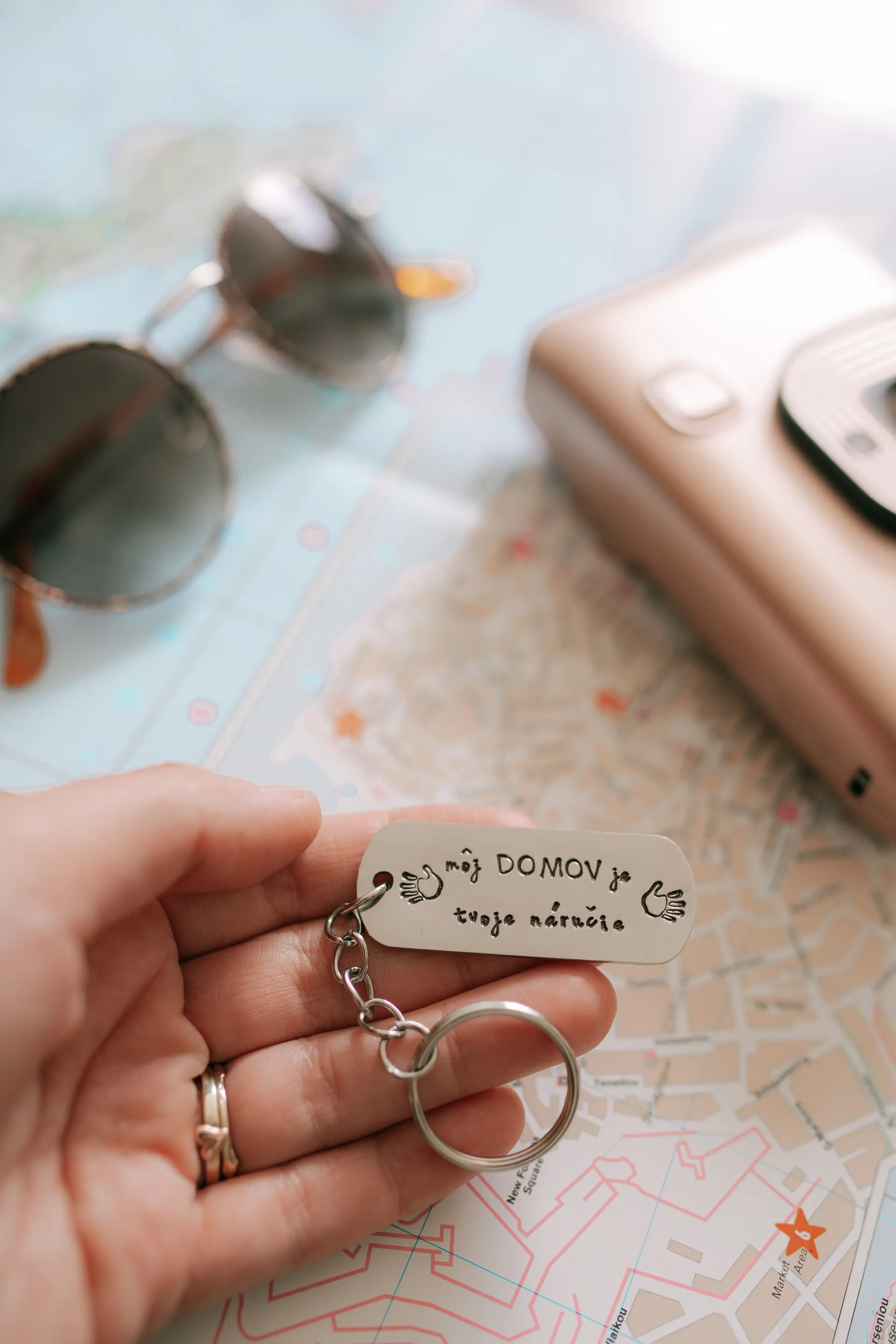 Prívesok na kľúče vyrobený z nerezovej ocele striebornej farby s ručne vyrazeným textom:"Môj domov je tvoje náručie".