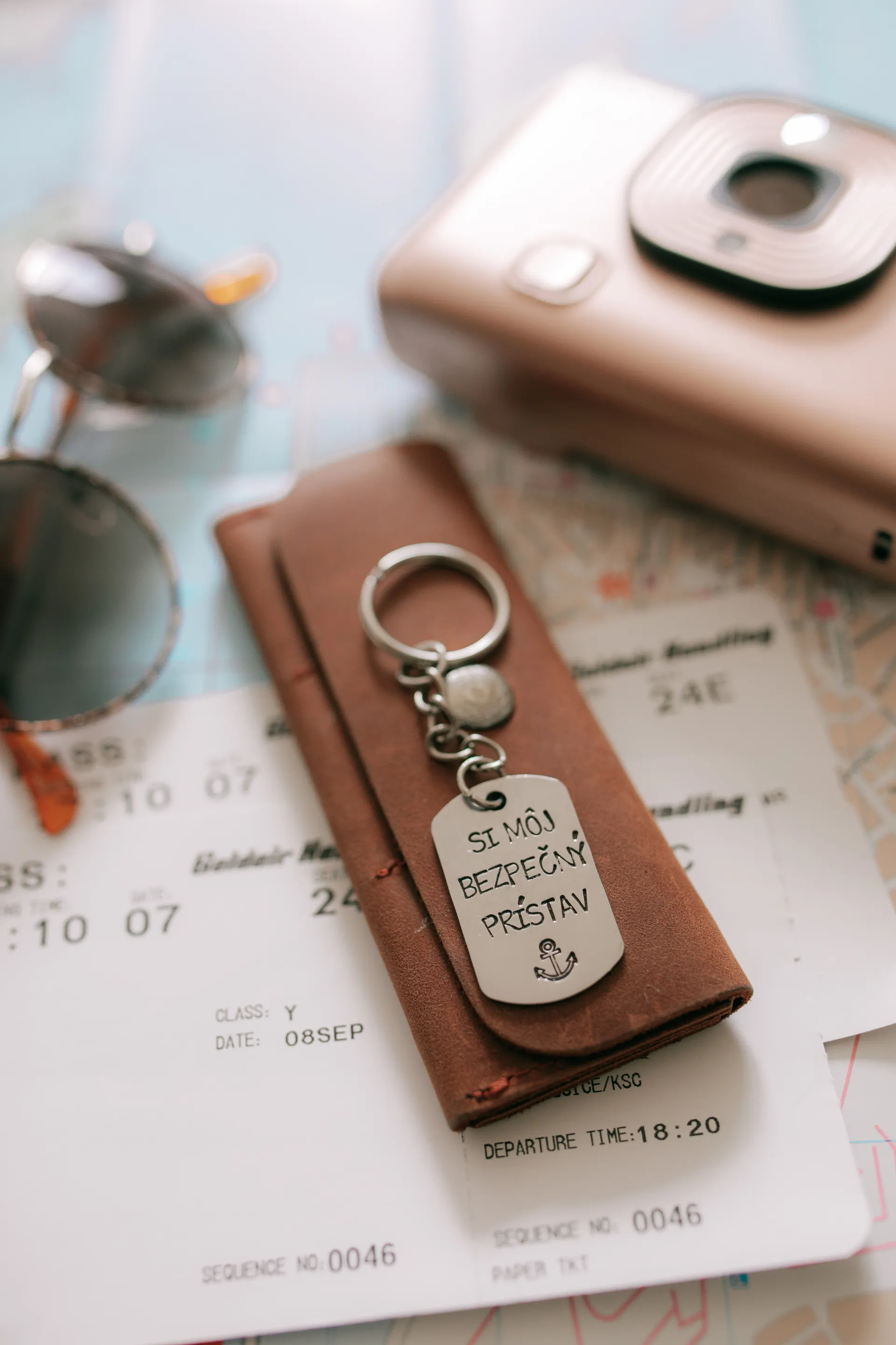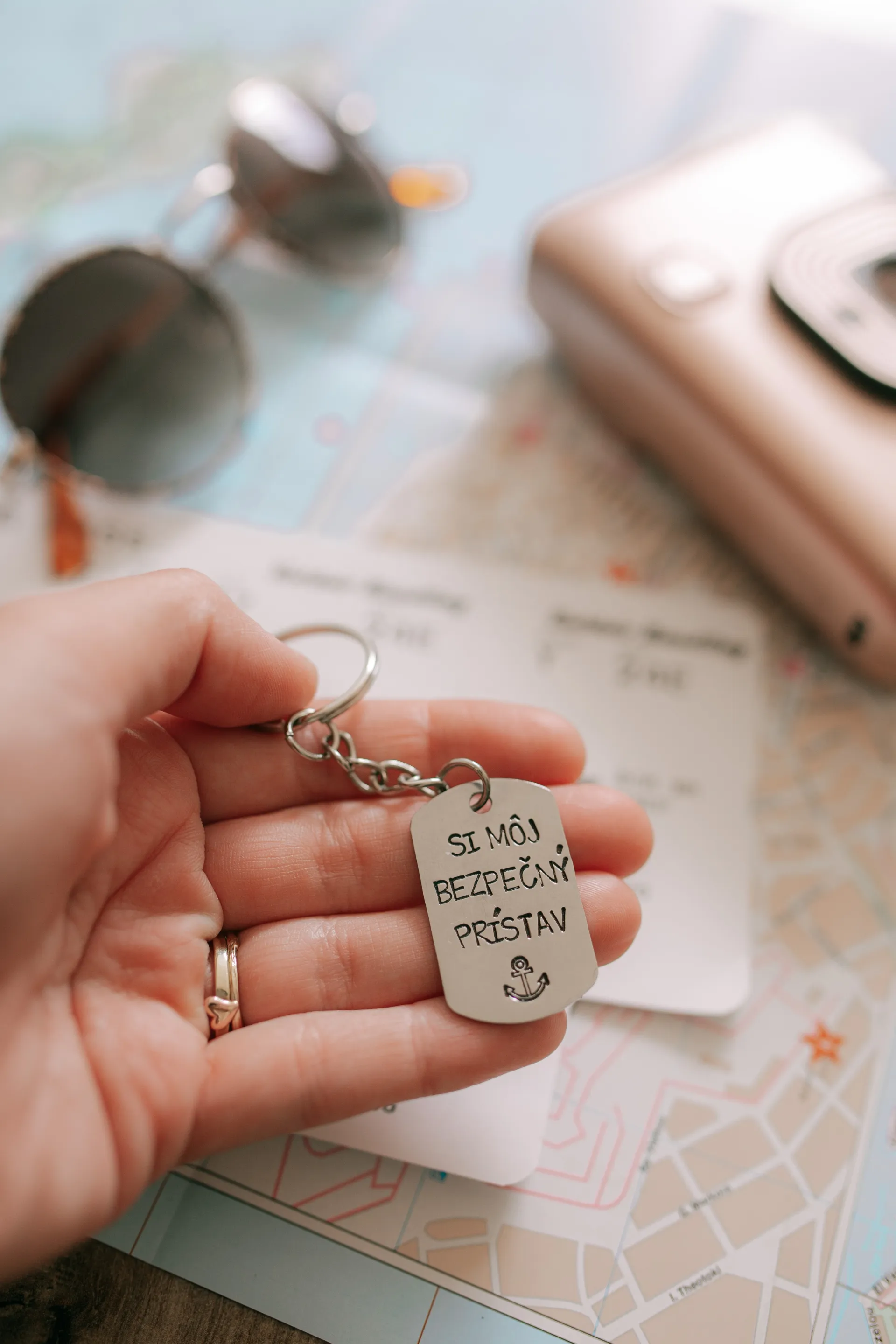 Prívesok na kľúče vyrobený z nerezovej ocele striebornej farby s ručne vyrazeným textom:"Si môj bezpečný prístav" a vyrazeným symbolom kotvy.