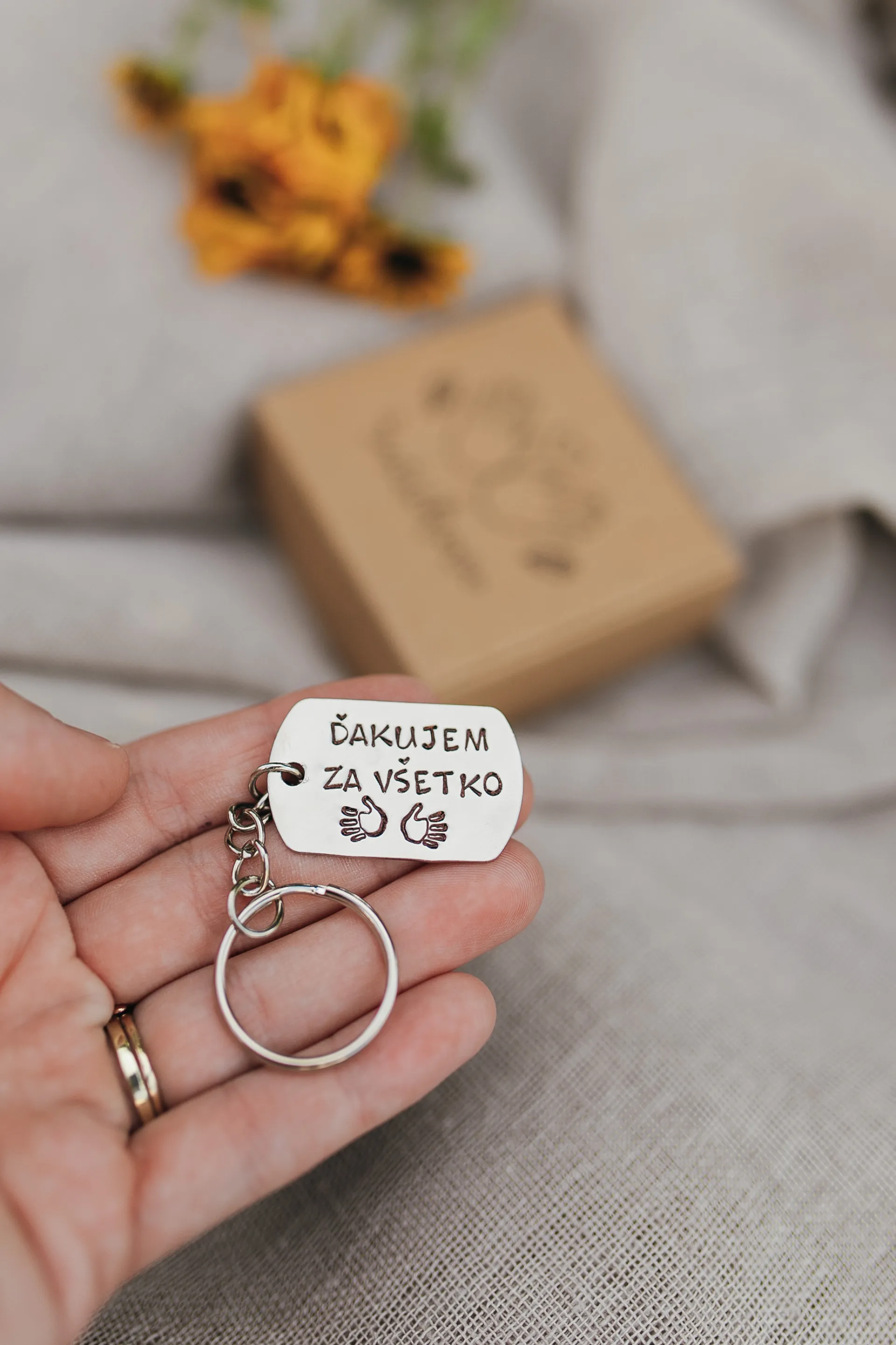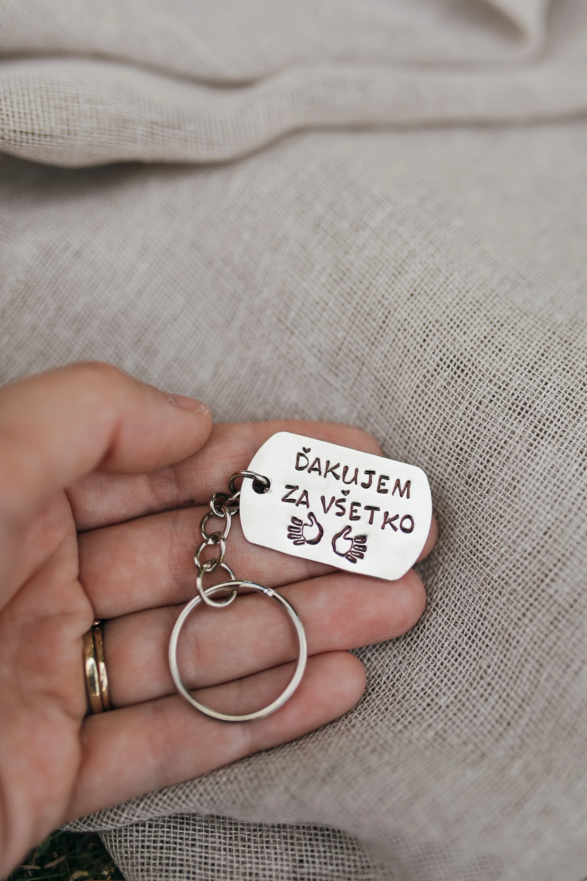 Prívesok na kľúče vyrobený z nerezovej ocele striebornej farby s ručne vyrazeným textom:"ďakujem za všetko" a vyrazené symboly rúk.