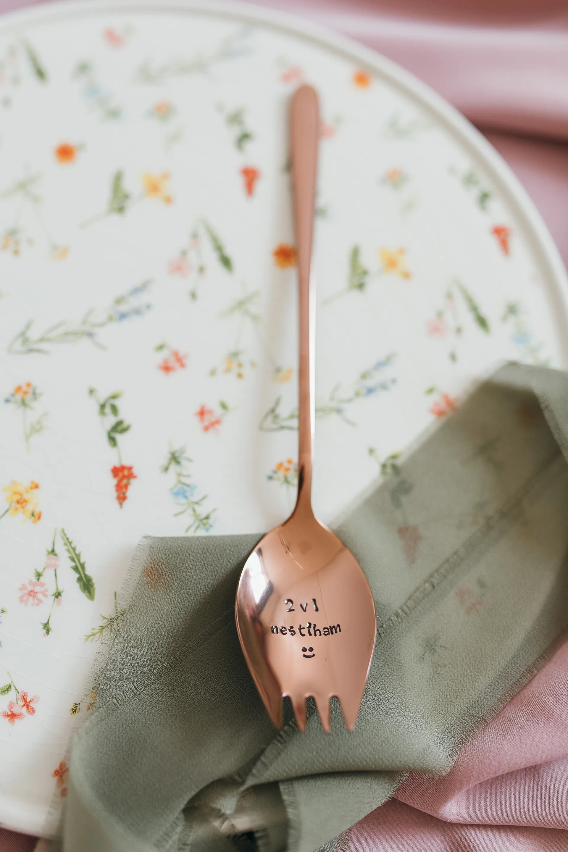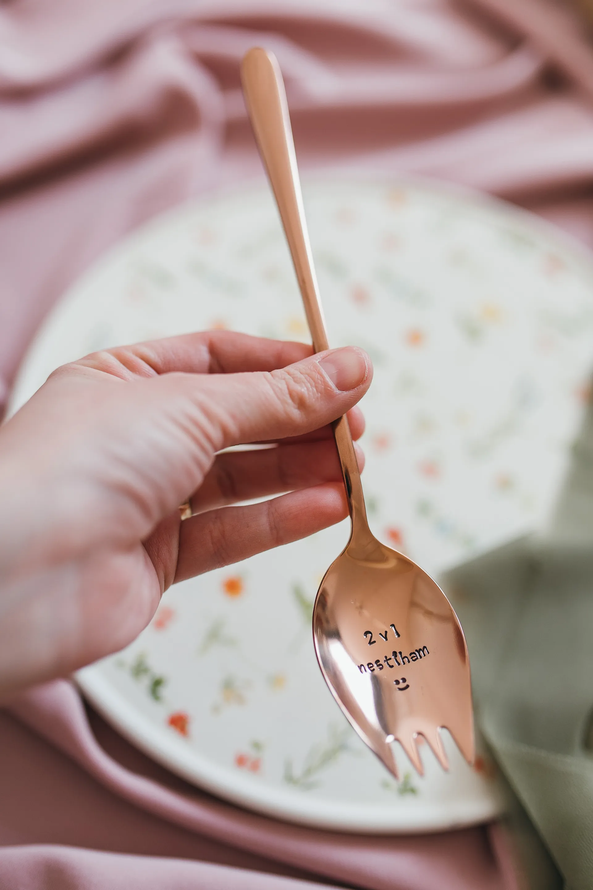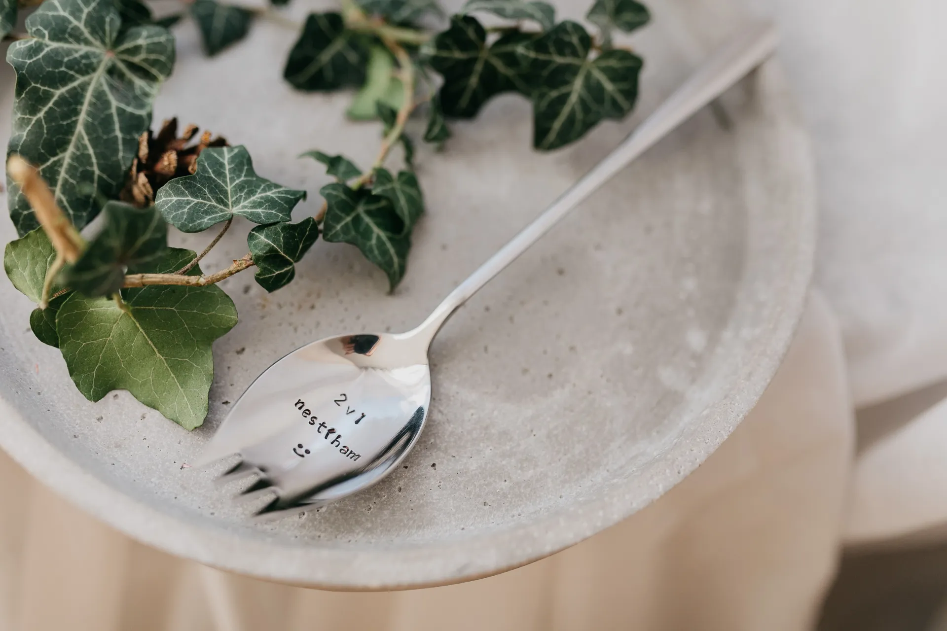 Polievková lyžica a vidlička v jednom, s ručne vyrazeným textom