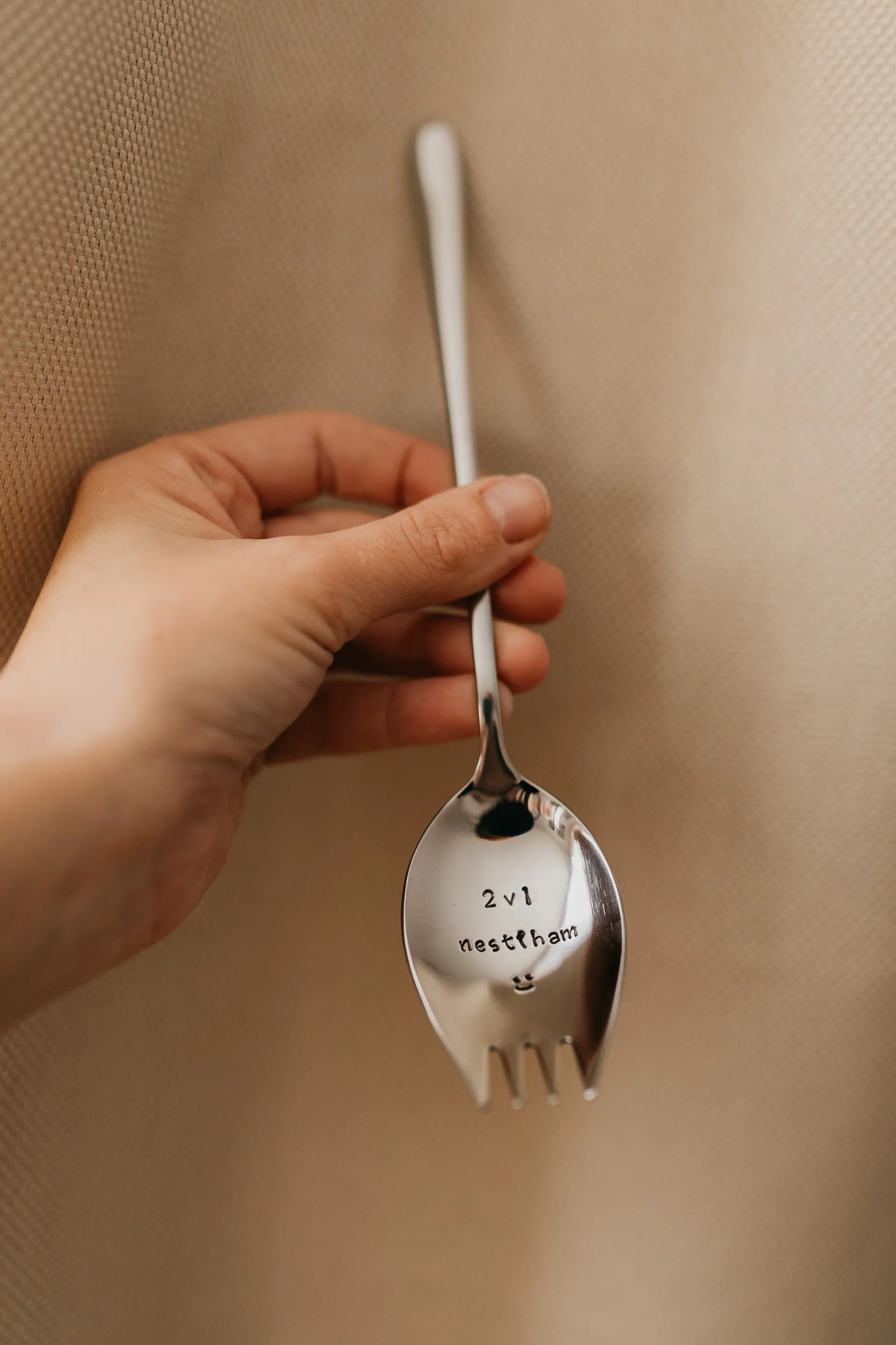 Polievková lyžica a vidlička v jednom,je vyrobená z ocele s ručne vyrazeným textom "2v1 nestíham" a smajlíkom pod textom. Je plytkého tvaru a jej dĺžka je 21 cm.