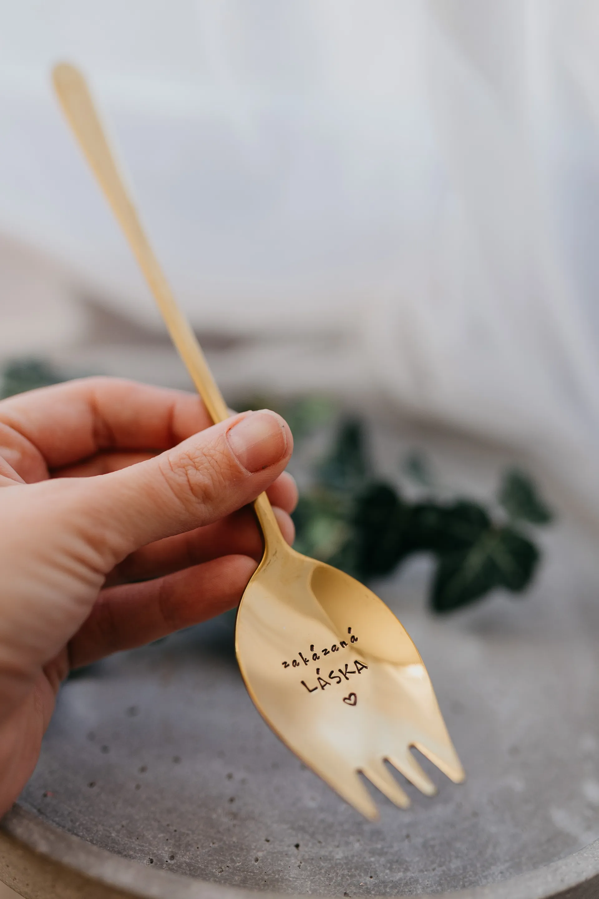 Polievková lyžica a vidlička v jednom,je vyrobená z ocele s ručne vyrazeným textom "Zakázaná láska". Je plytkého tvaru a jej dĺžka je 21 cm.