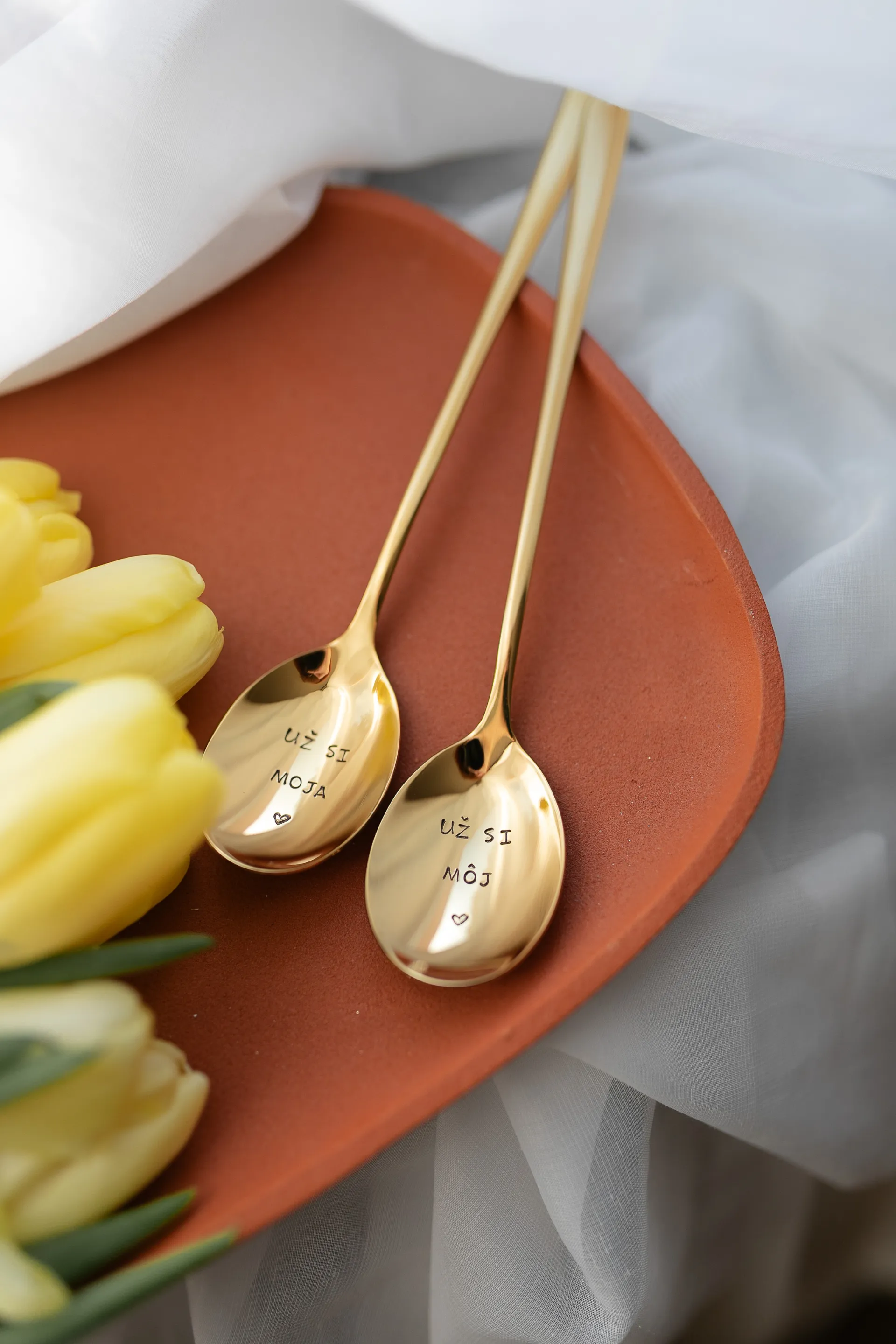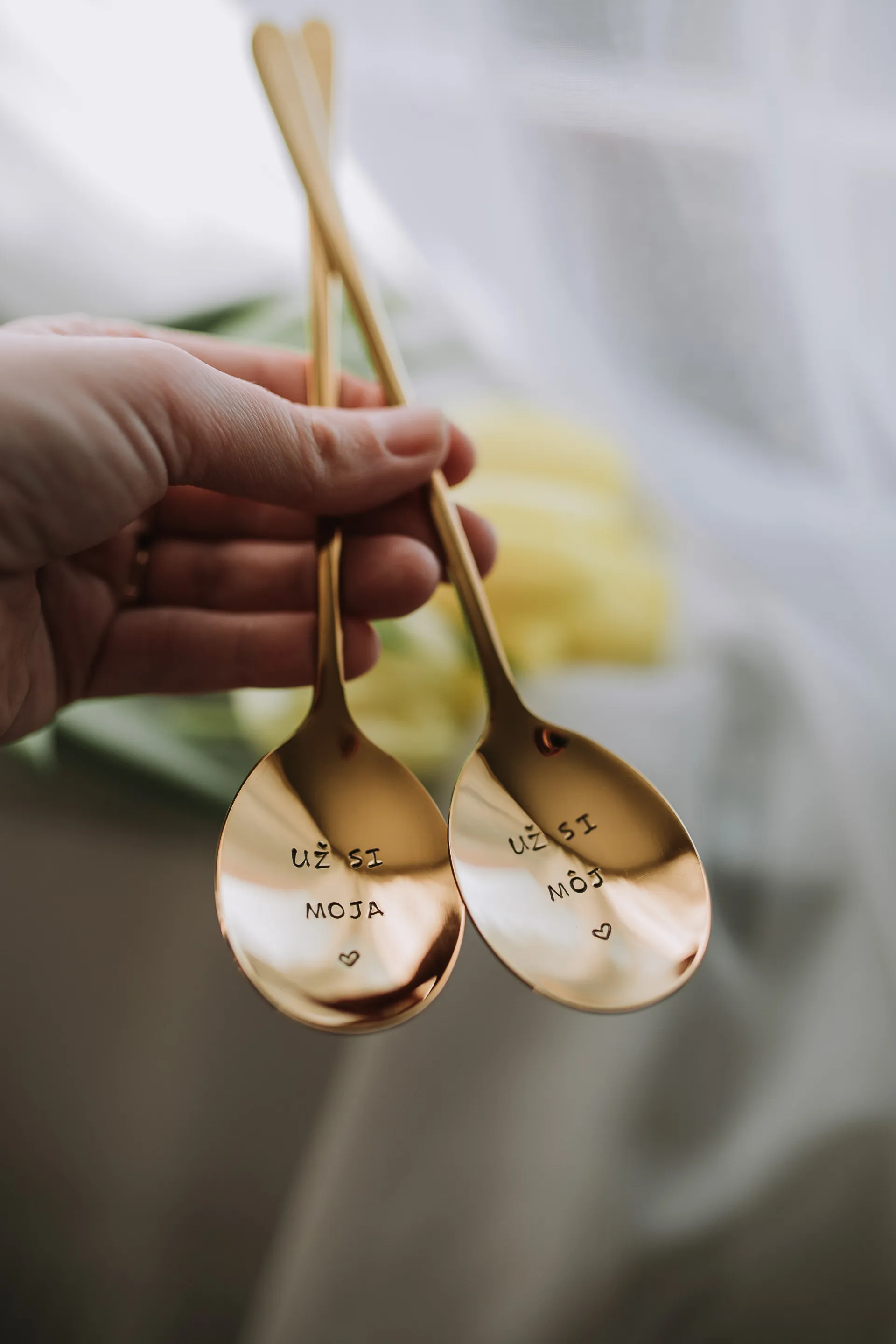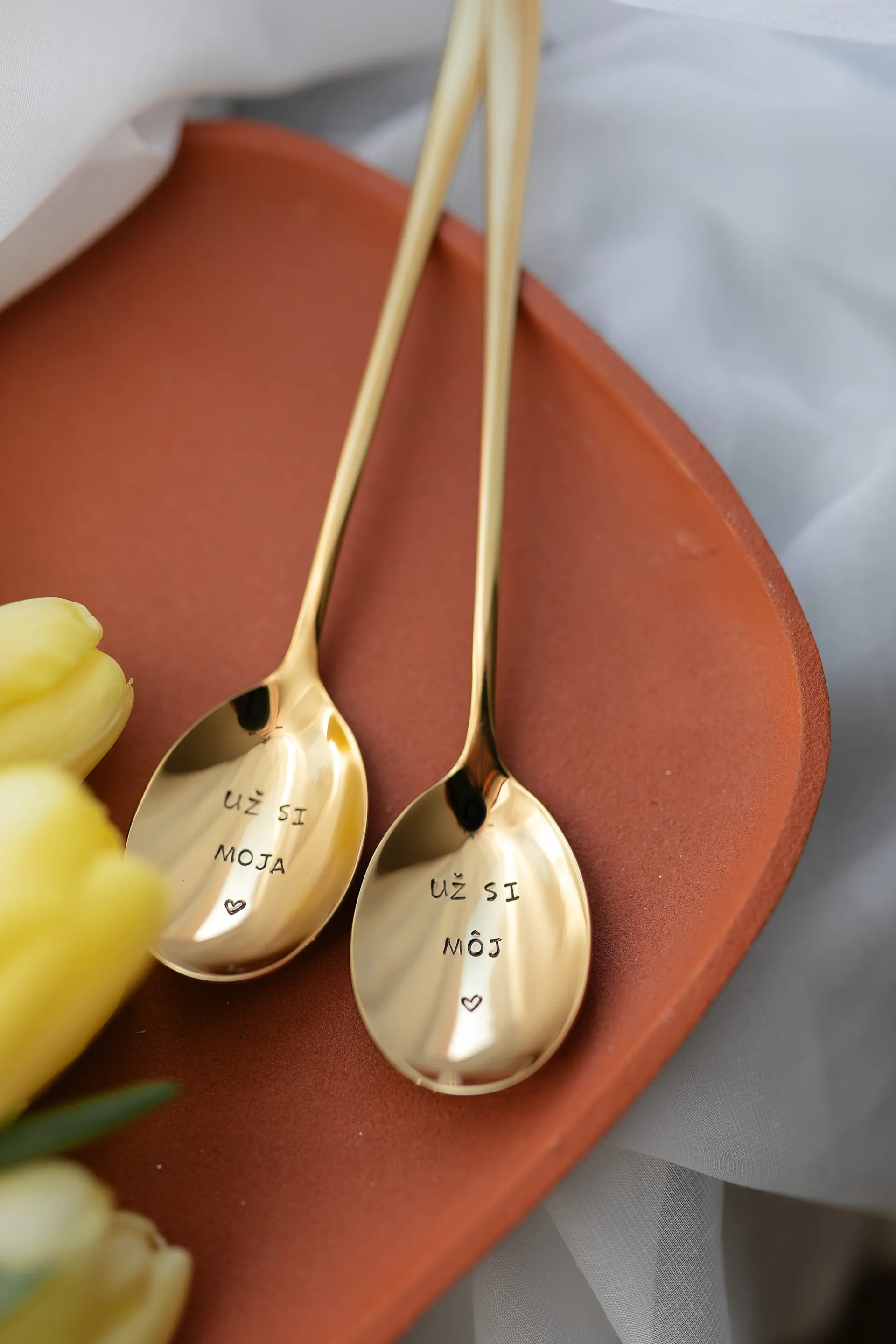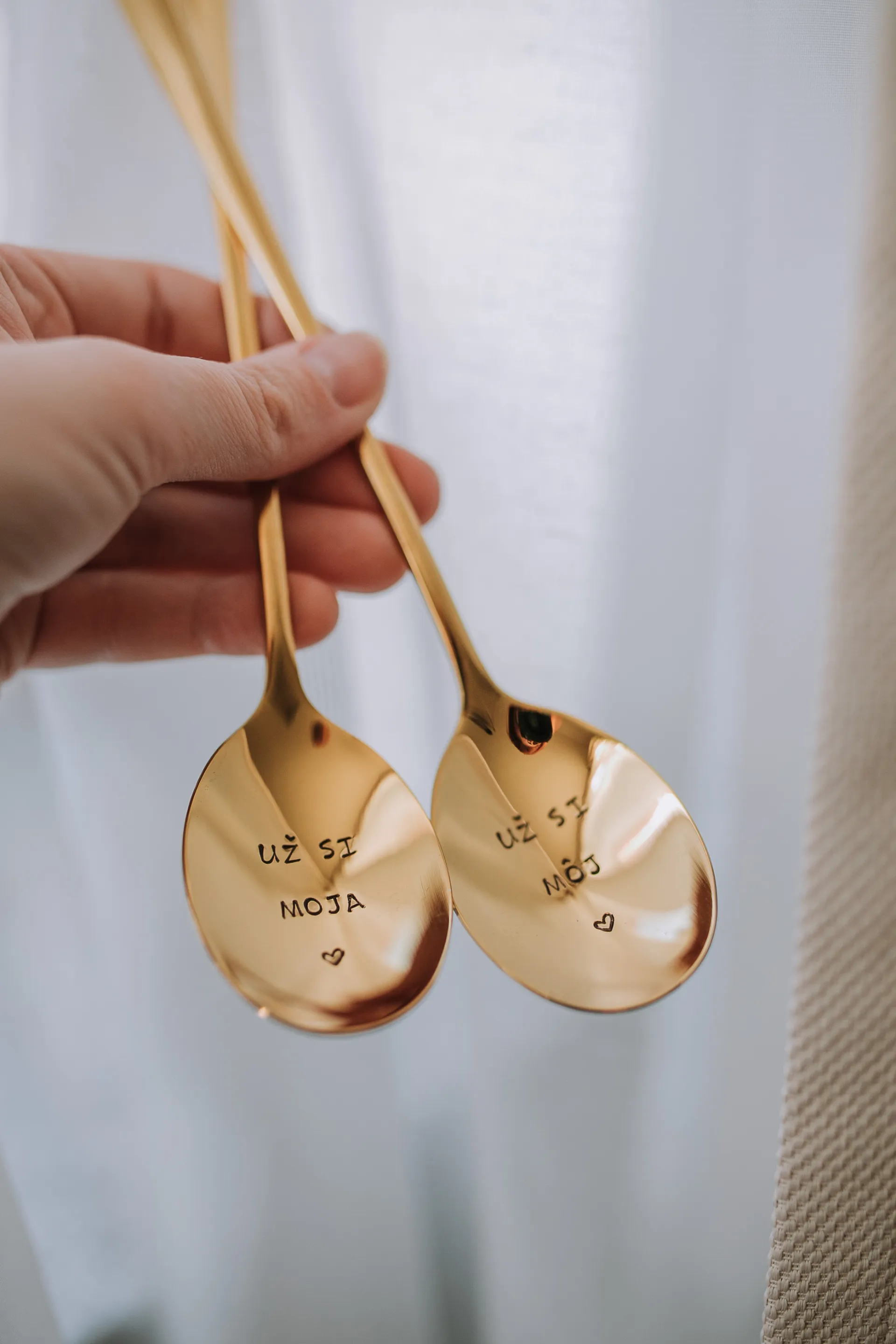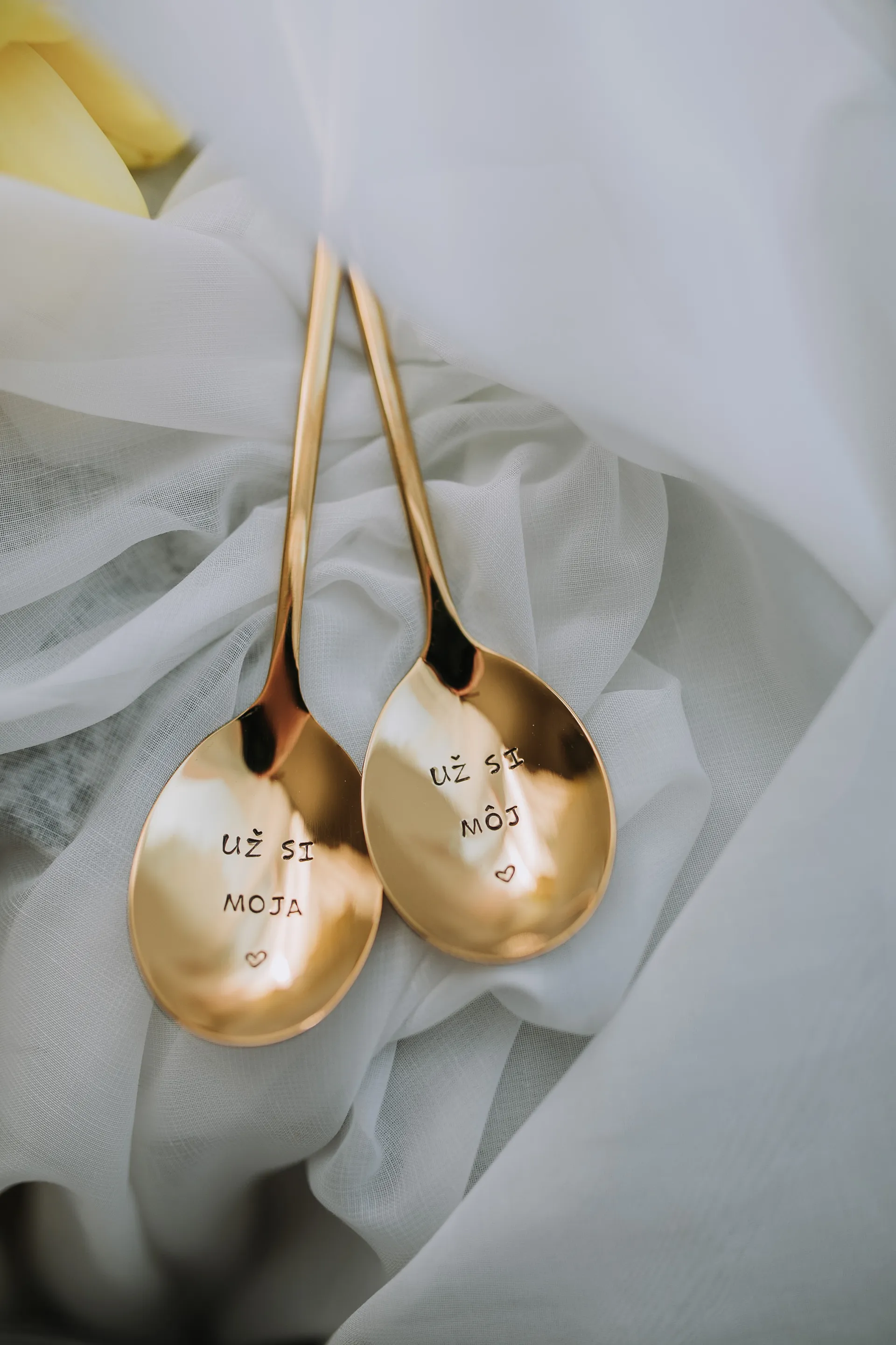 Sada lyžíc s nápismi „už si moja/už si môj“ a symbolom srdiečka vyjadruje, že niektoré veci proste patria k sebe navždy, rovnako ako tieto lyžice.