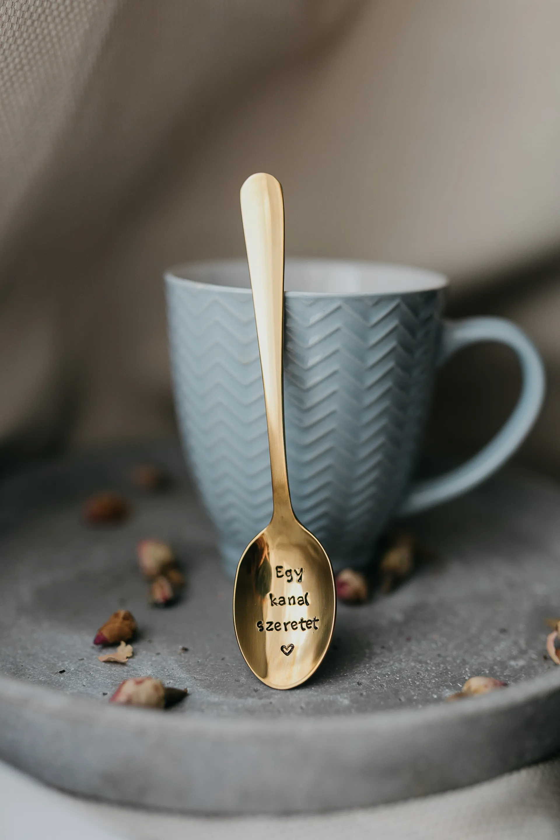 Lyžička vyrobená z ocele s dĺžkou 14 cm, teda čajovej veľkosti s ručne vyrazeným textom v dolnej naberacej časti. Ručne vyrazený text je "Egy kanal szeretet". Pod textom je ešte vyrazený symbol srdca.