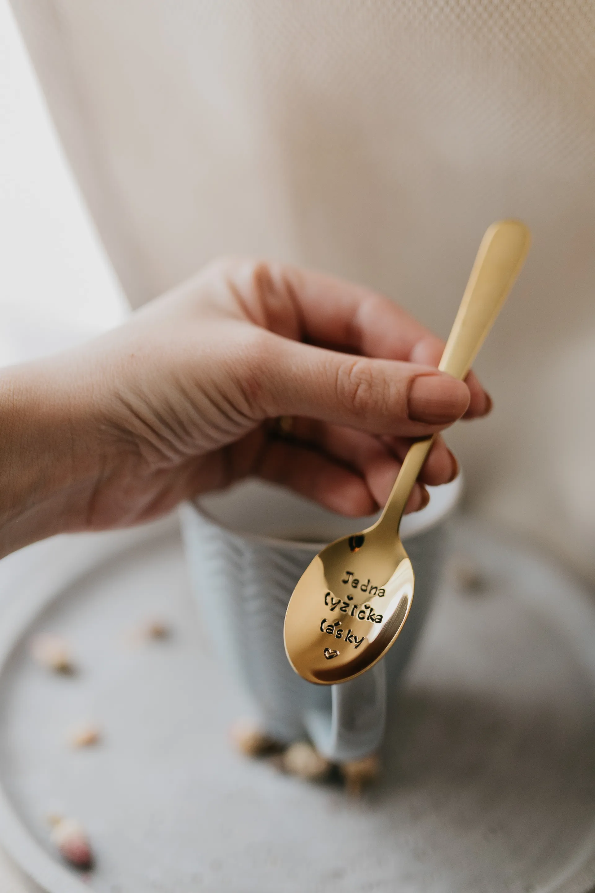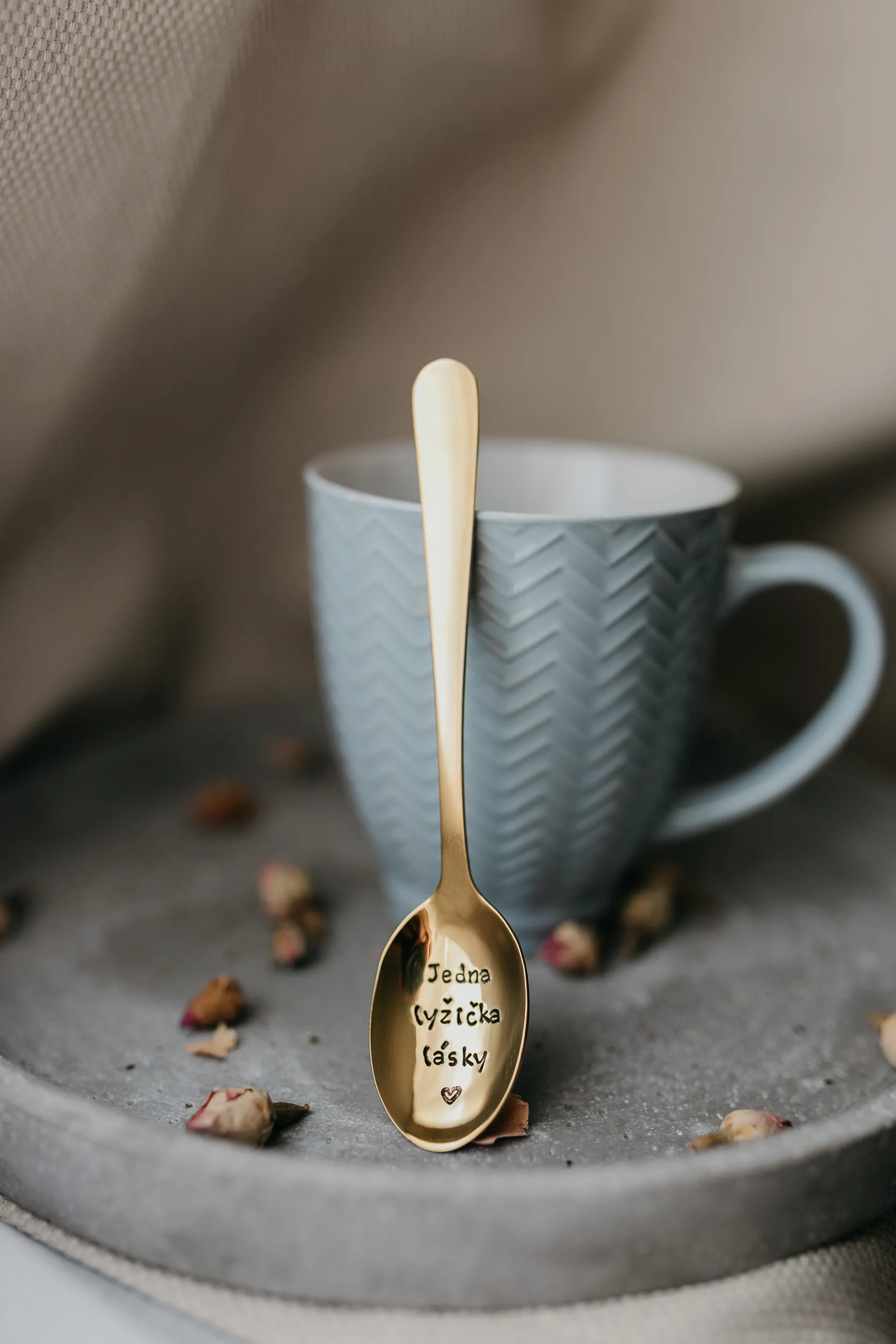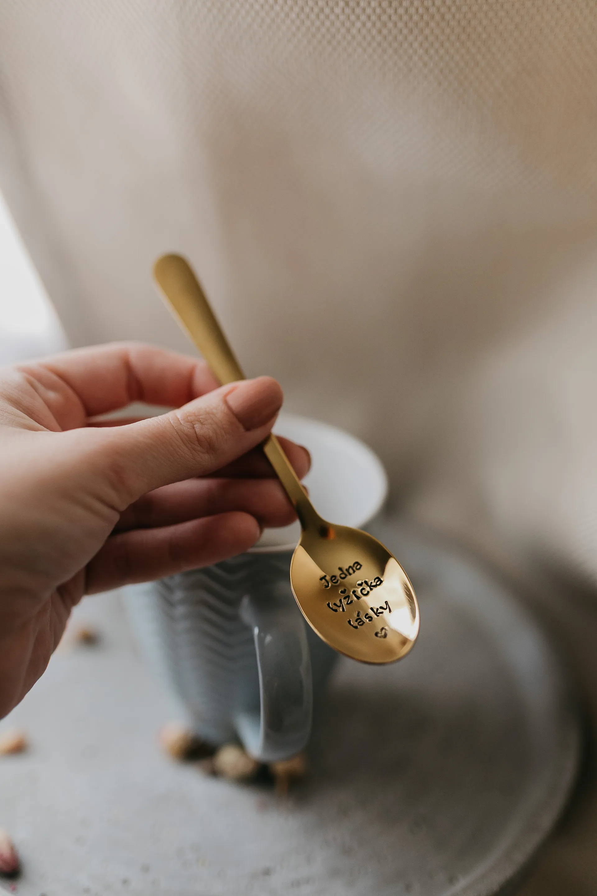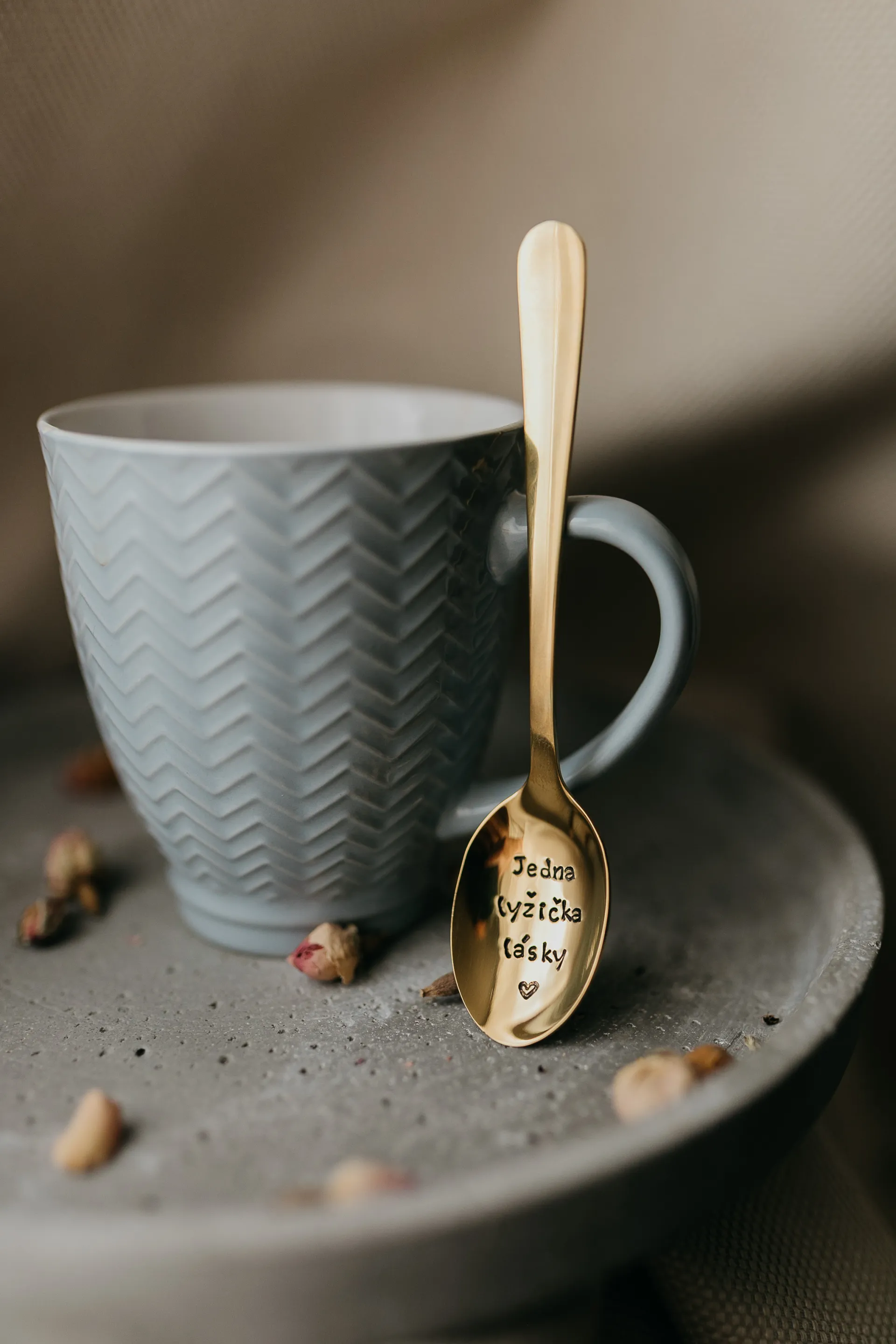 Lyžička vyrobená z ocele s dĺžkou 14 cm, teda čajovej veľkosti s ručne vyrazeným textom v dolnej naberacej časti. Ručne vyrazený text je "Jedna lyžička lásky". Pod textom je ešte vyrazený symbol srdiečka ako znak lásky.
