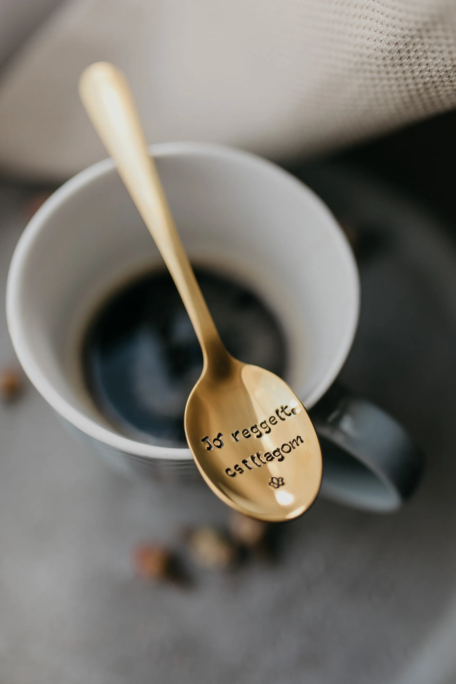 Lyžička vyrobená z ocele s dĺžkou 14 cm, teda čajovej veľkosti s ručne vyrazeným textom v dolnej naberacej časti. Ručne vyrazený text je "Jó reggelt, csillagom". Pod textom je ešte vyrazený symbol hviezdičky so smajlíkom vo vnútri.