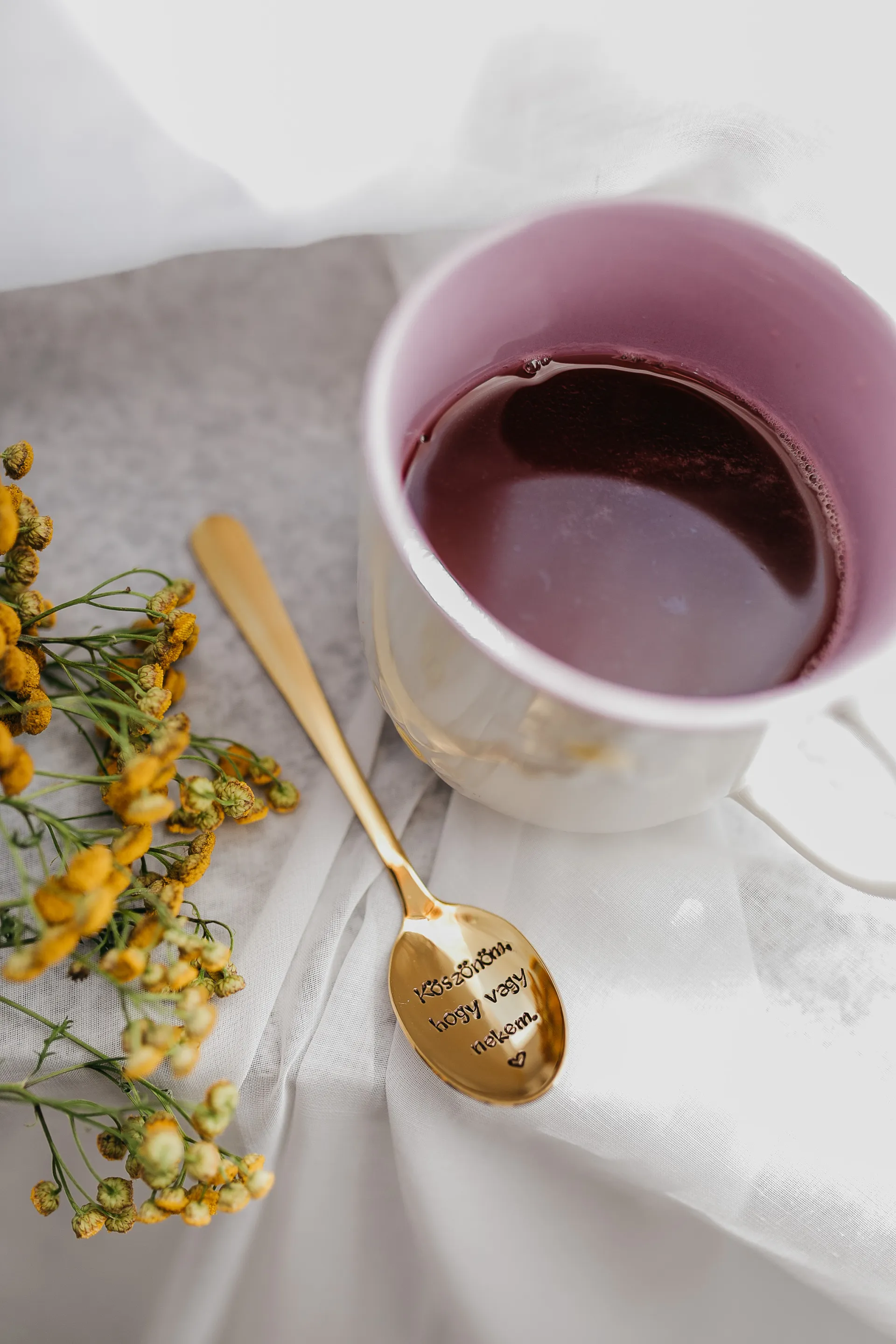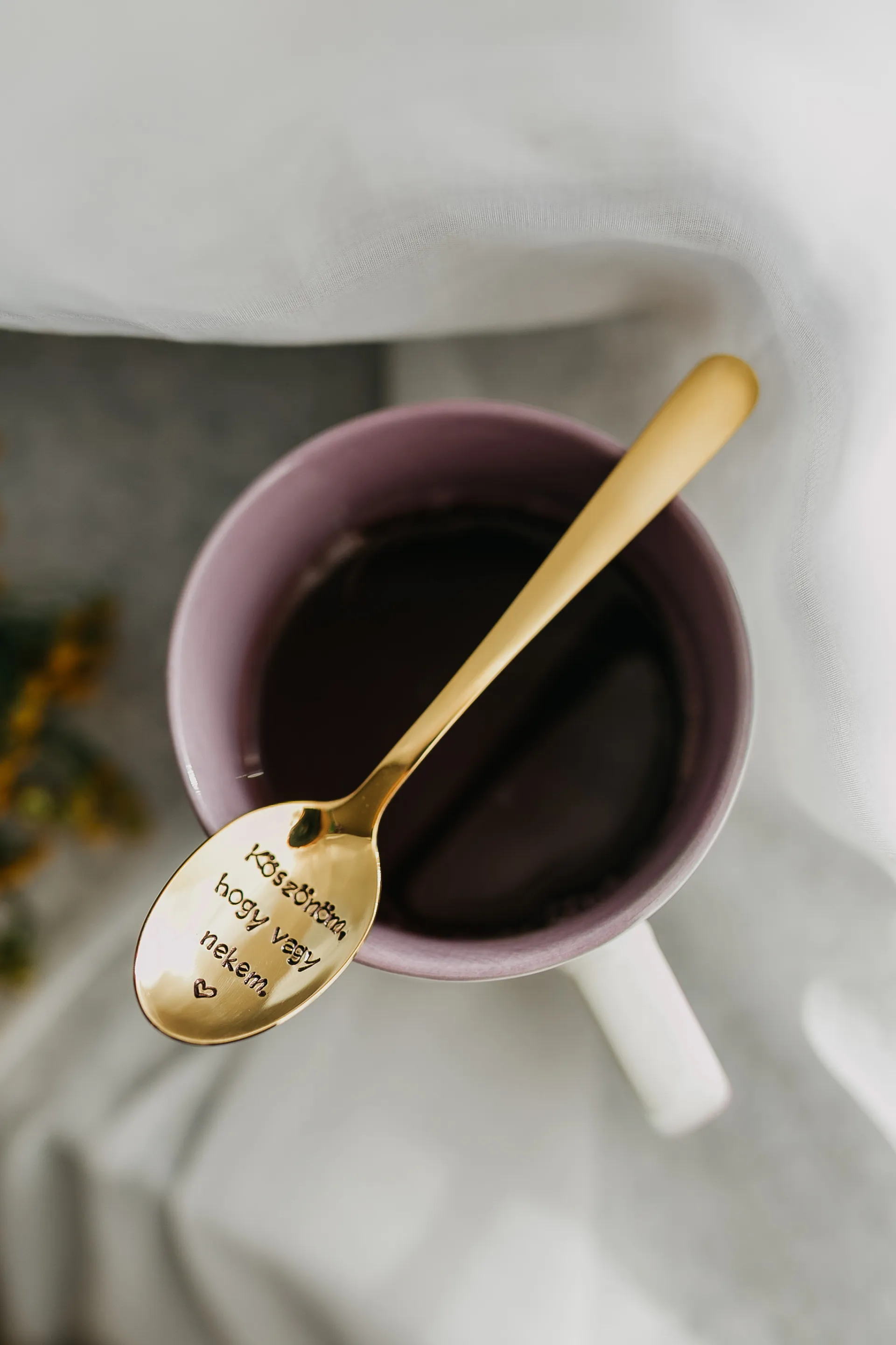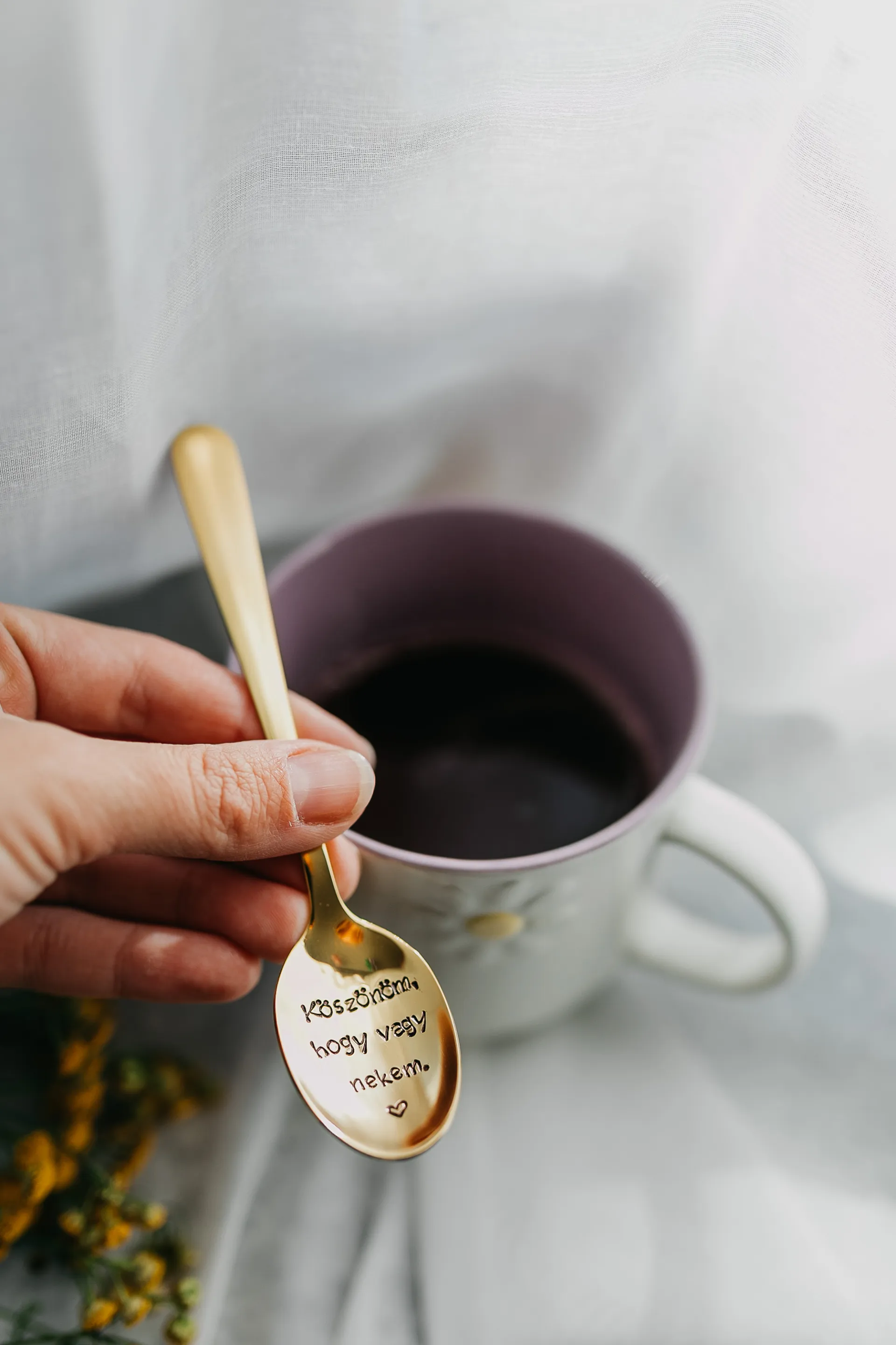 Lyžička vyrobená z ocele s dĺžkou 14 cm, teda čajovej veľkosti s ručne vyrazeným textom v dolnej naberacej časti. Ručne vyrazený text je "Köszönöm, hogy vagy nekem". Pod textom je ešte vyrazený symbol srdiečka.