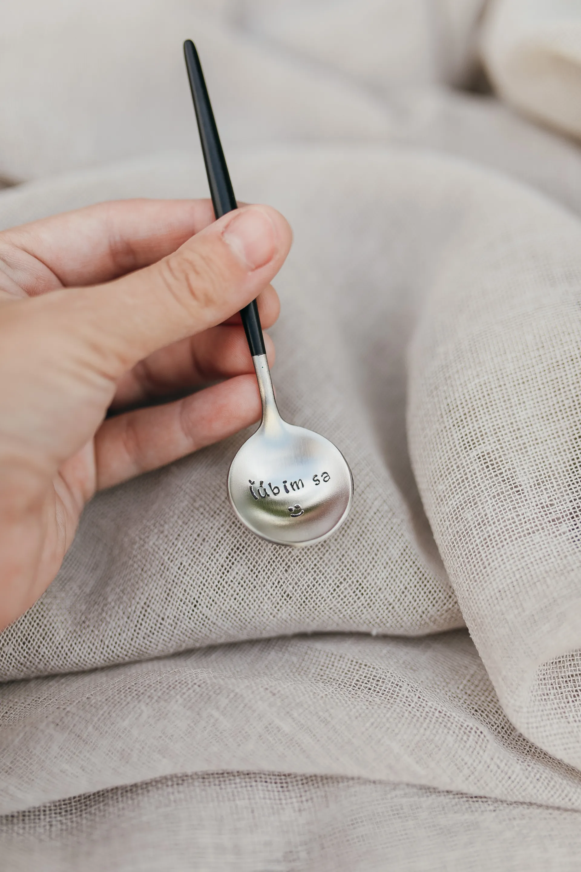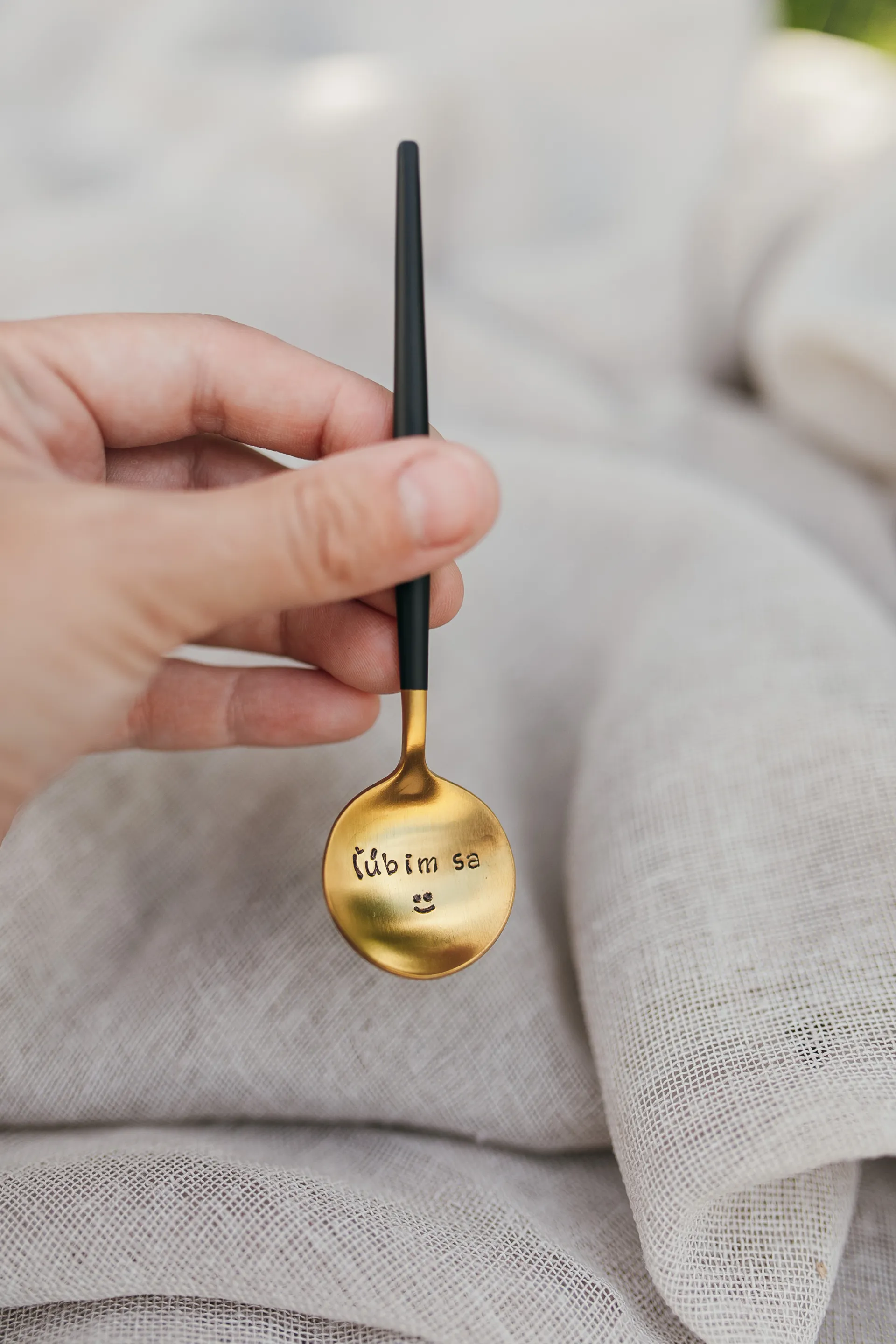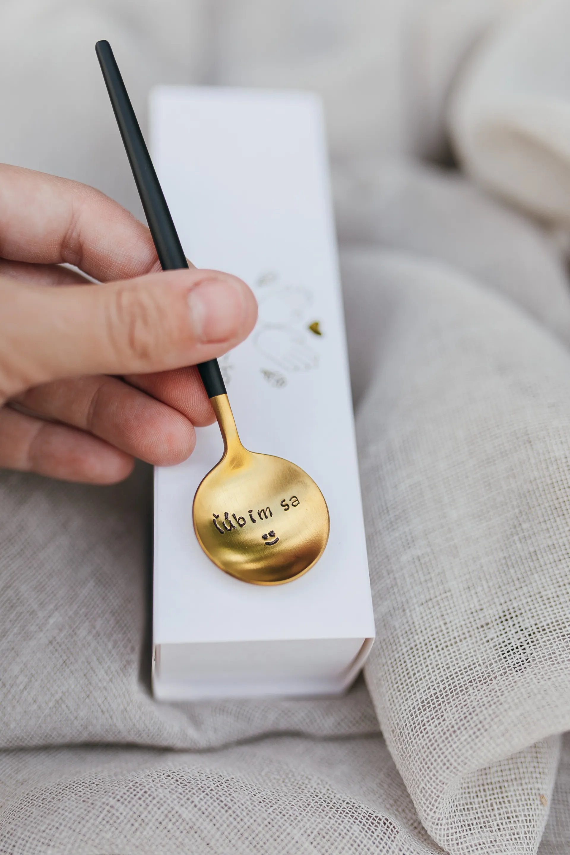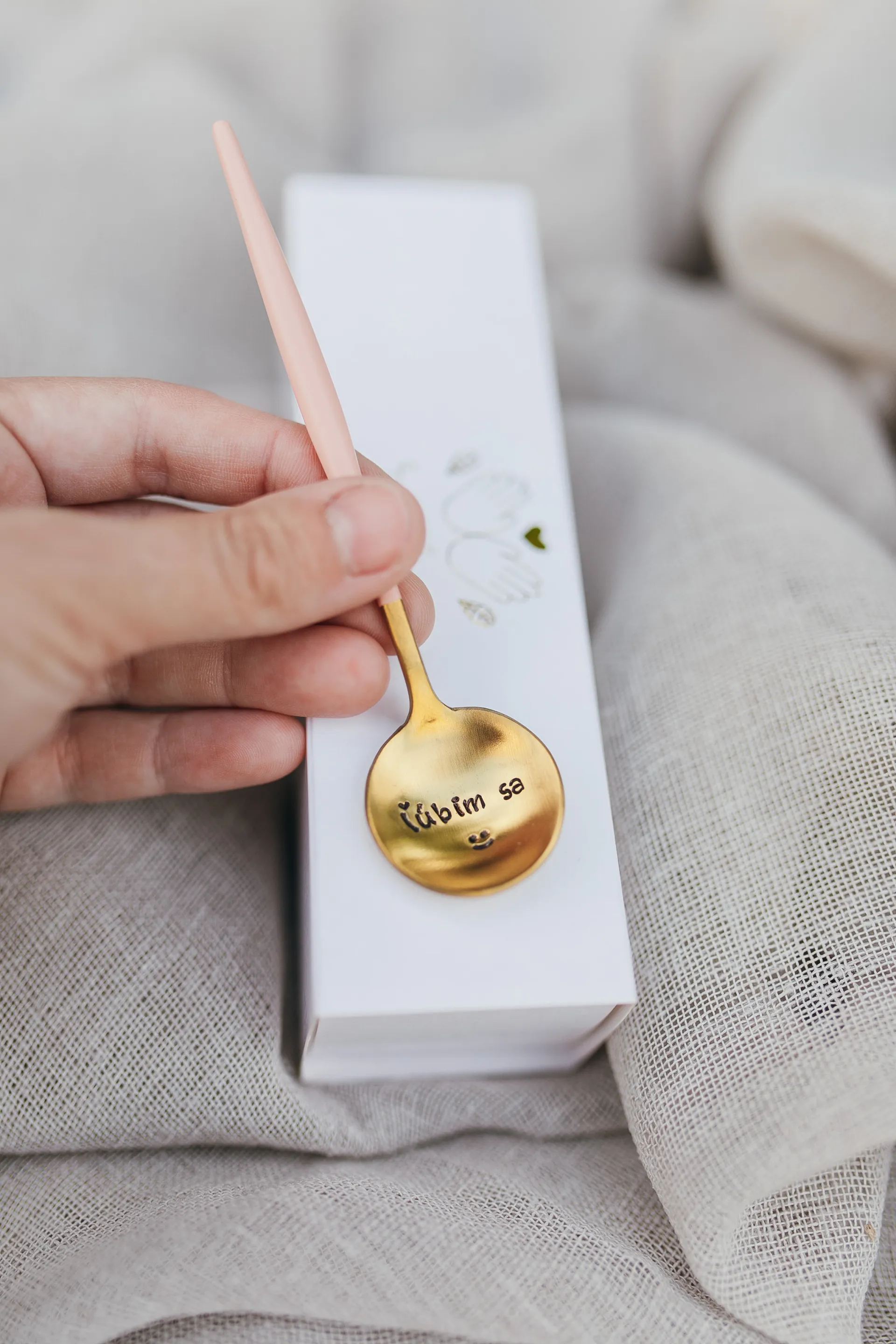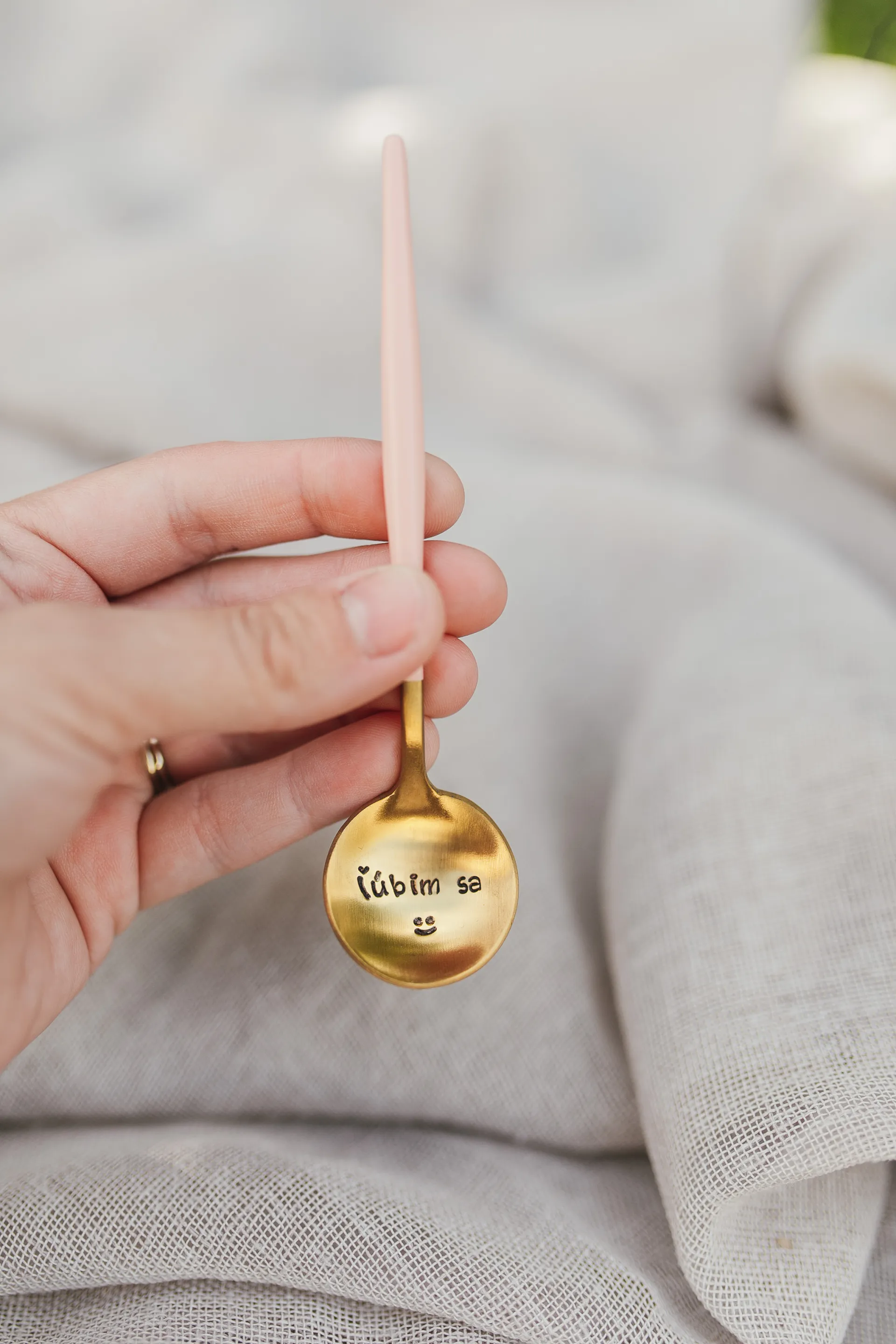 Lyžička s ručne vyrazeným textom "ľúbim sa". Pod textom je ručne vyrazený symbol úsmevu.