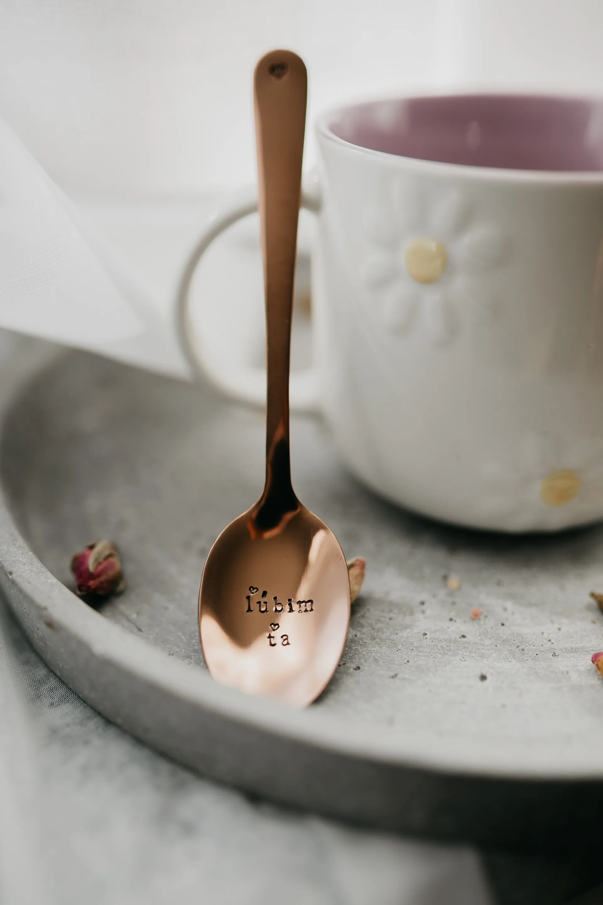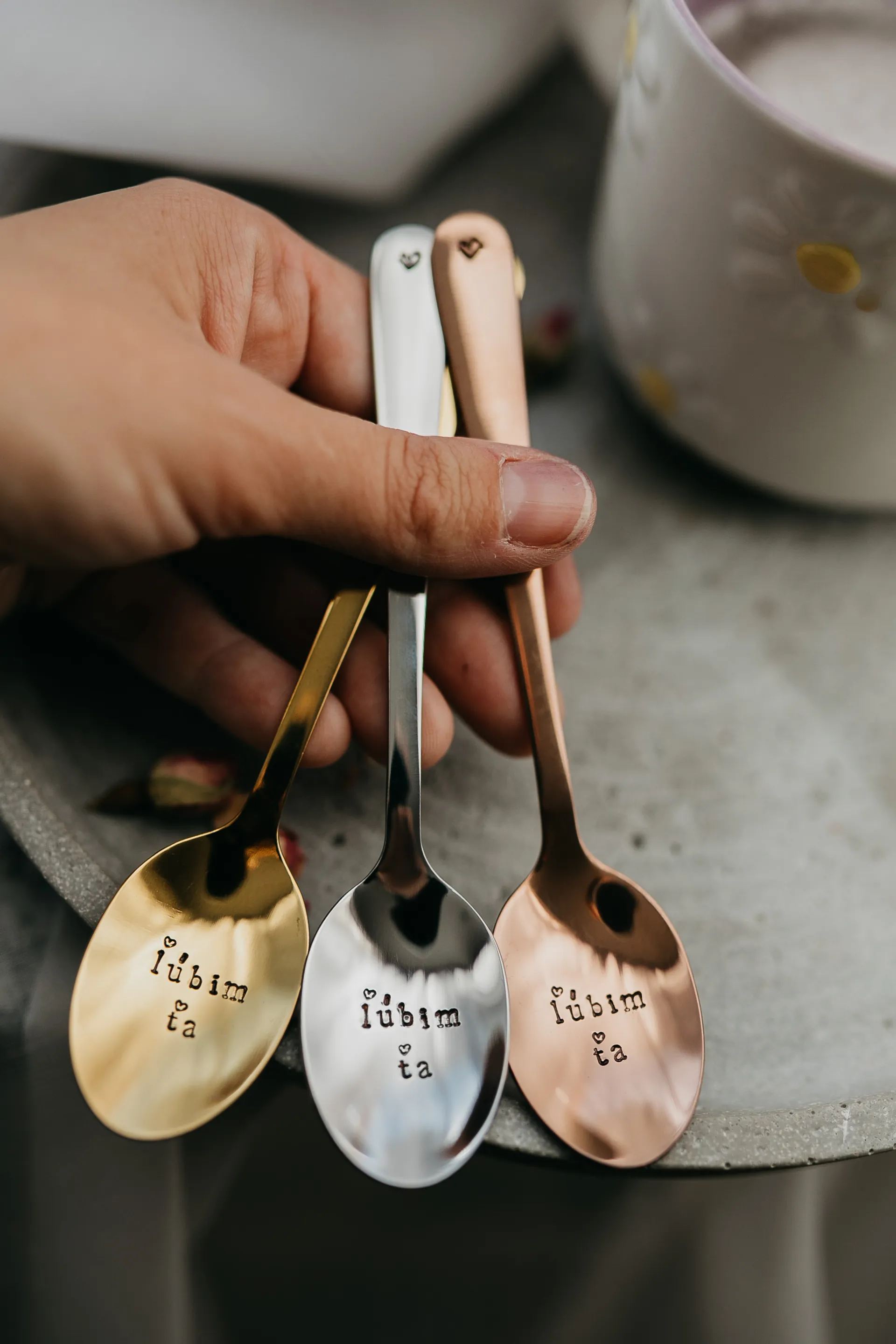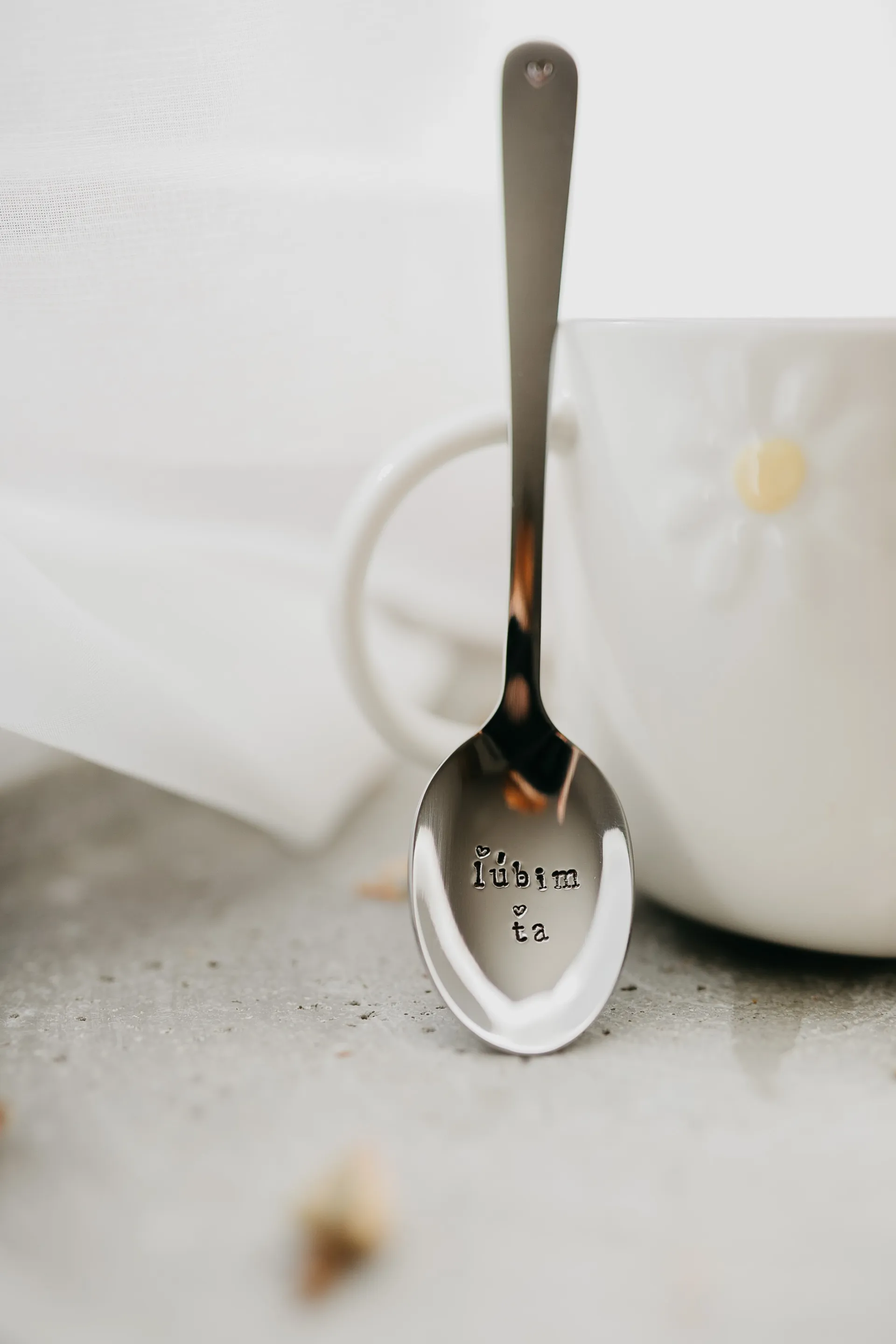Lyžička vyrobená z ocele s ručne vyrazeným textom v dolnej naberacej časti lyžičky "ľúbim ťa". Na rúčke lyžičky je ručne vyrazený symbol srdiečka. namiesto mäkčeňov sú na lyžičke ručne vyrazené malé srdiečka. Jedna sa o čajovú lyžičku s dĺžkou 14cm.