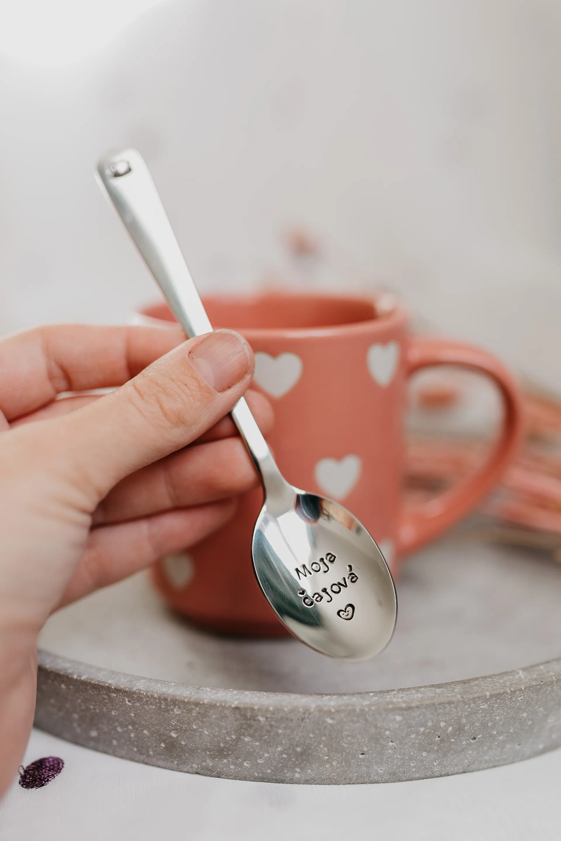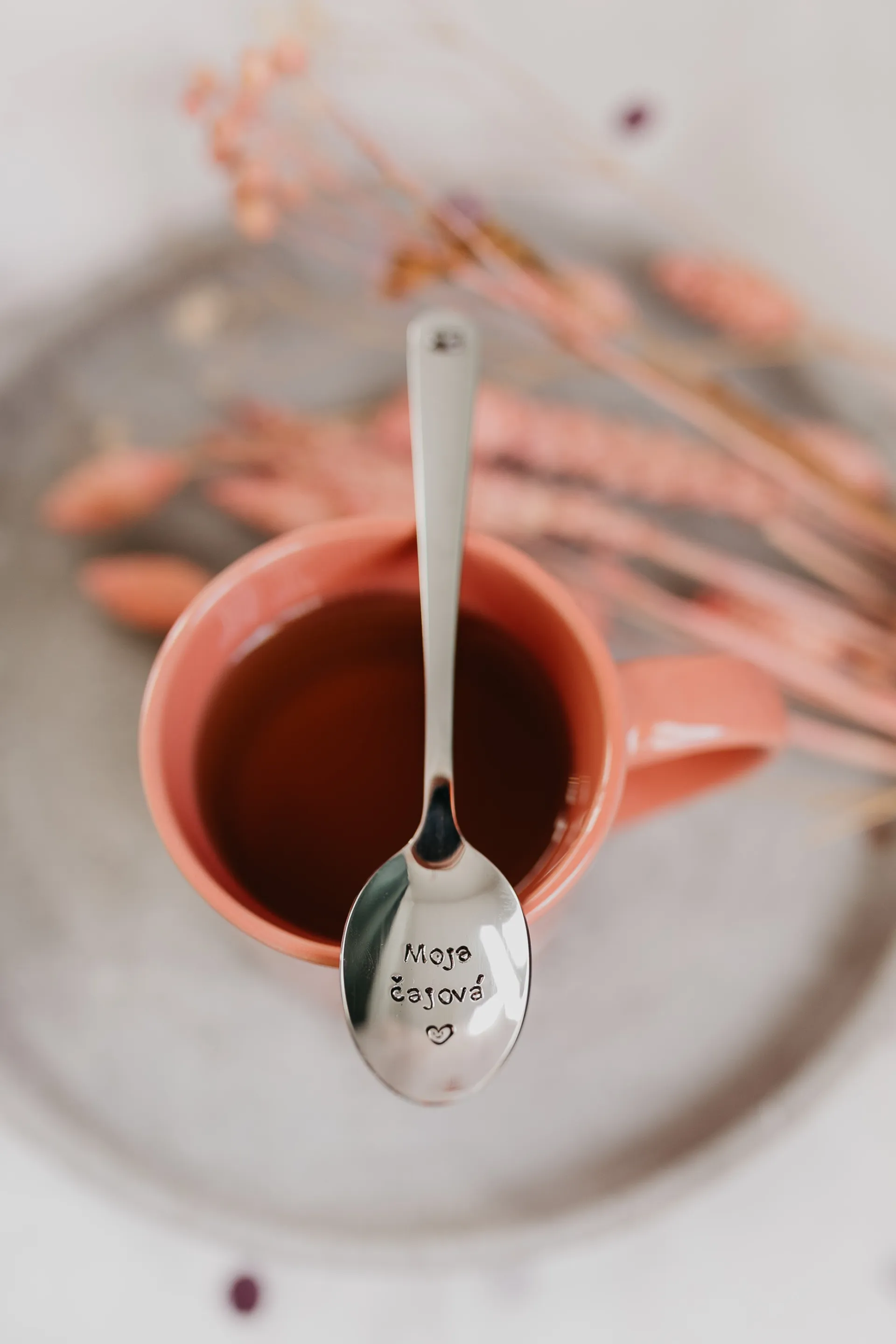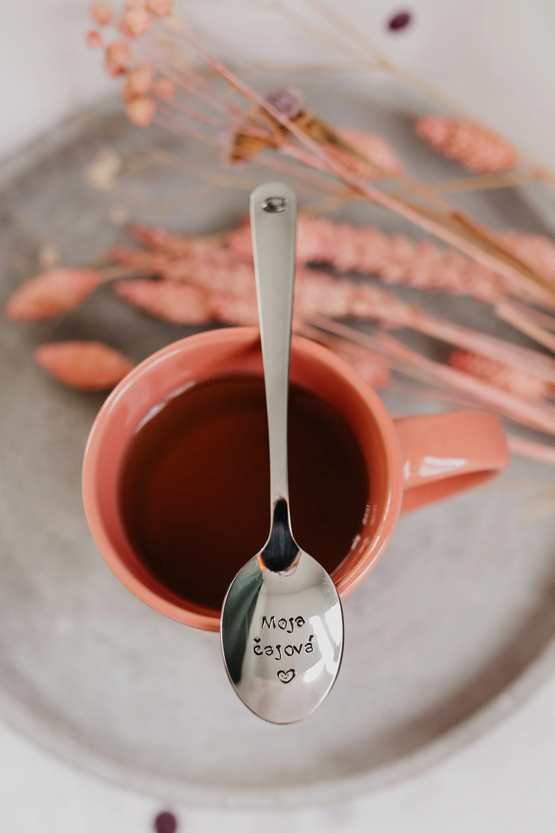 Lyžička vyrobená z ocele s dĺžkou 14 cm, teda čajovej veľkosti s ručne vyrazeným textom v dolnej naberacej časti. Ručne vyrazený text je "Moja čajová". Pod textom je ešte vyrazený symbol srdiečka so smajlíkom a na rúčke lyžičky je vyrazený symbol šálky.