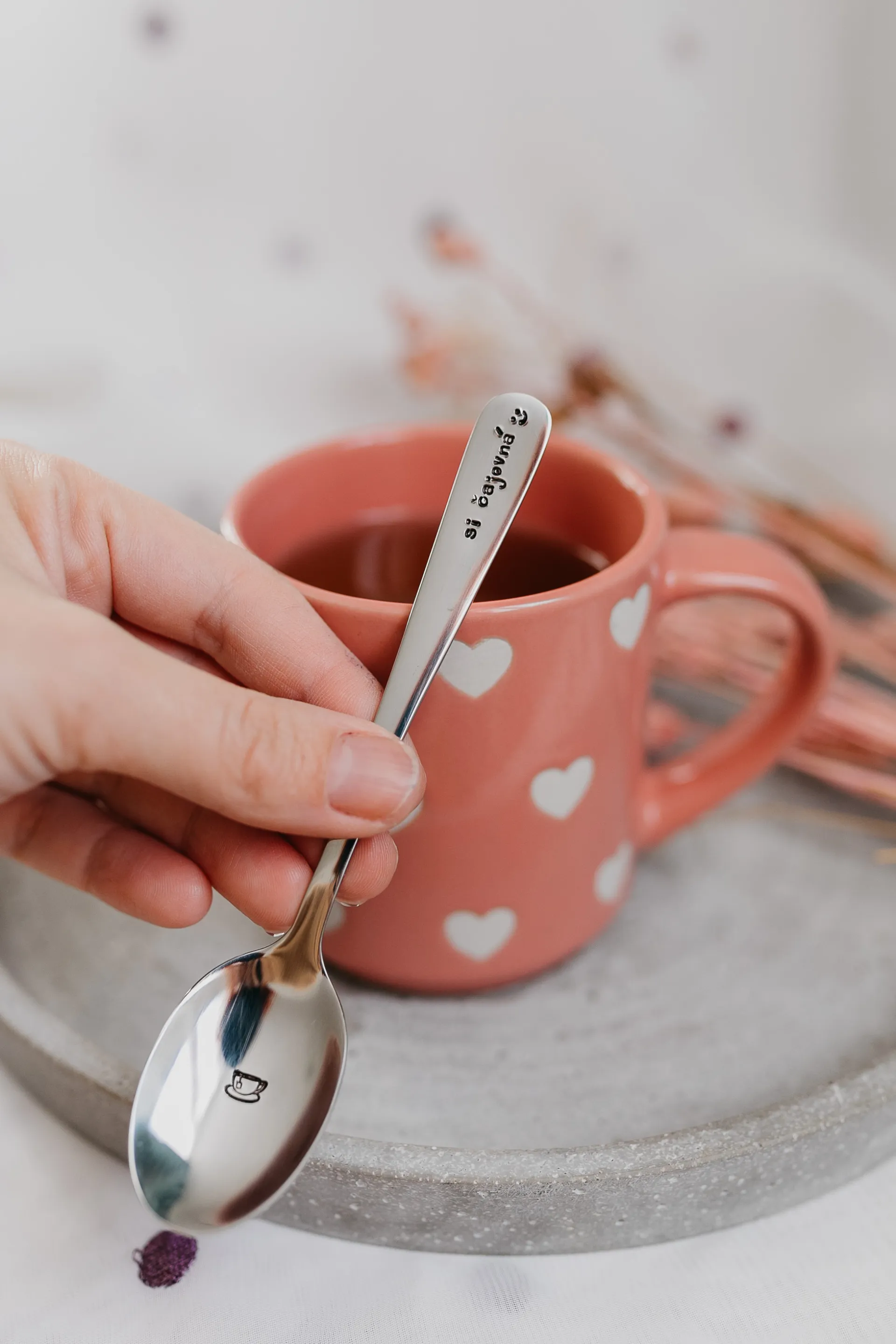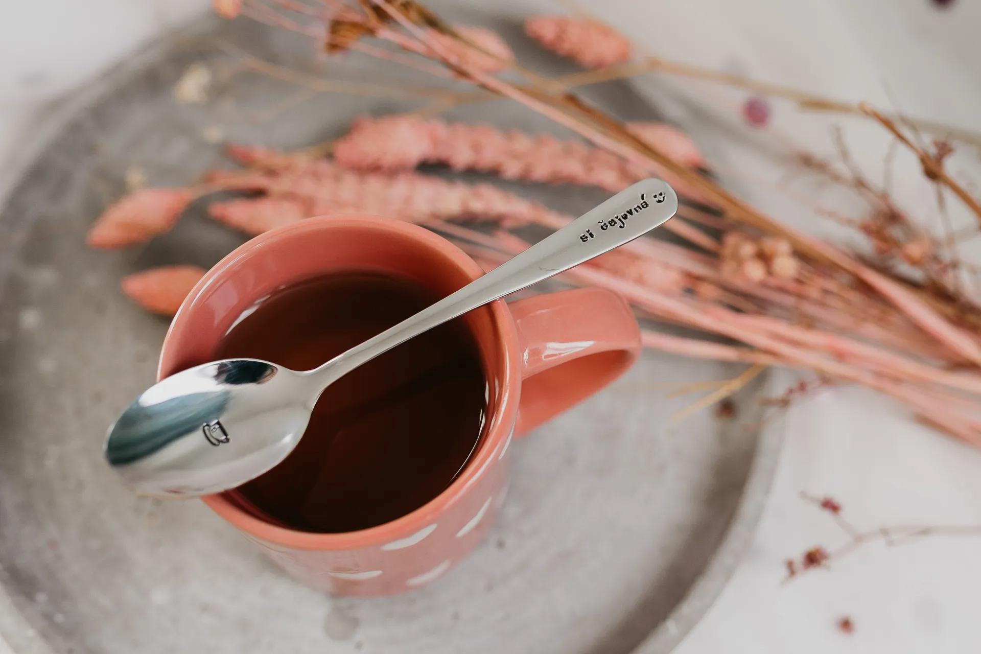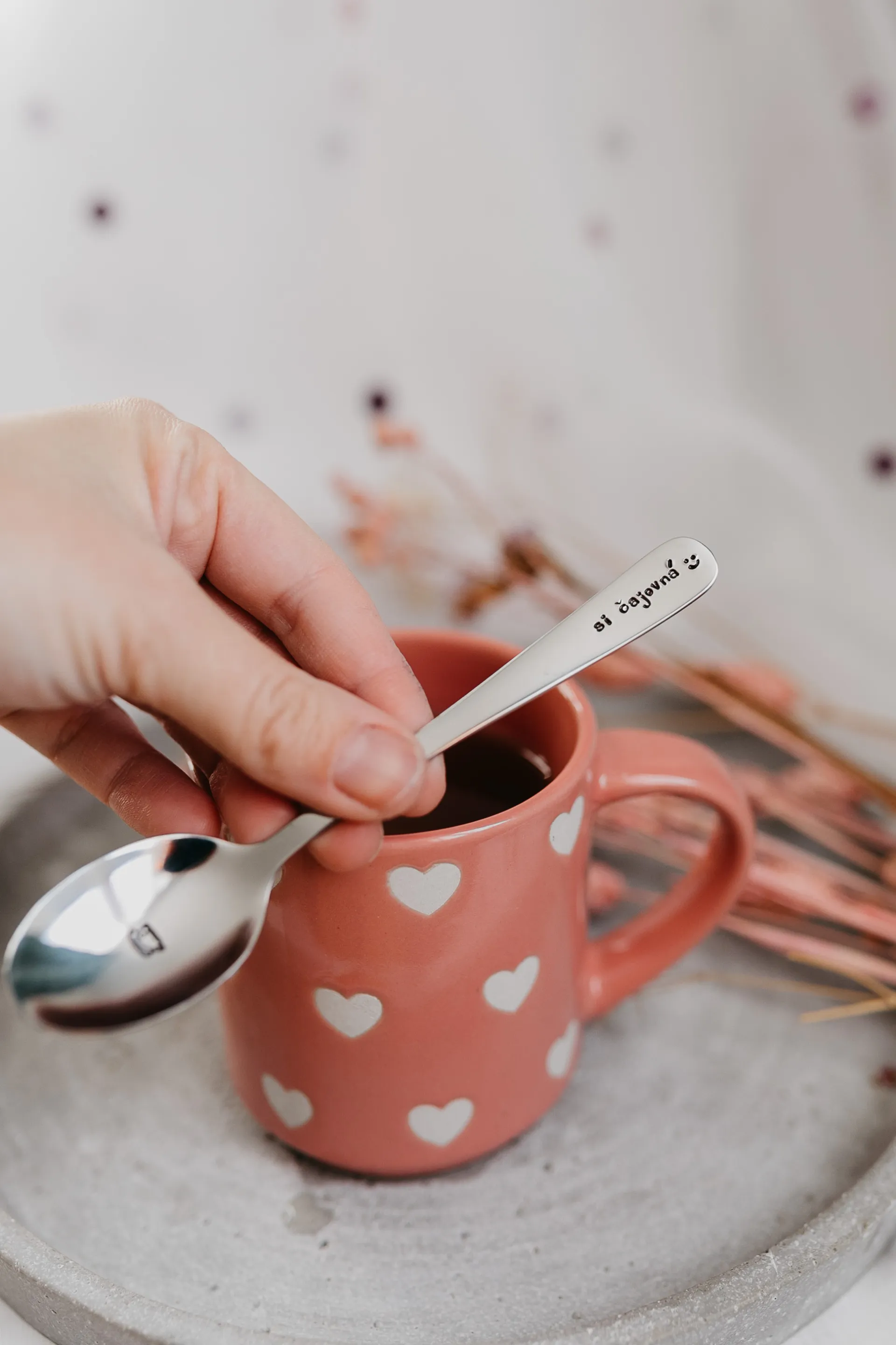 Lyžička vyrobená z ocele s dĺžkou 14 cm, teda čajovej veľkosti s ručne vyrazeným textom na rúčke lyžičky "si čajovná :) " a vyrazeným symbolom šálky v dolnej naberacej časti .
