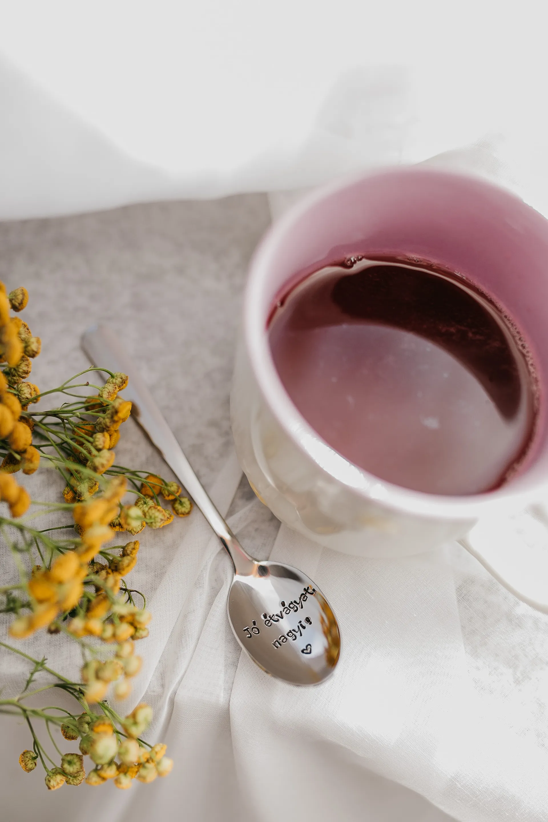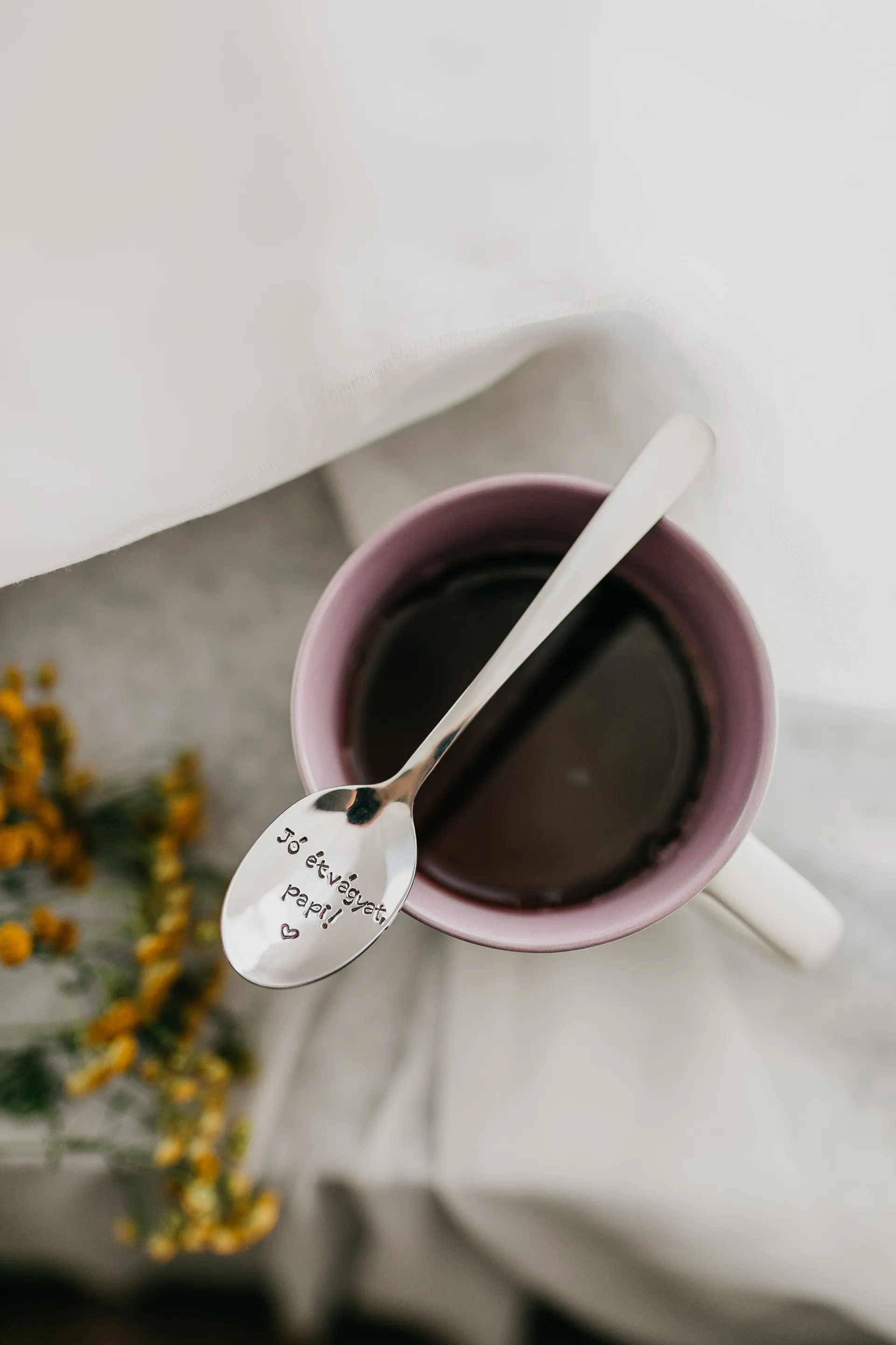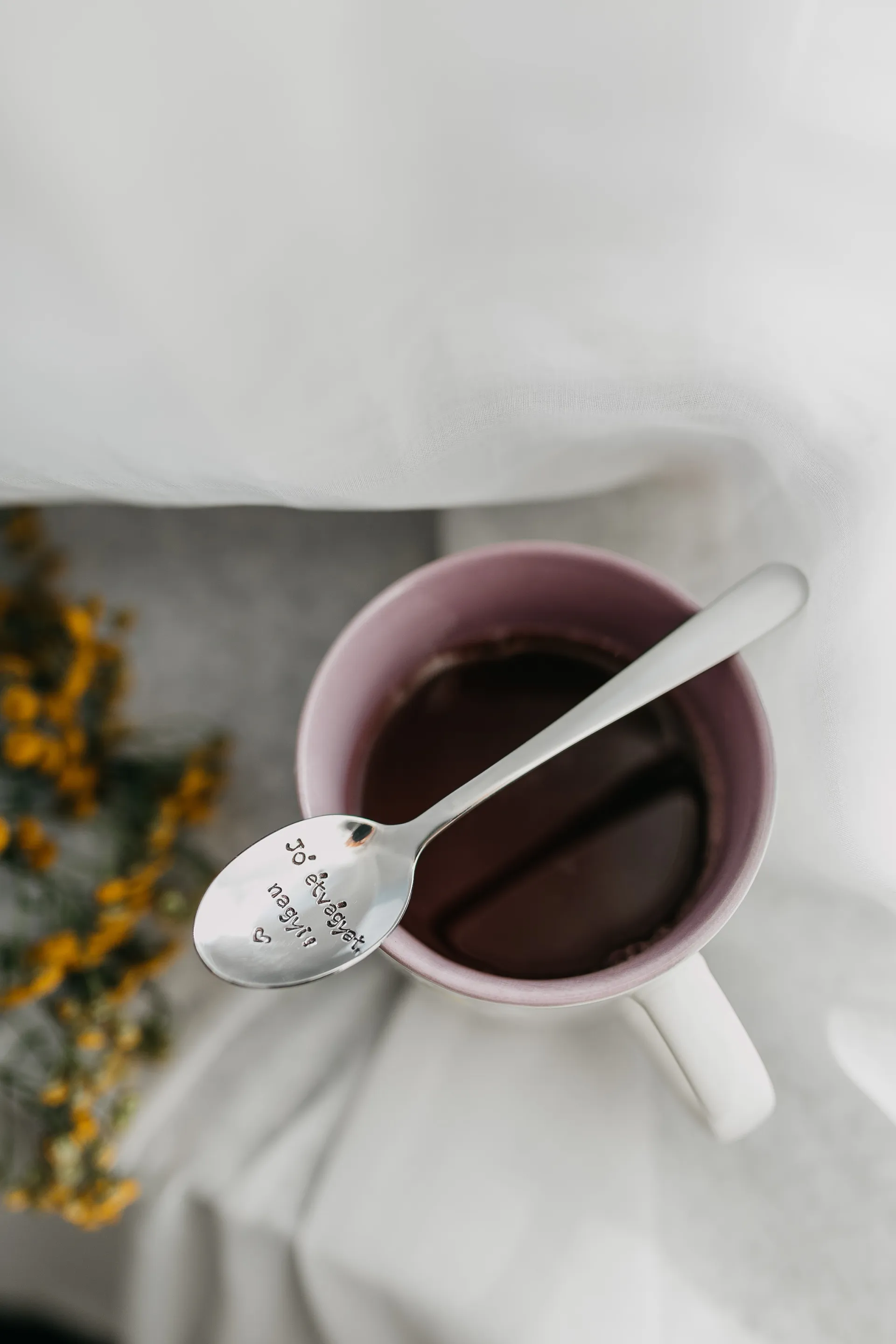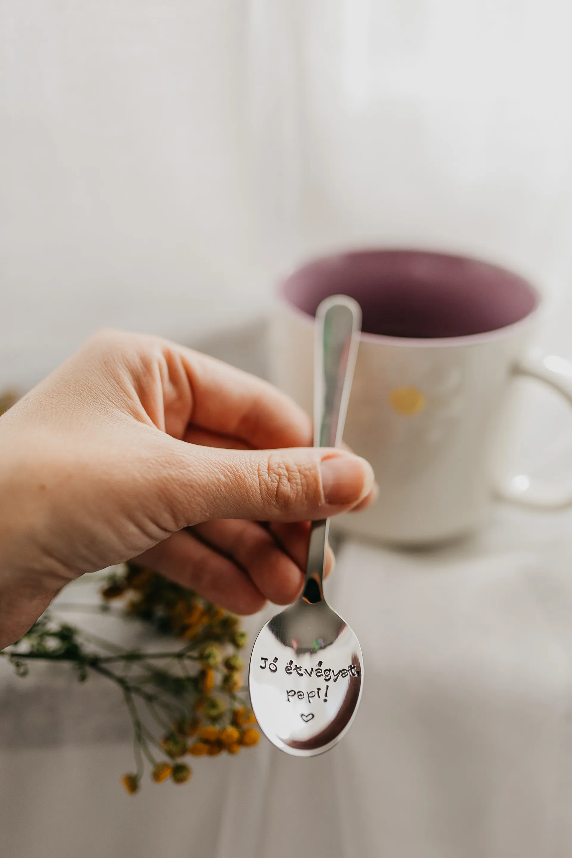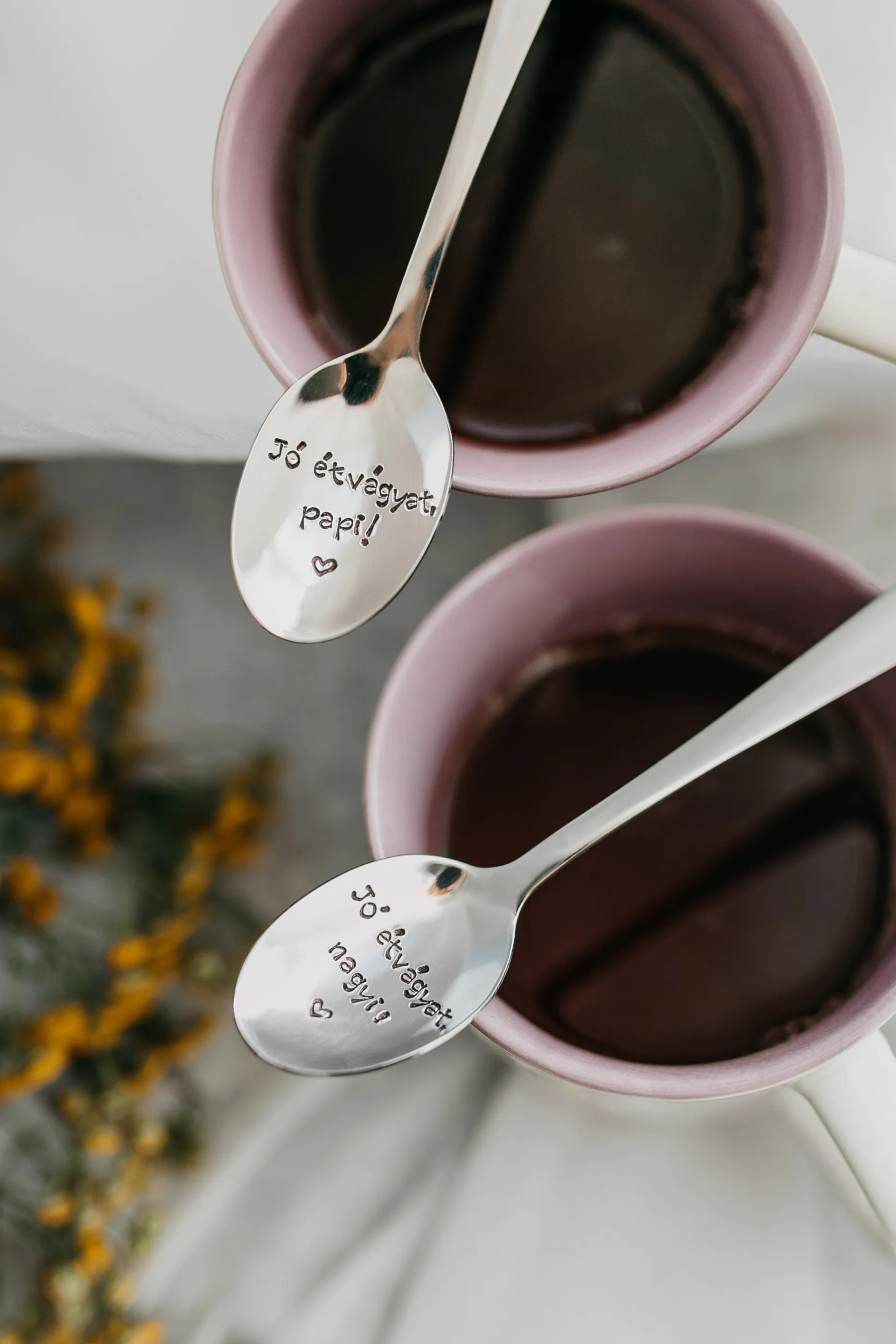 Lyžičky vyrobené z materiálu oceľ čajovej veľkosti s dĺžkou 14 cm. na prvej lyžičke je ručne vyrazený text „Jó etvágyat papi“. Na druhej lyžičke je ručne vyrazený text „Jó etvágyat nagyi“. Pod oboma textami je ručne vyrazený symbol srdca.