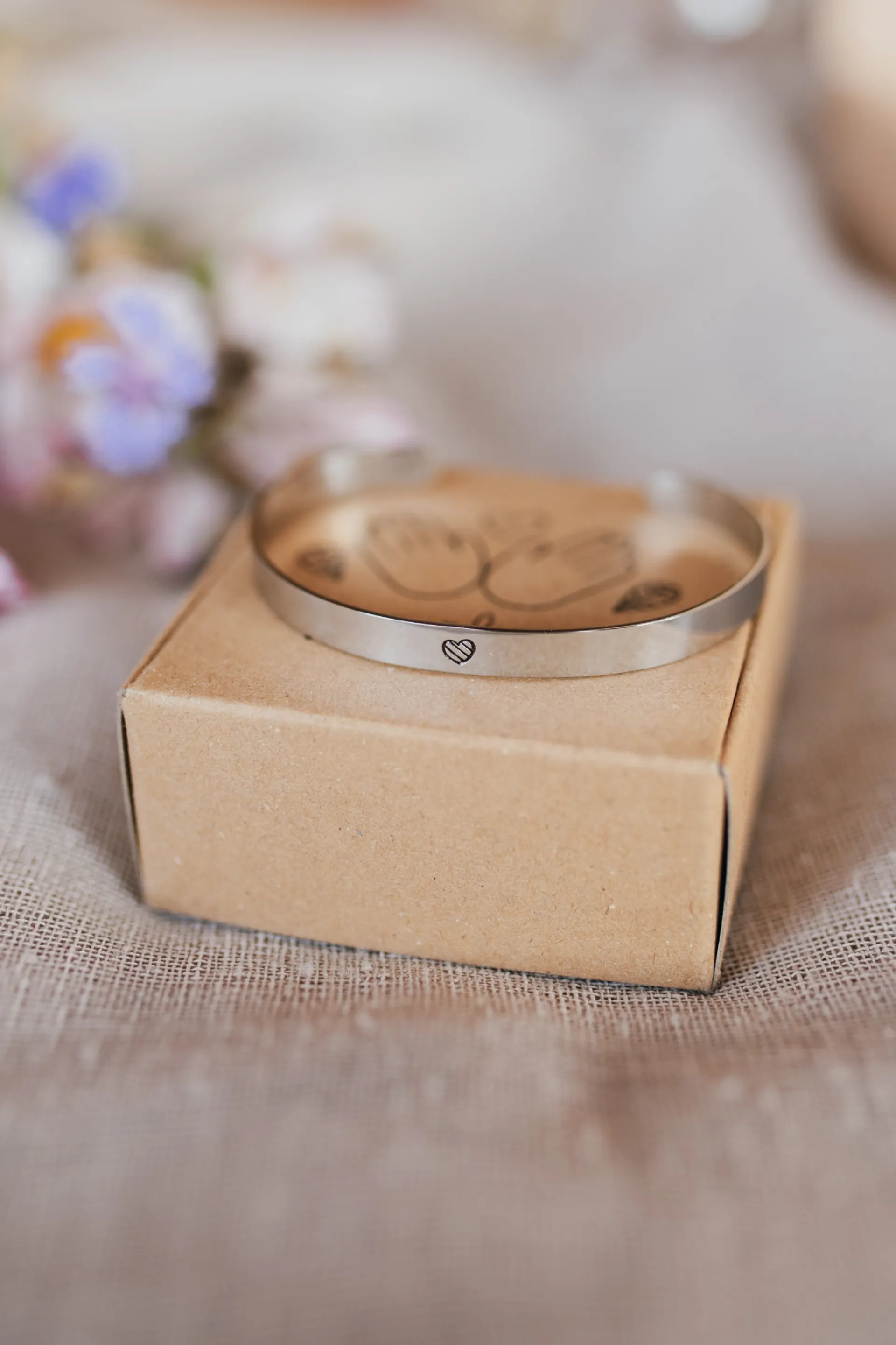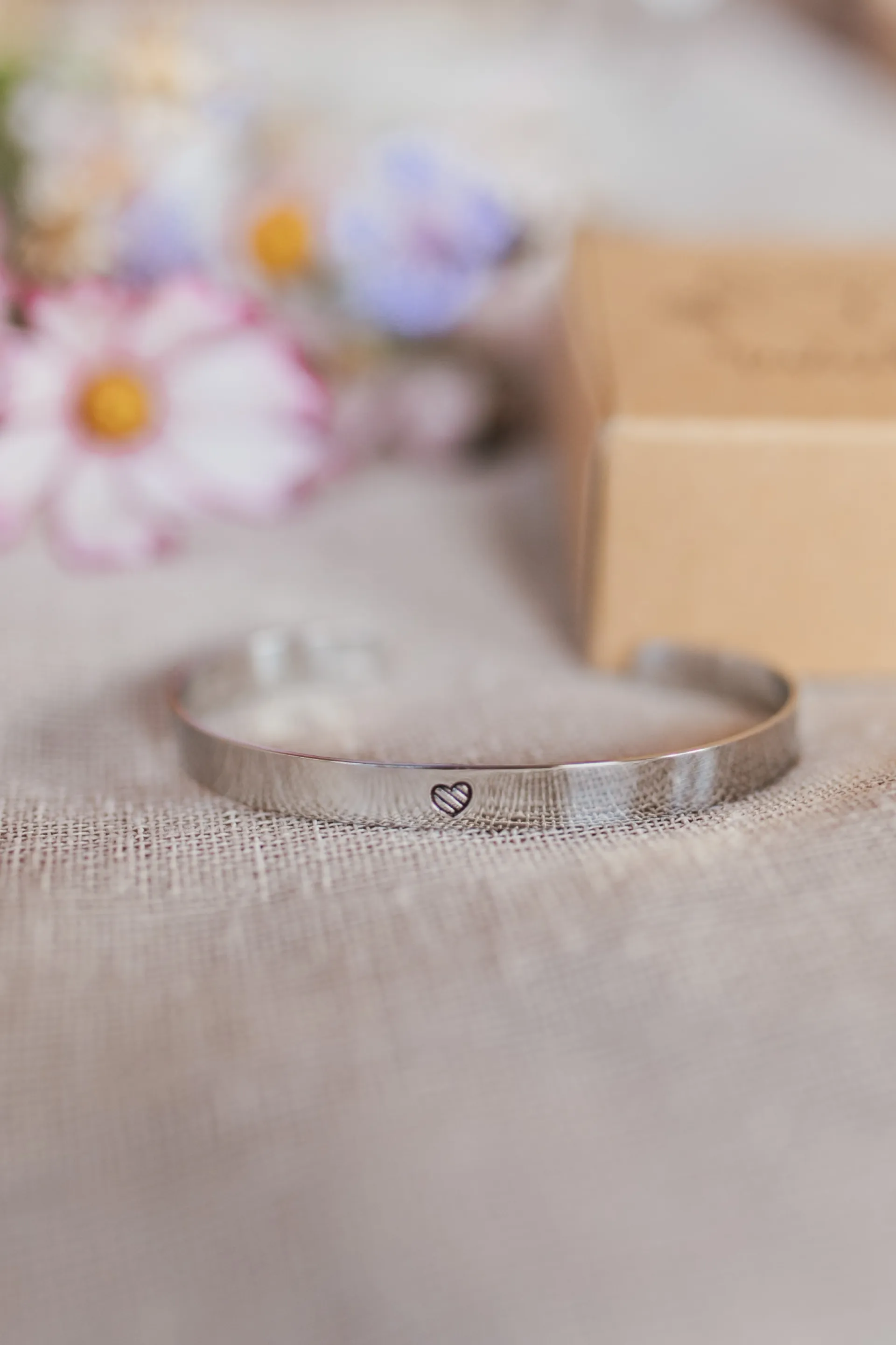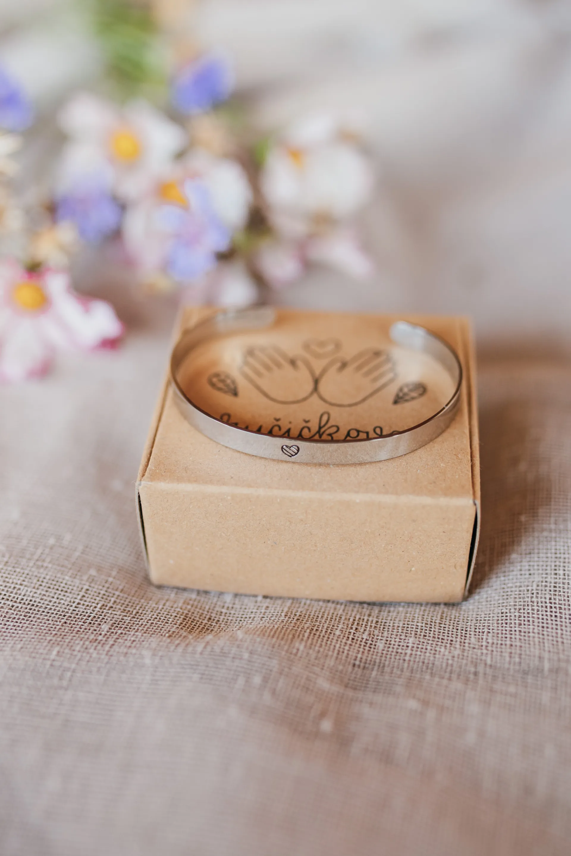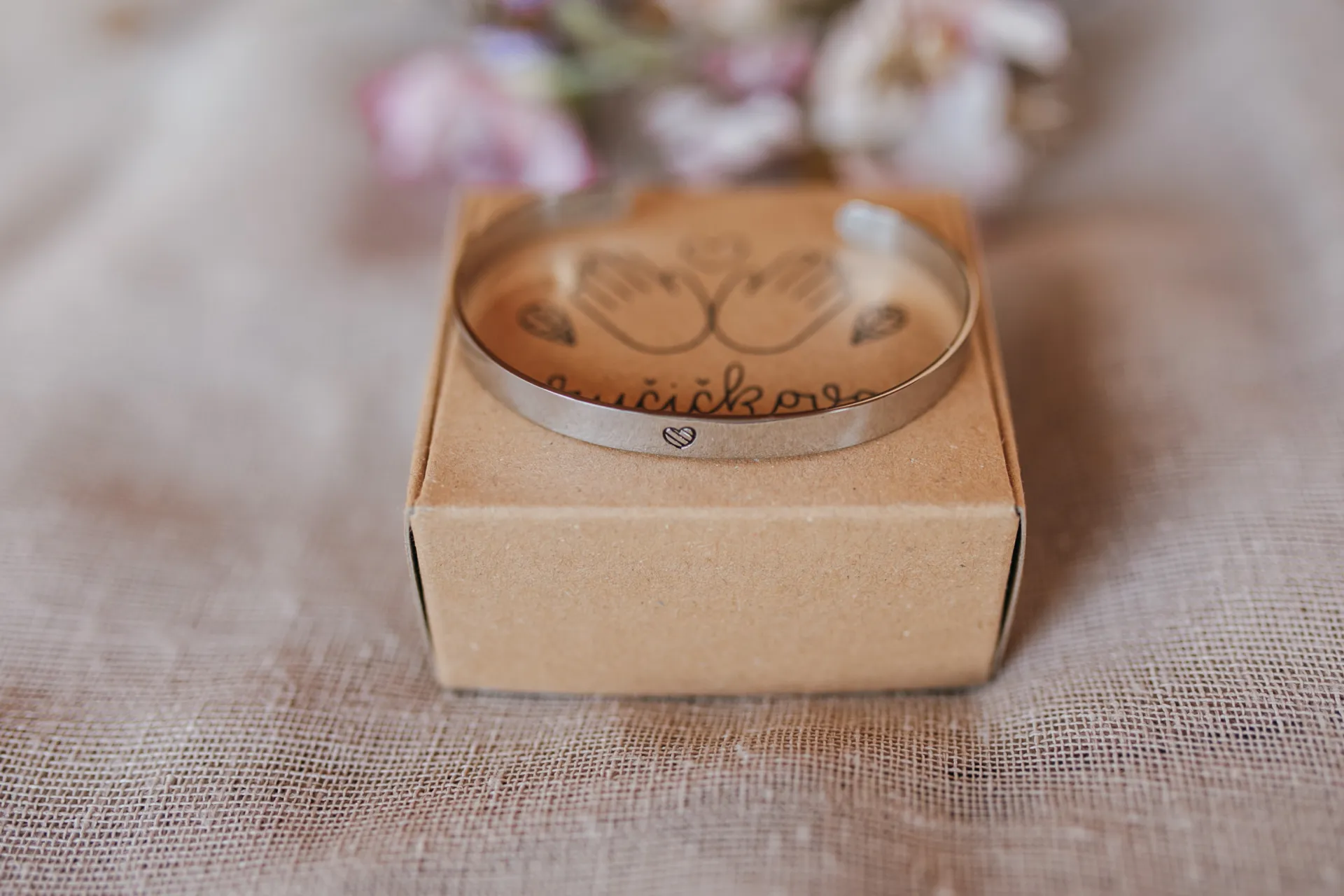Náramok z mateirálu oceľ alebo mosadz s ručne vyrazeným symbolom "srdce". Symbol je ručne vyrazený na prednej strane náramku v strednej časti.