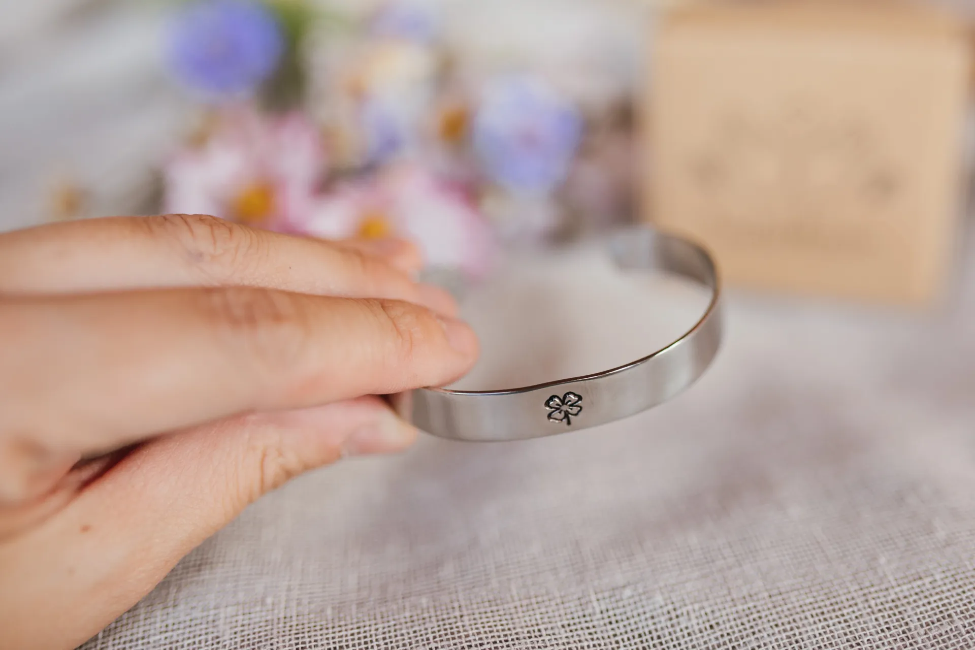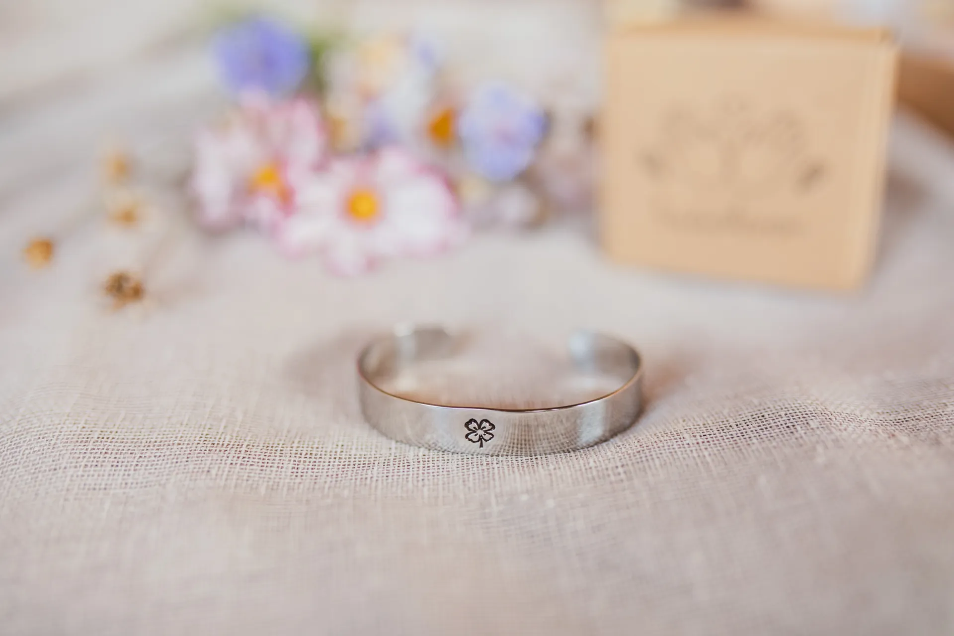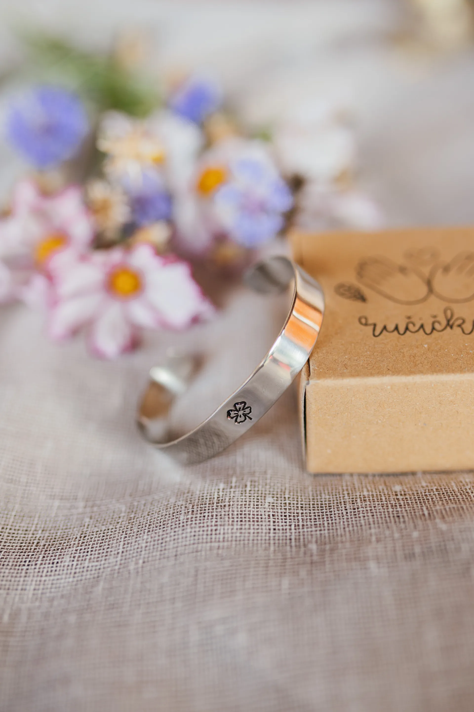 Náramok z materiálu oceľ alebo mosadz s ručne vyrazeným symbolom "Štvorlístok". Symbol je ručne vyrazený na prednej strane náramku v strednej časti.