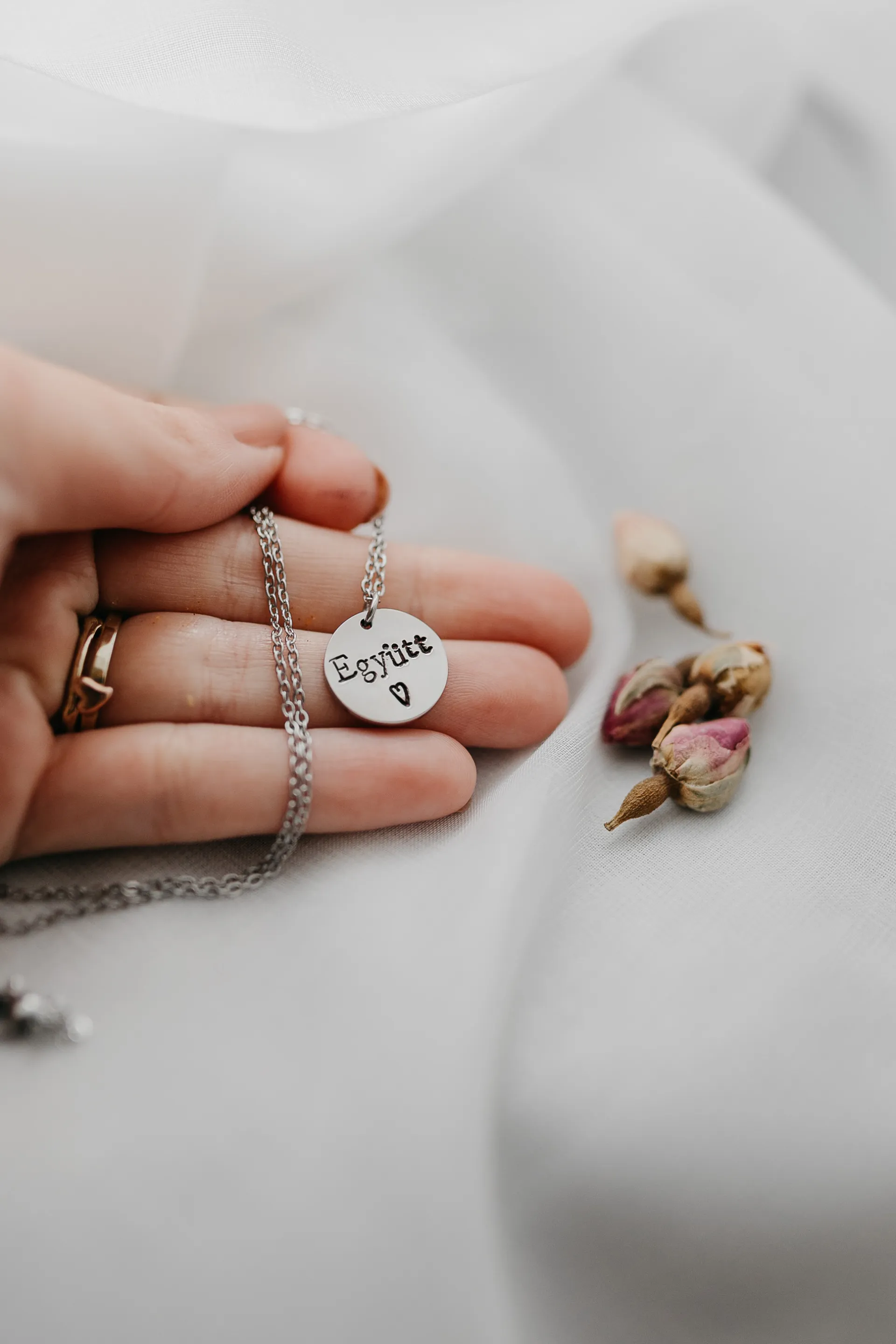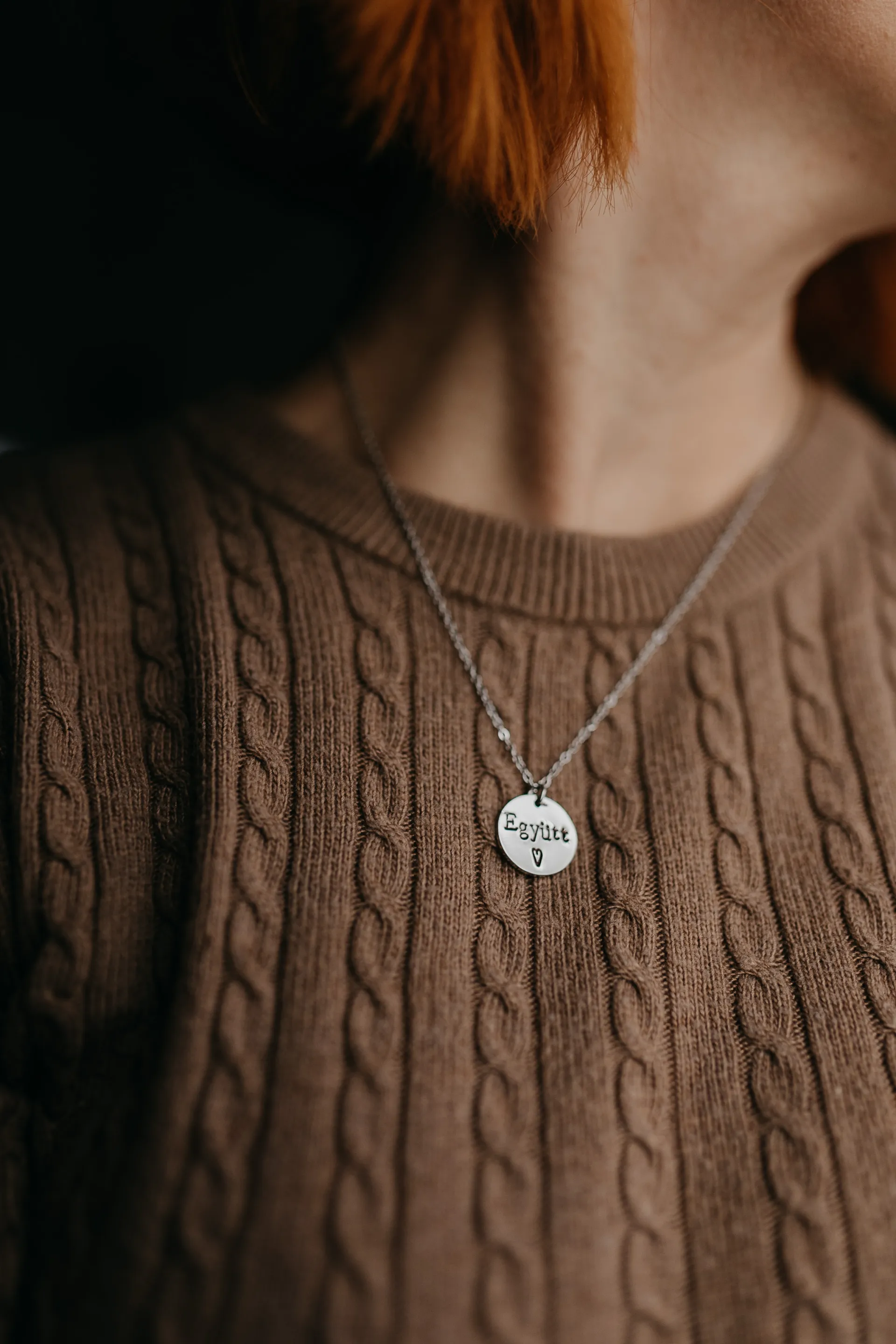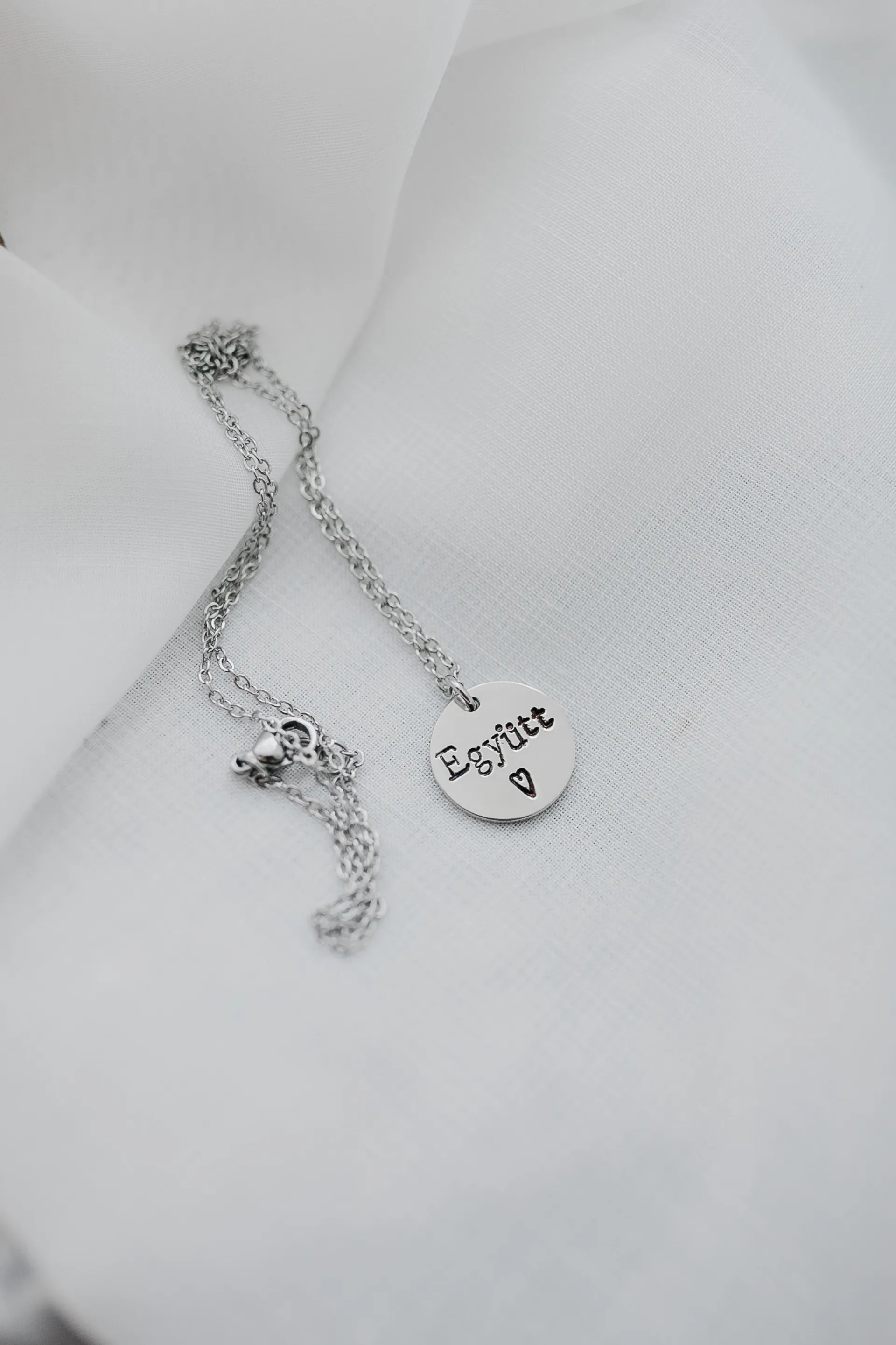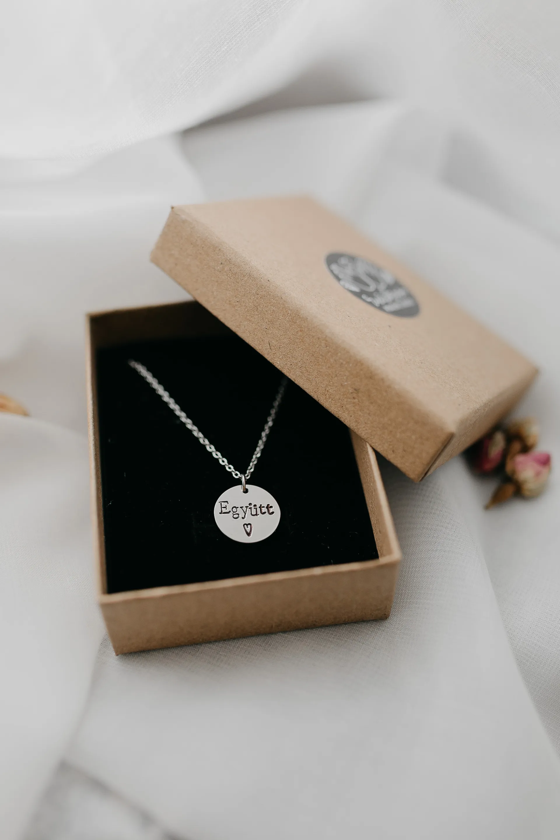 Prívesok na retiazku vyrobený z nerezovej ocele striebornej farby s ručne vyrazeným textom „Együtt“.