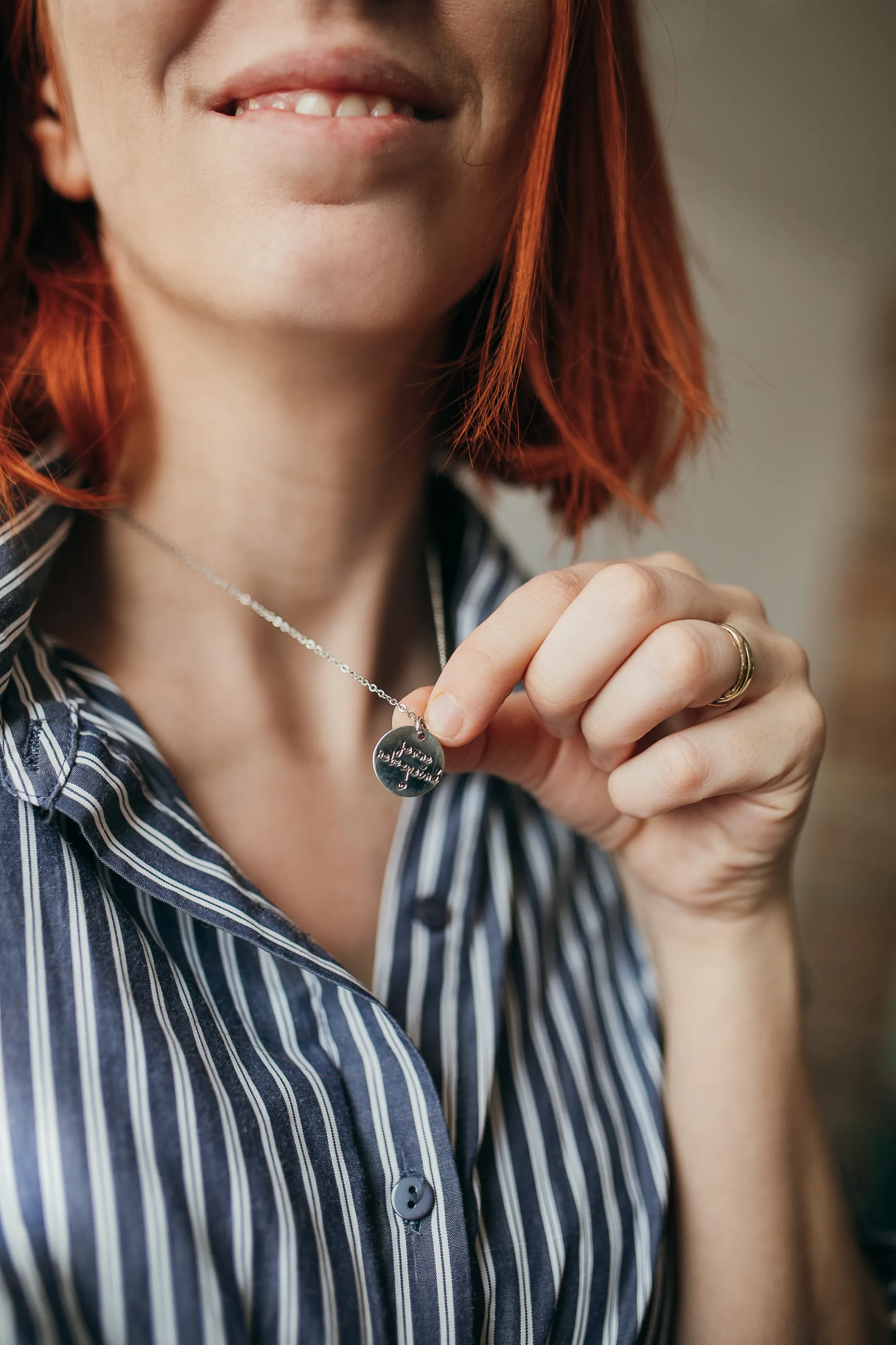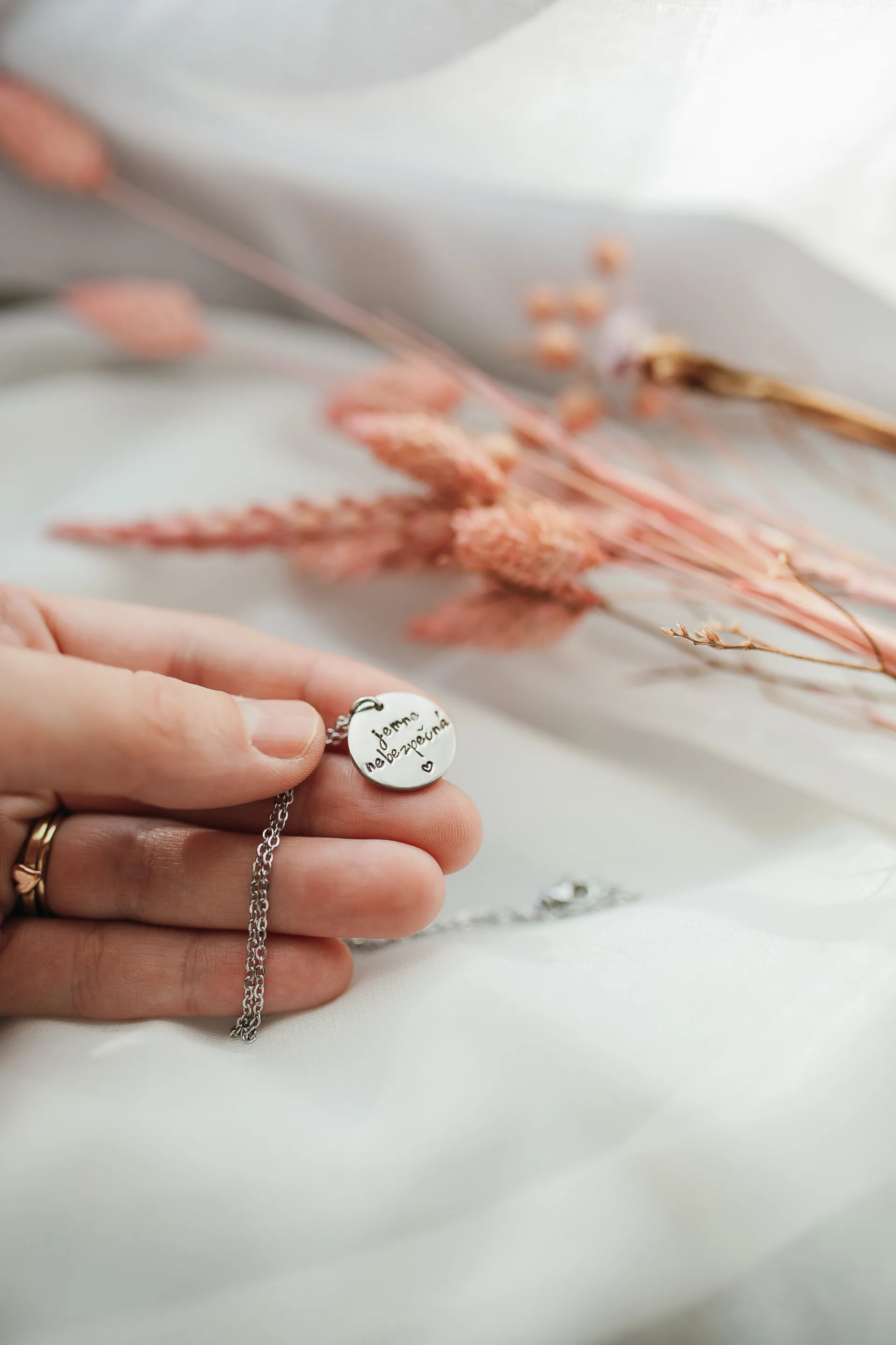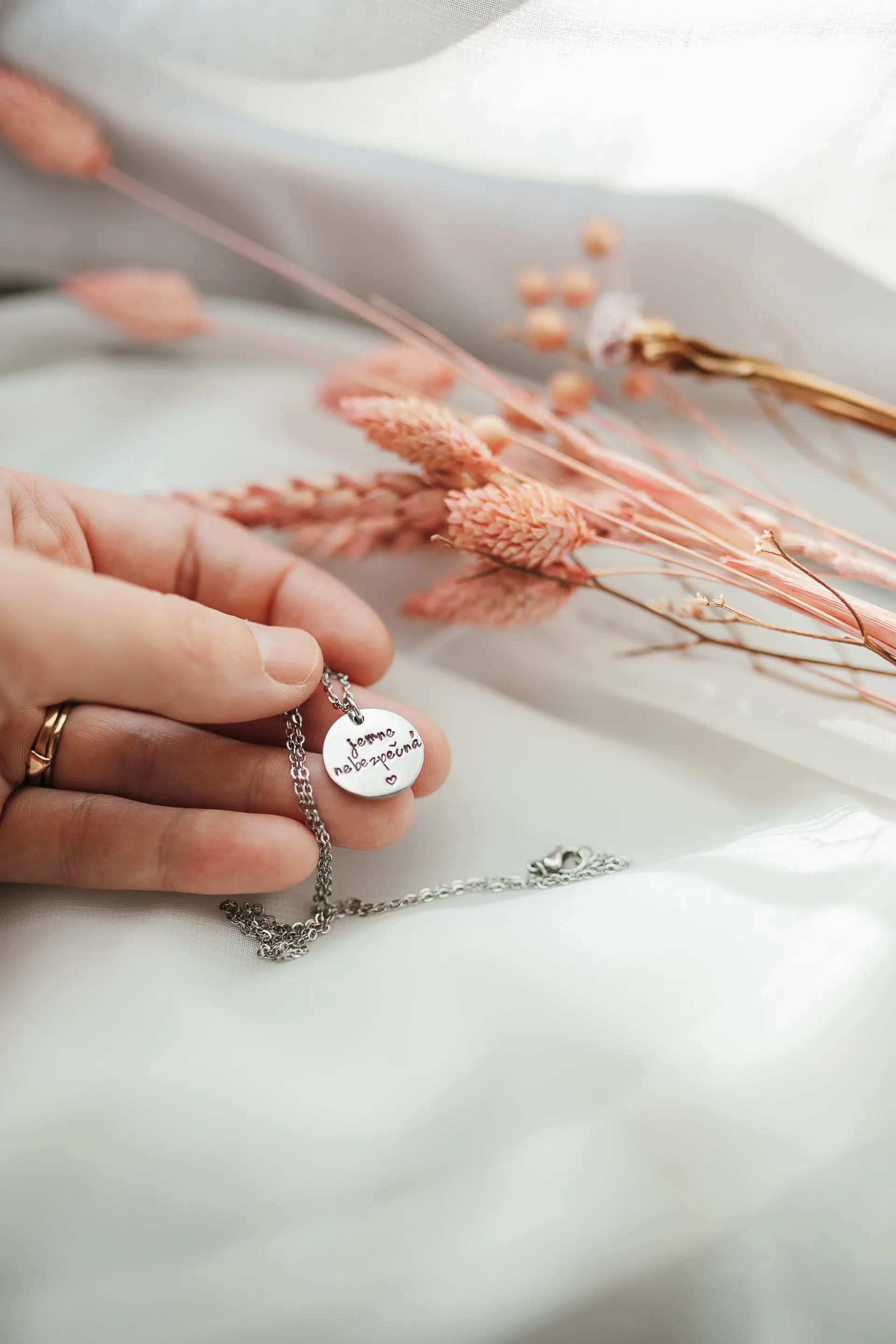 Prívesok na retiazku vyrobený z nerezovej ocele striebornej farby s ručne vyrazeným textom „jemne nebezpečná" a srdiečkom pod textom.