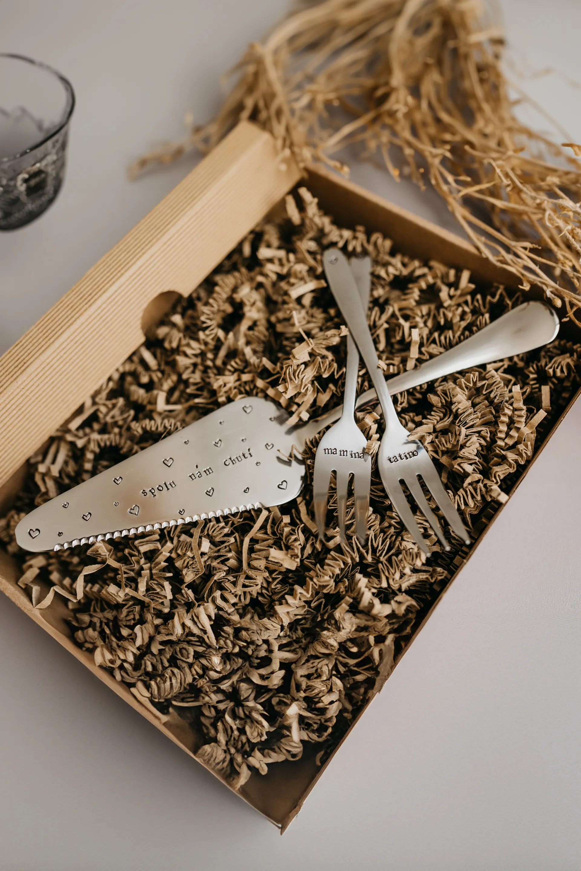 Sada tortovej lopatky a vidličiek s ručne vyrazenými textami. Na tortovej lopatke je ručne vyrazený text "spolu nám chutí" pričom po celej naberacej ploche sú vyrazené srdiečka. Srdiečka sú vyrazené náhodne po celej ploche. Na prvej vidličke je ručne vyrazený text "mamina" a na druhej vidličke je ručne vyrazený text "tatino". Na oboch vidličkách je ešte ručne vyrazený symbol srdiečka.