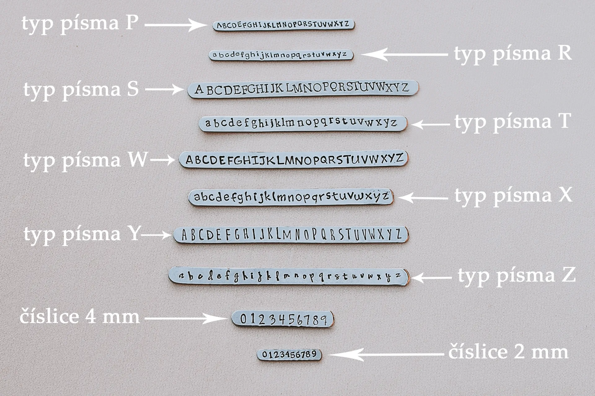 Pri objednávke si viete zvoliť iba jeden typ písma, na prívesok vám ale samozrejme môžeme vyraziť akékoľvek kombinácie nami ponúkaných typov písma.