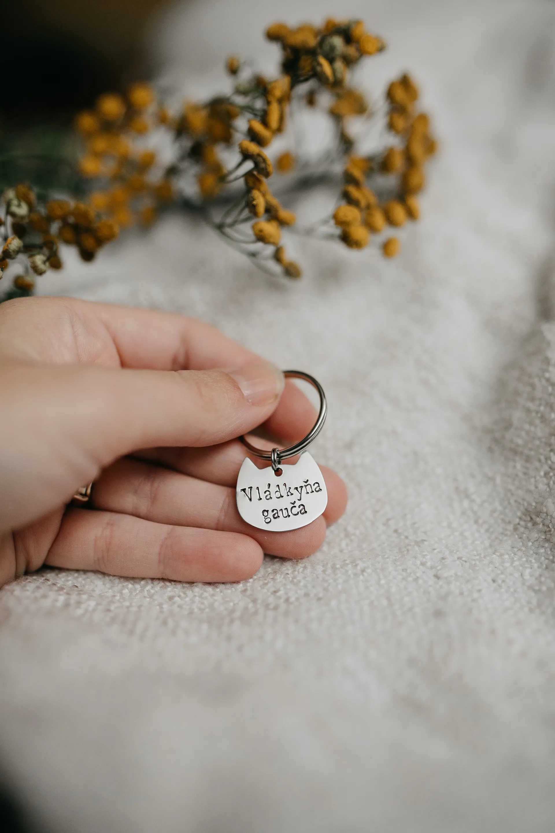 Štítok pre psa/mačku vyrobený z nerezovej ocele striebornej farby s ručne vyrazeným textom : "Vládkyňa gauča".