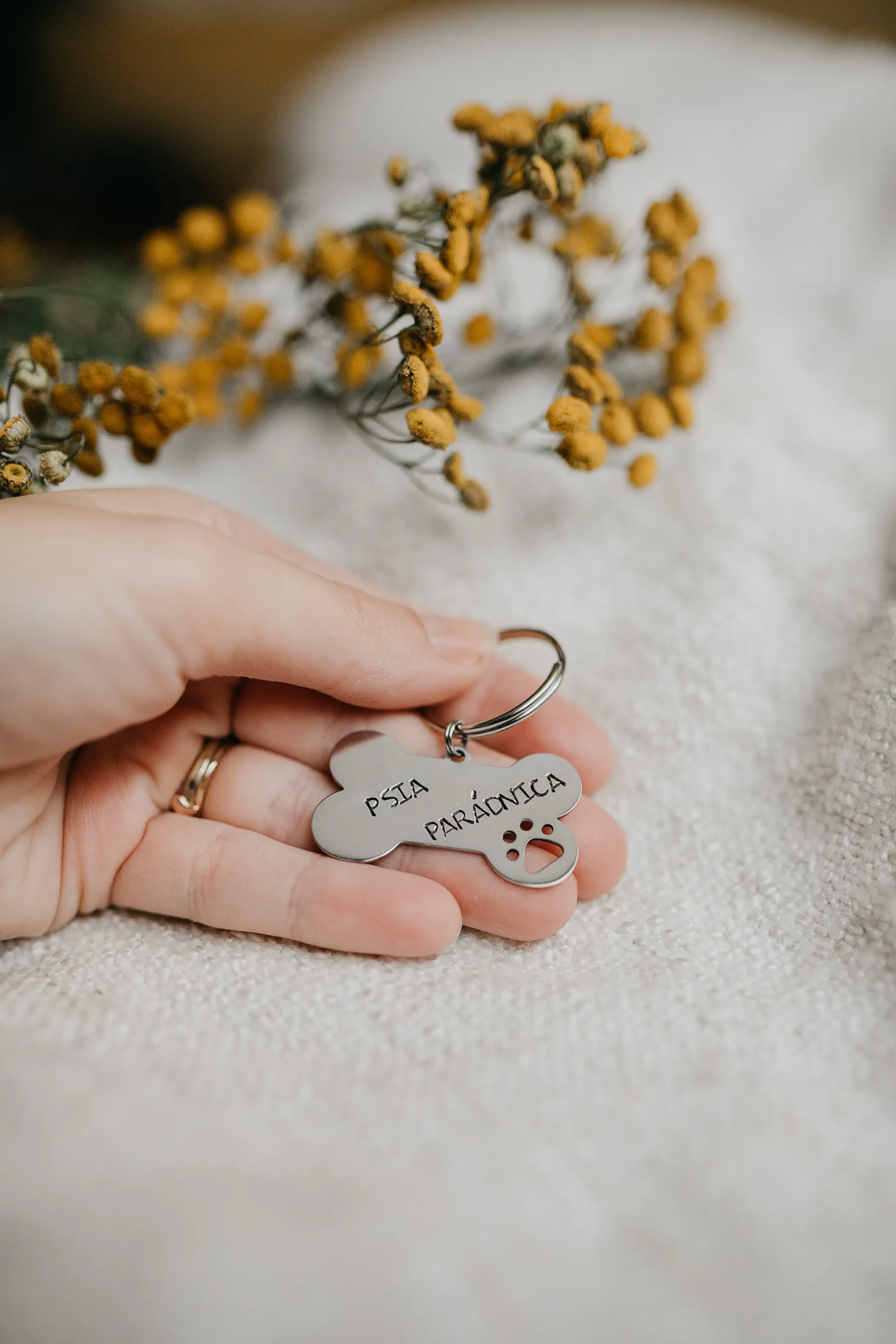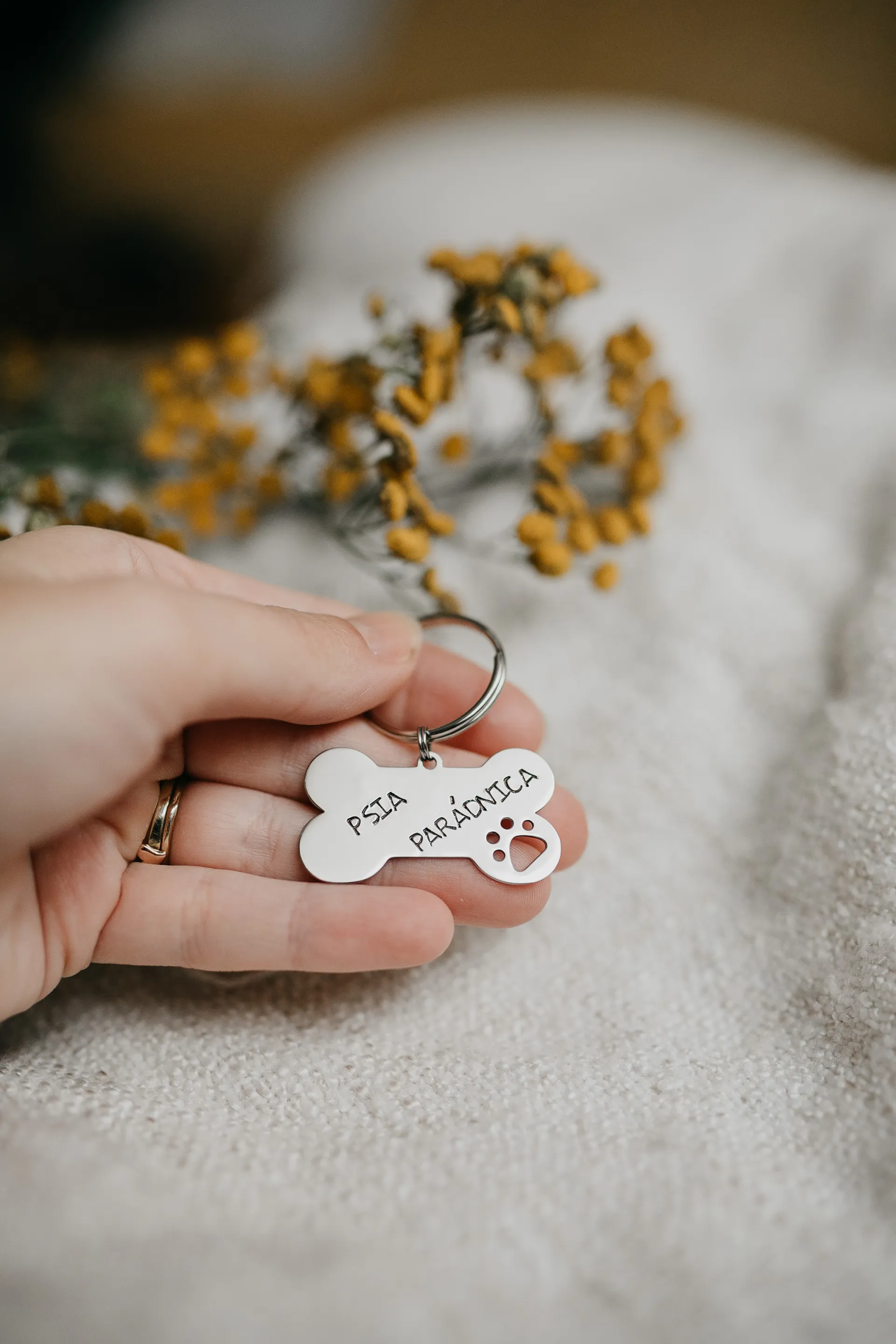 Prívesok /štítok pre psa vyrobený z nerezovej ocele striebornej farby s ručne vyrazeným textom :"Psia parádnica".