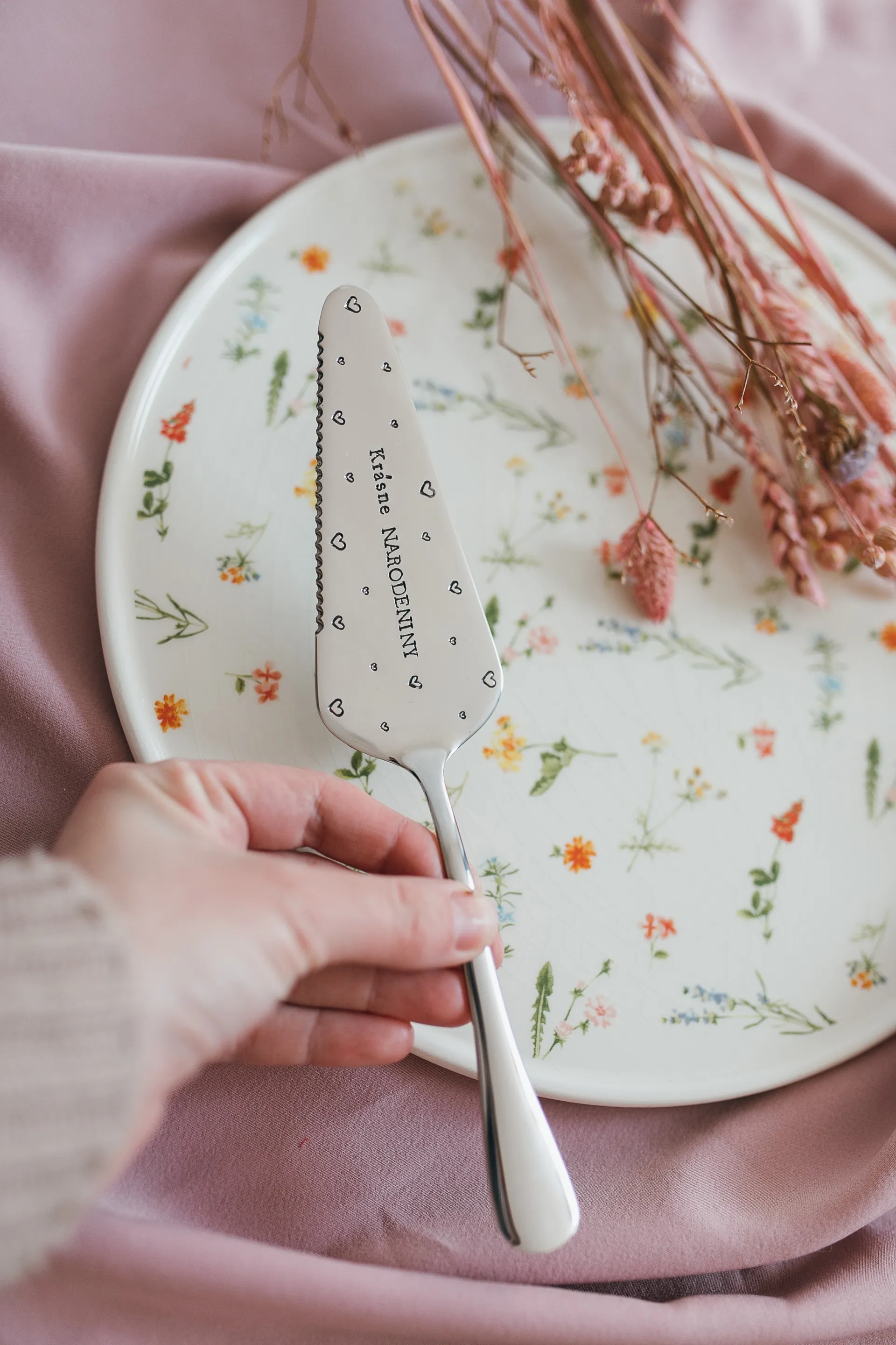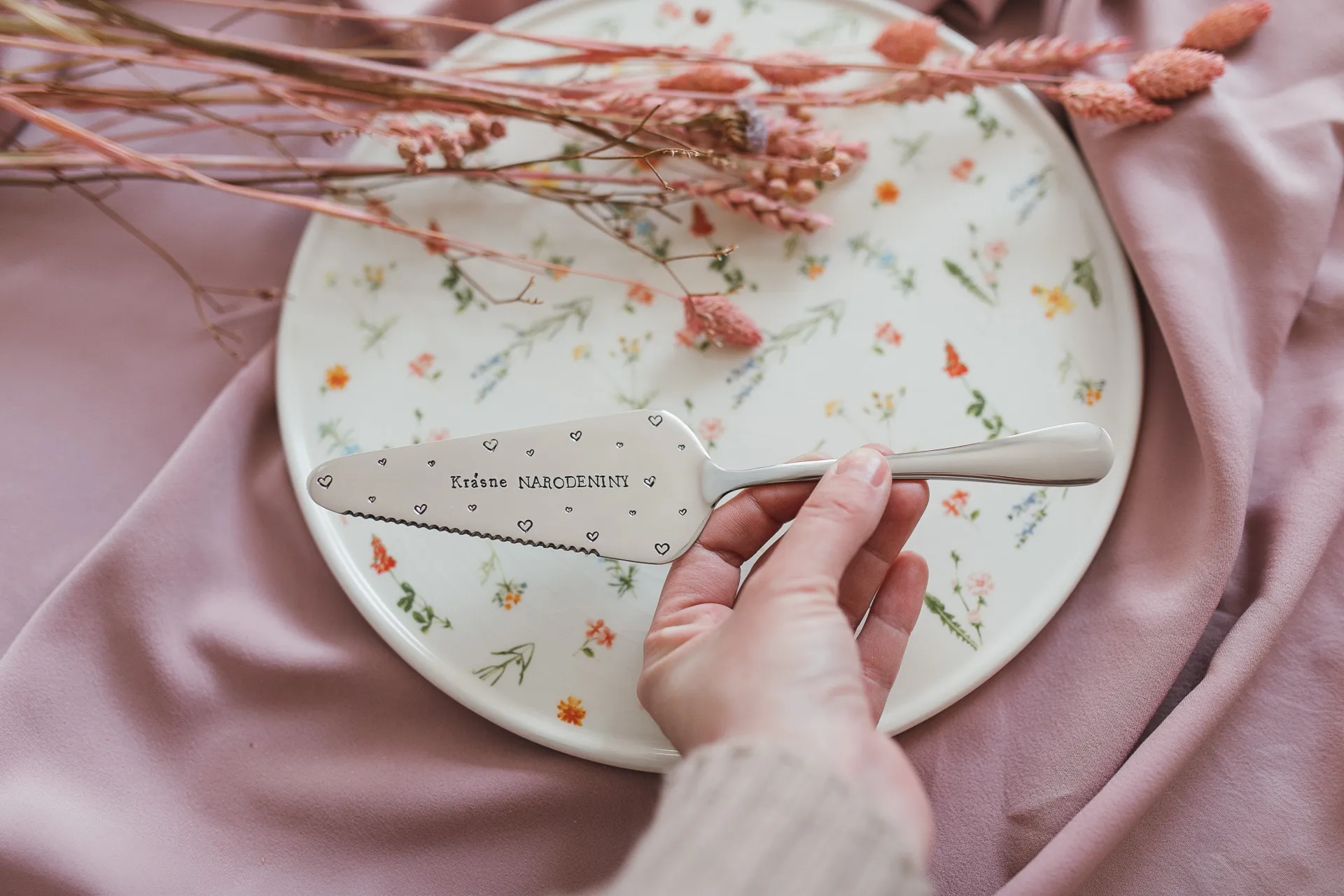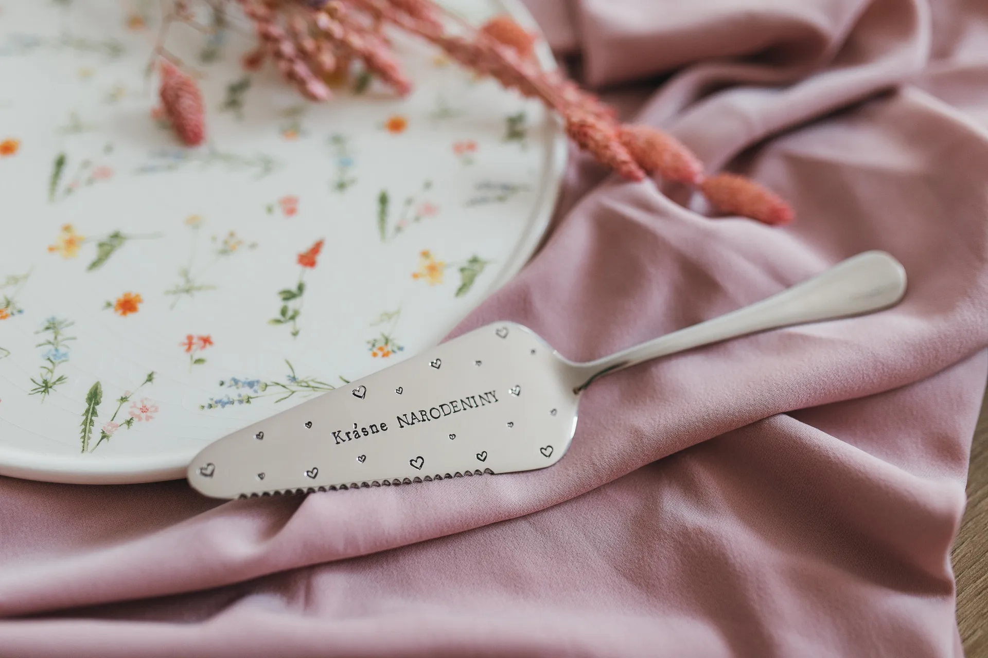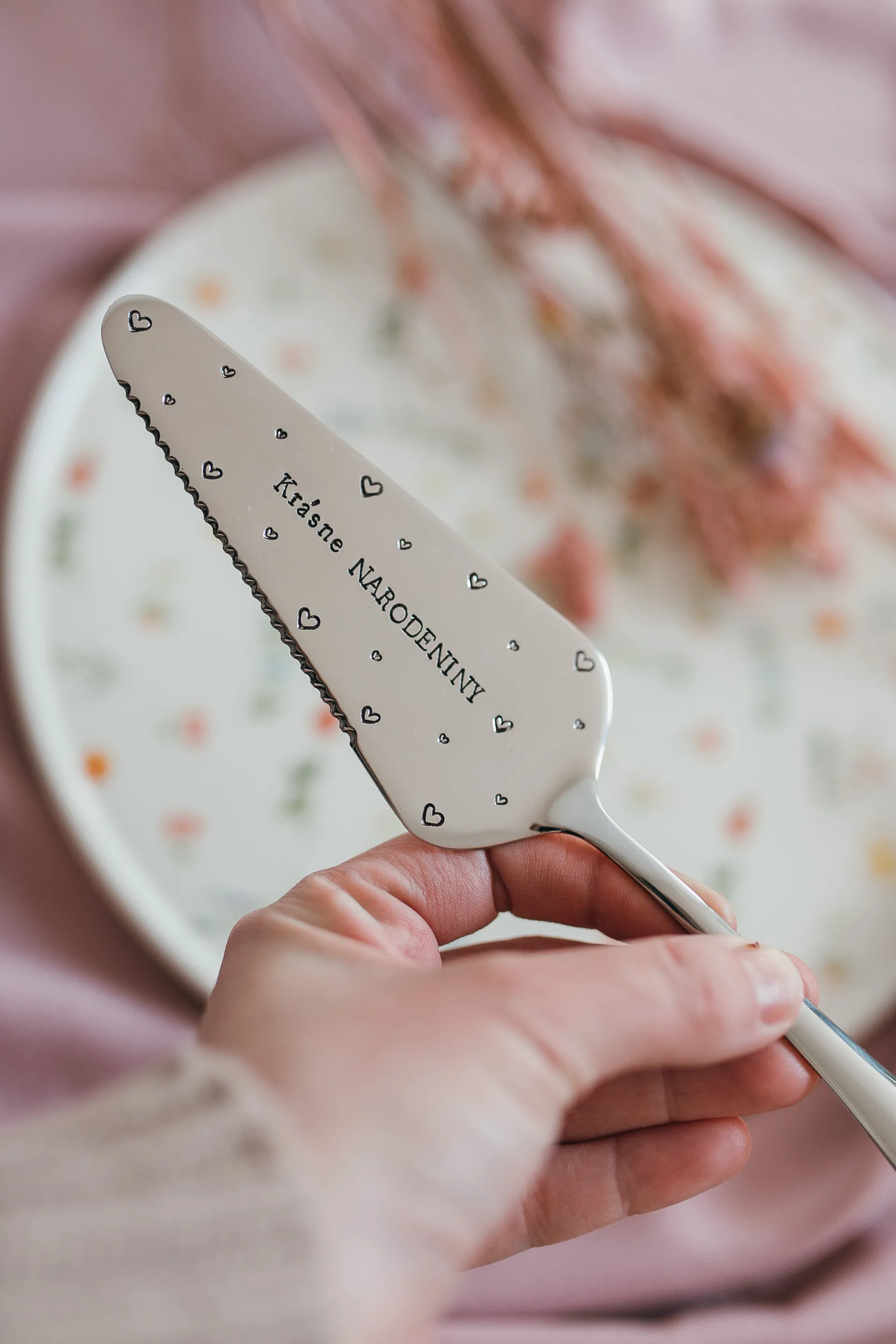 Tortová lopatka vyrobená z ocele s ručne vyrazeným textom v naberacej časti " Krásne narodeniny" a náhodne umiestnenými vyrazenými srdiečkami po celej ploche lopatky. Text je vyrazený v strednej naberacej časti tortovej lopatky. Tortová lopatka má jednu hranu naberacej časti zúbkovanú, z tohto dôvodu treba s lopatkou zaobchádzať opatrne.