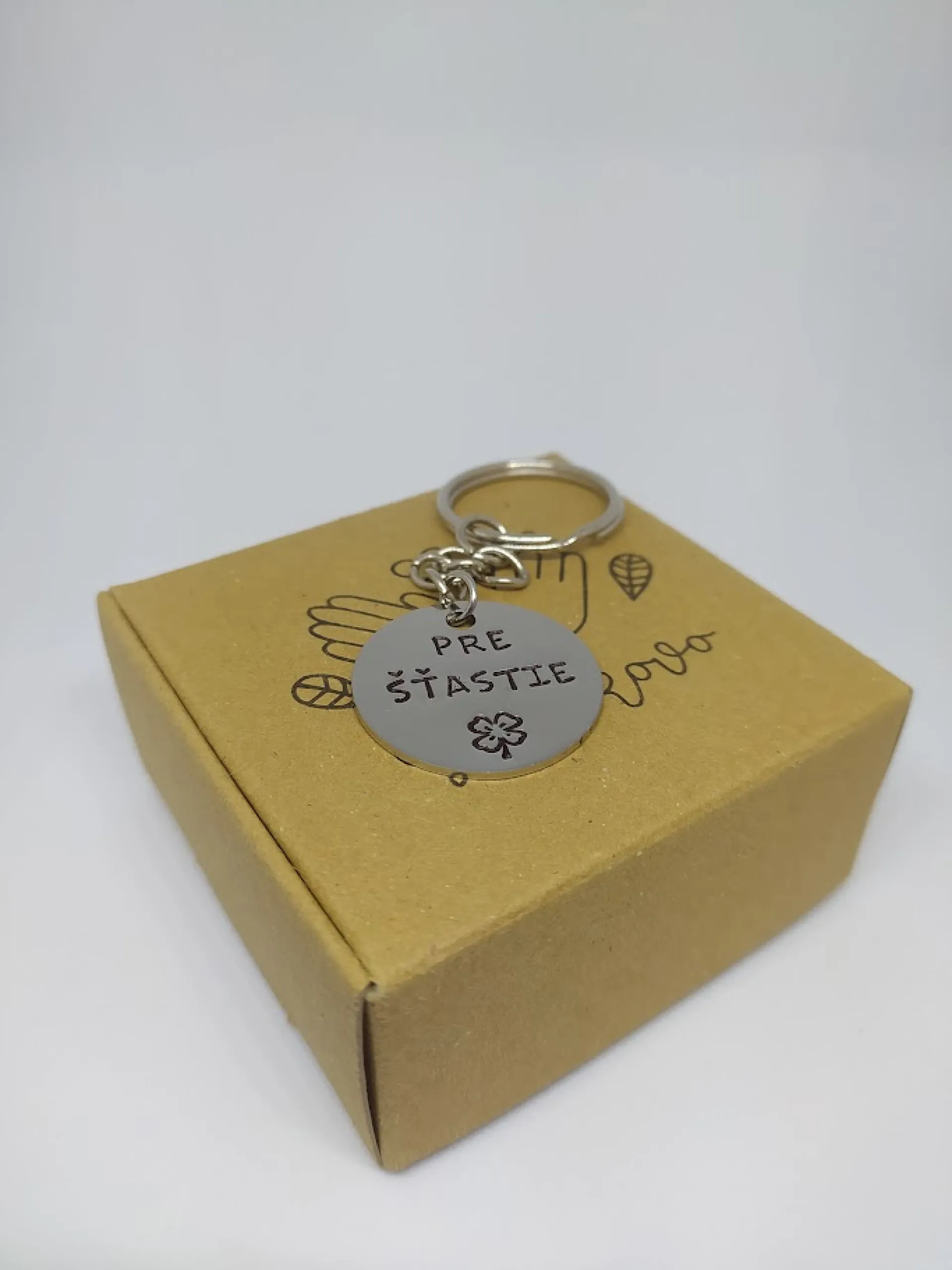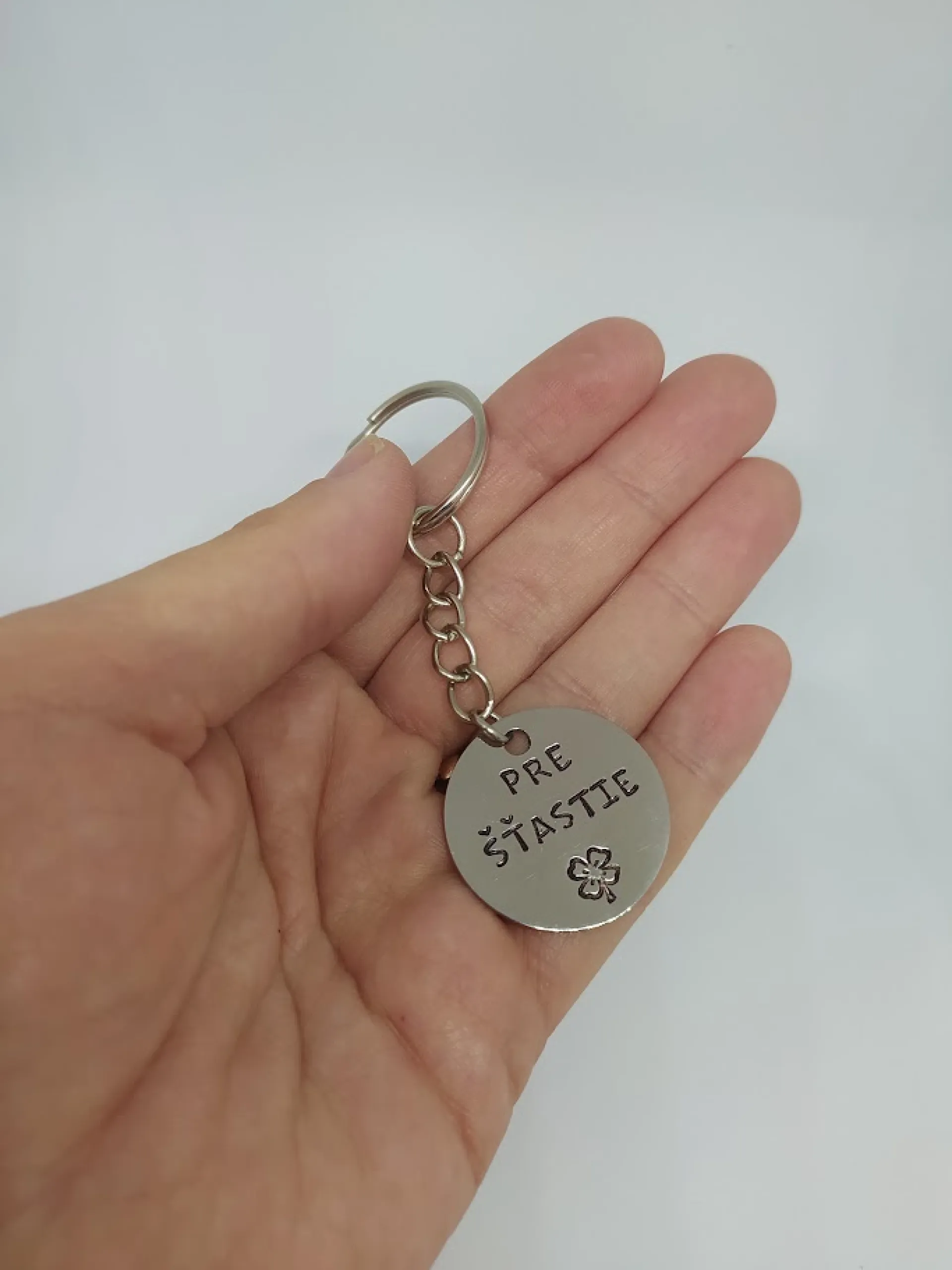 Prívesok na kľúče vyrobený z nerezovej ocele striebornej farby s ručne vyrazeným textom:"Pre šťastie " .Chybičkou krásy sú škrabance okolo písmena "A".