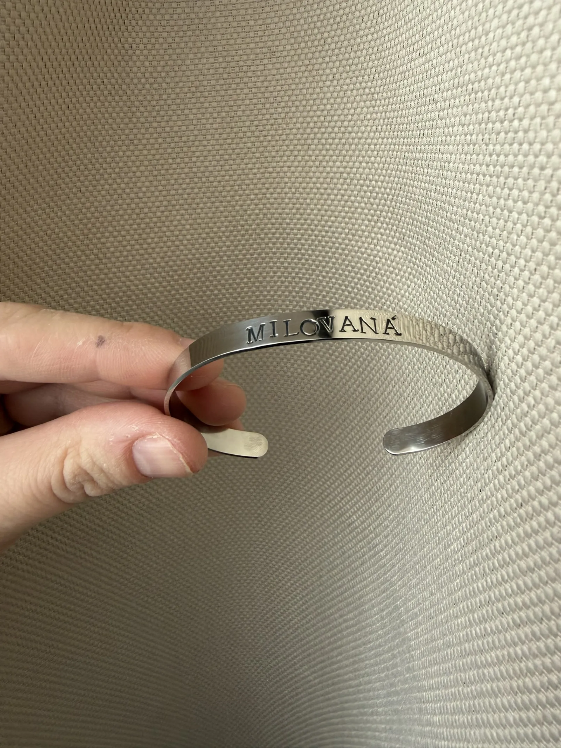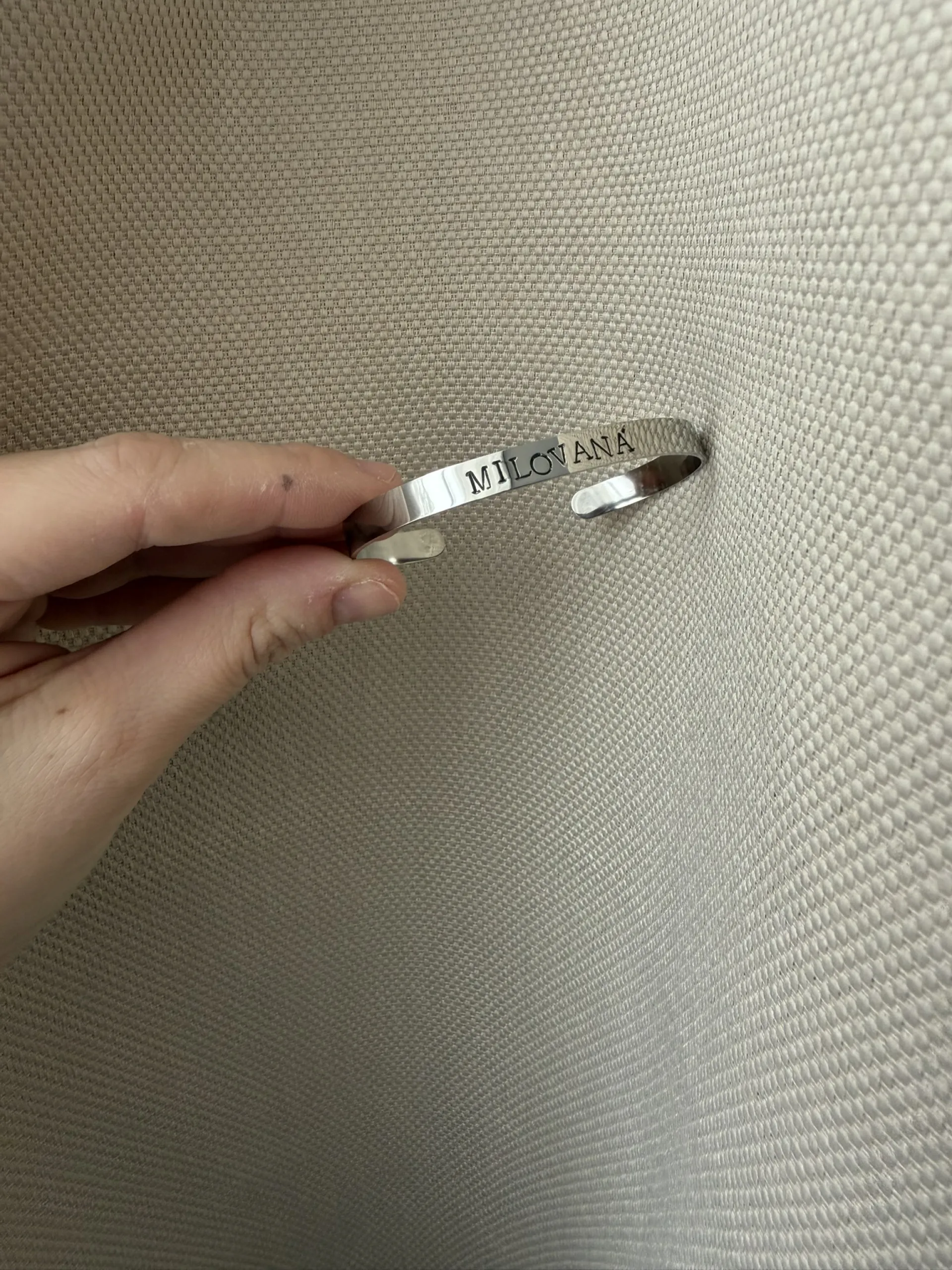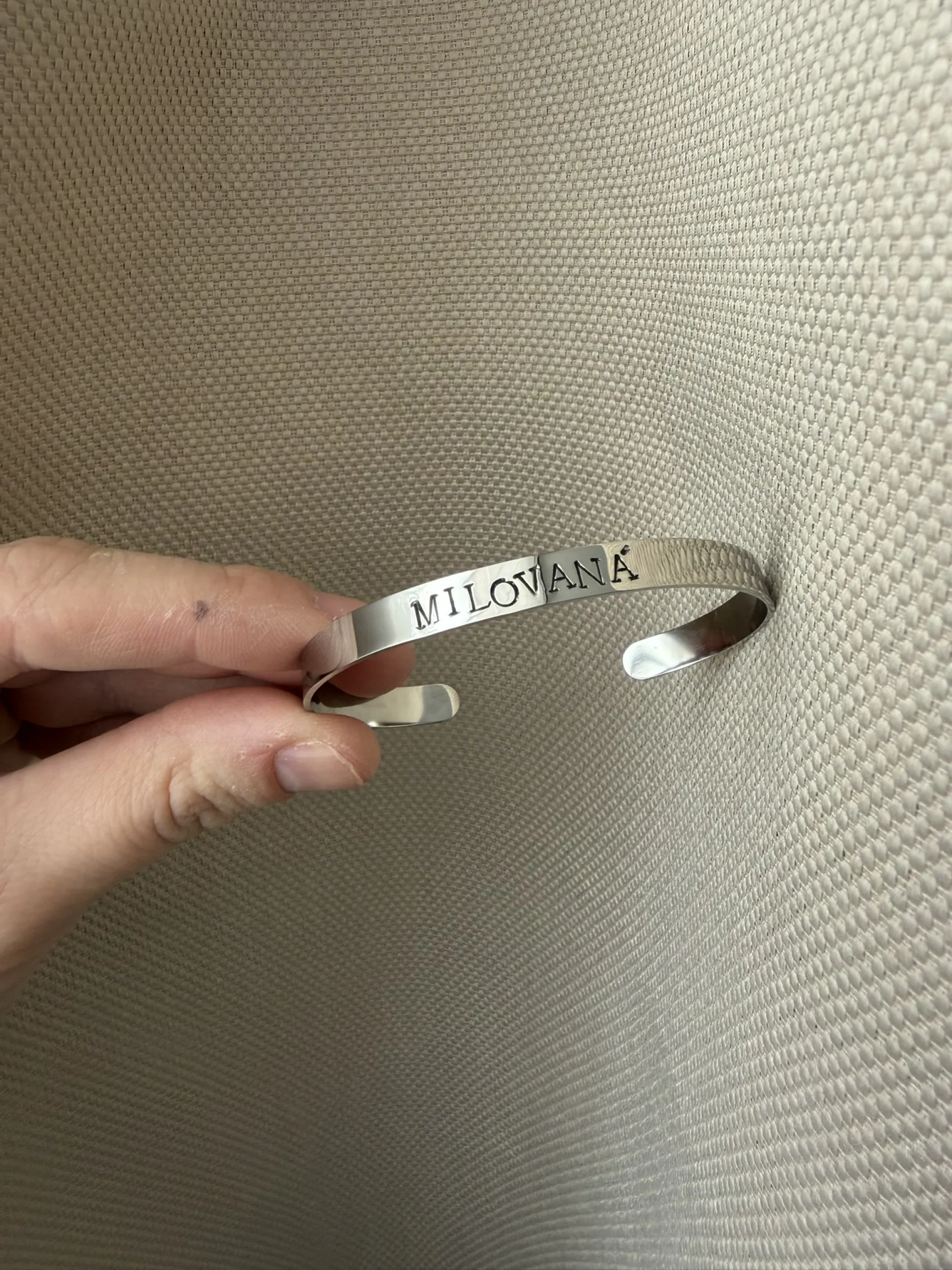Náramok z materiálu oceľ s ručne vyrazeným textom "MILOVANÁ". Text je ručne vyrazený na prednej strane náramku v strednej časti.