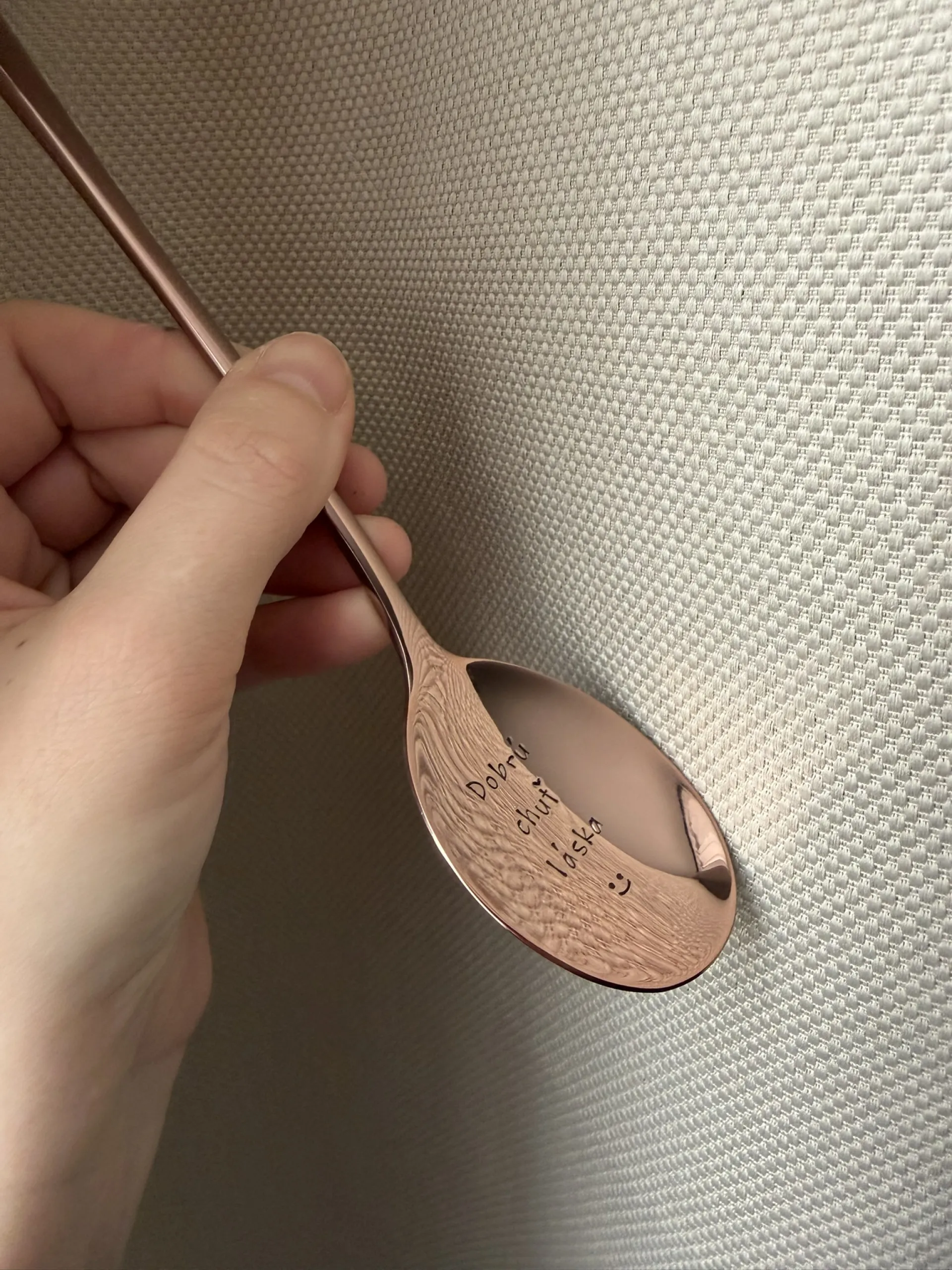 Polievková lyžica medenej farby s ručne vyrazeným textom v naberacej časti  "Dobrú chuť láska" so smajlíkom pod textom.